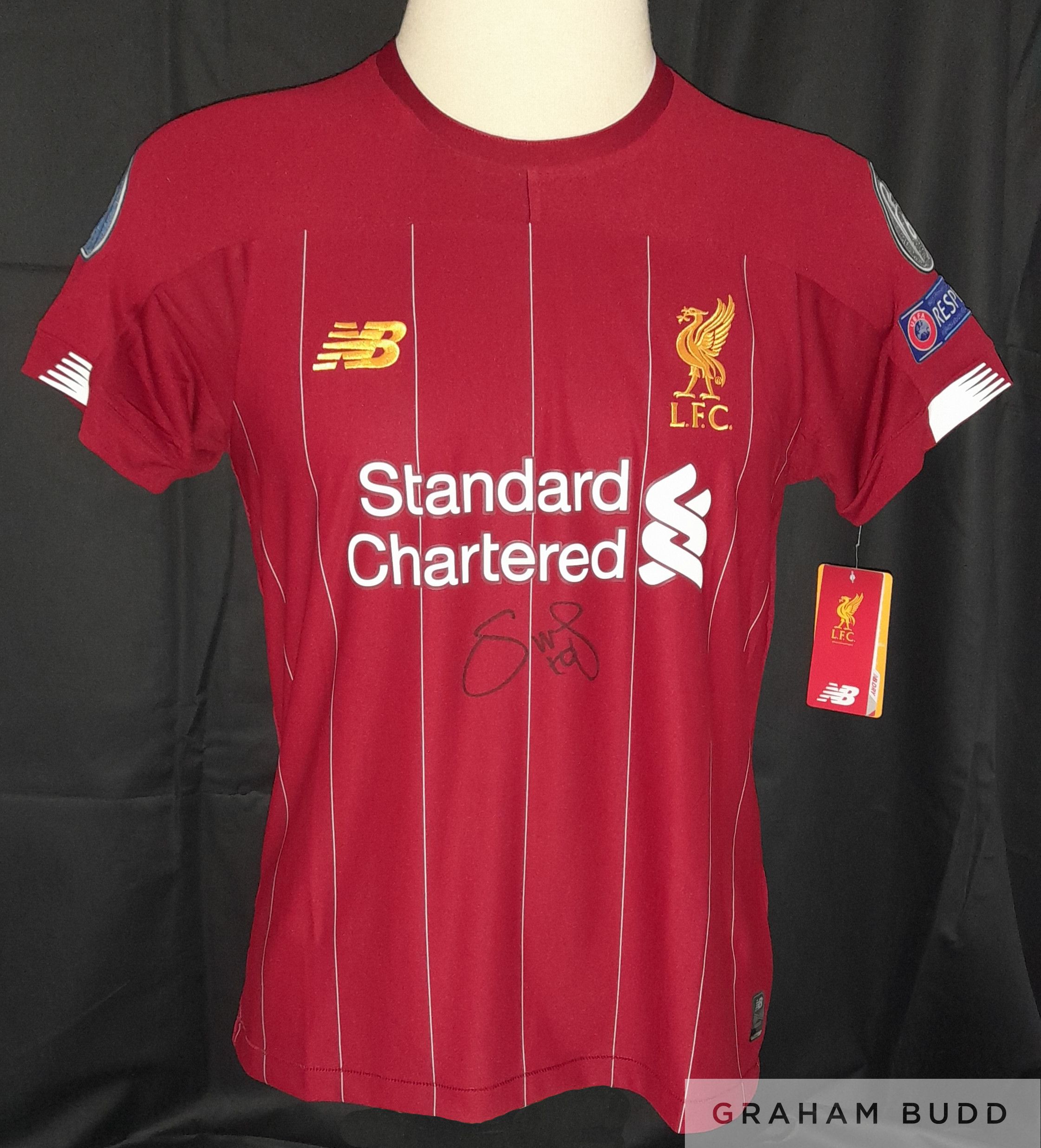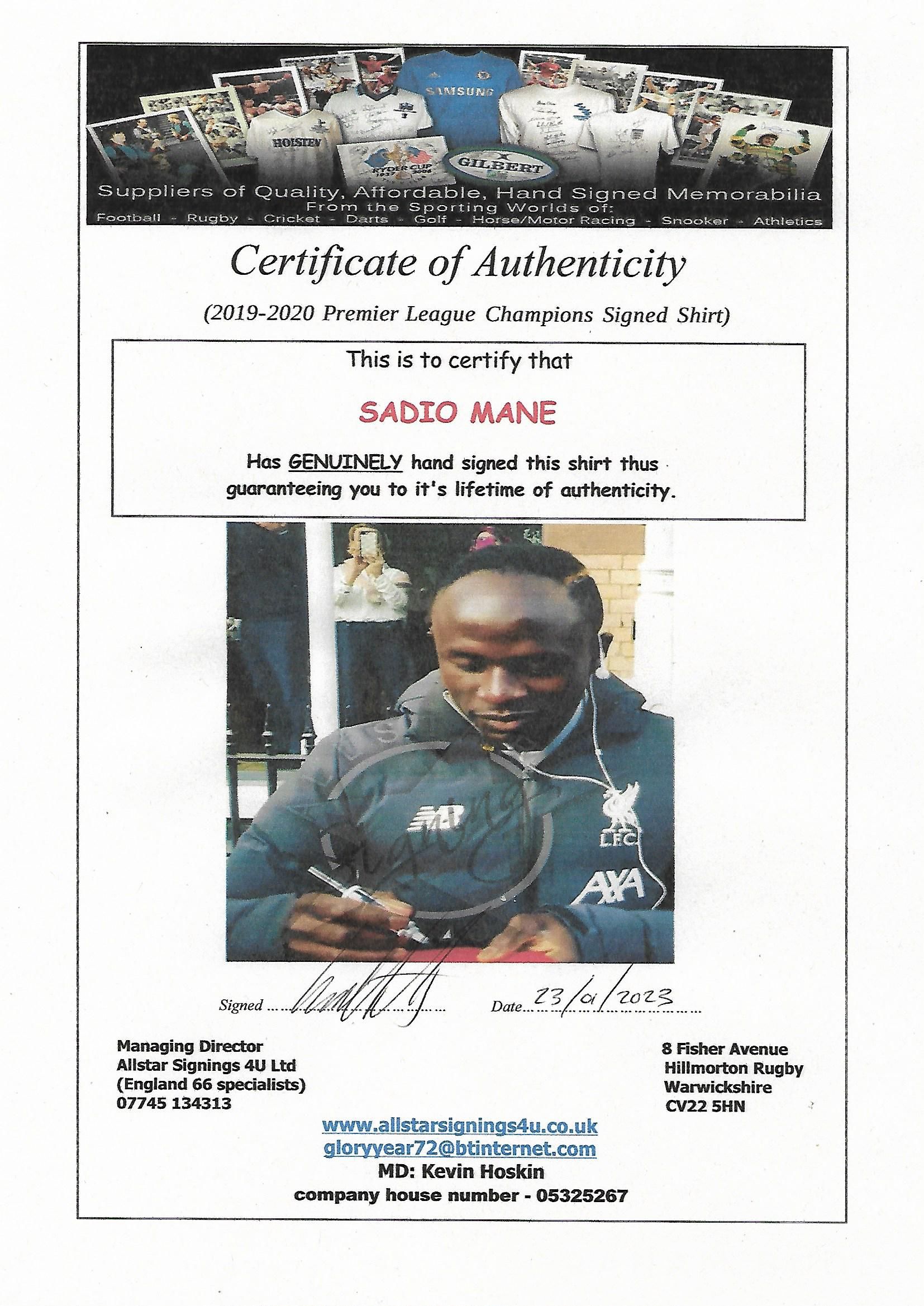 Sadio Mane signed Liverpool 2019-20 Premier League season winning jersey, brand new official Liverpool FC merchandise with tags still attached, autographed by Mane to front below shirt sponsor boldly and neatly, shirt has 6 x European Cup/Champions League winners, UEFA Respect and current 2019 Champions League holders patches across both arms and comes with COA and photograph proof