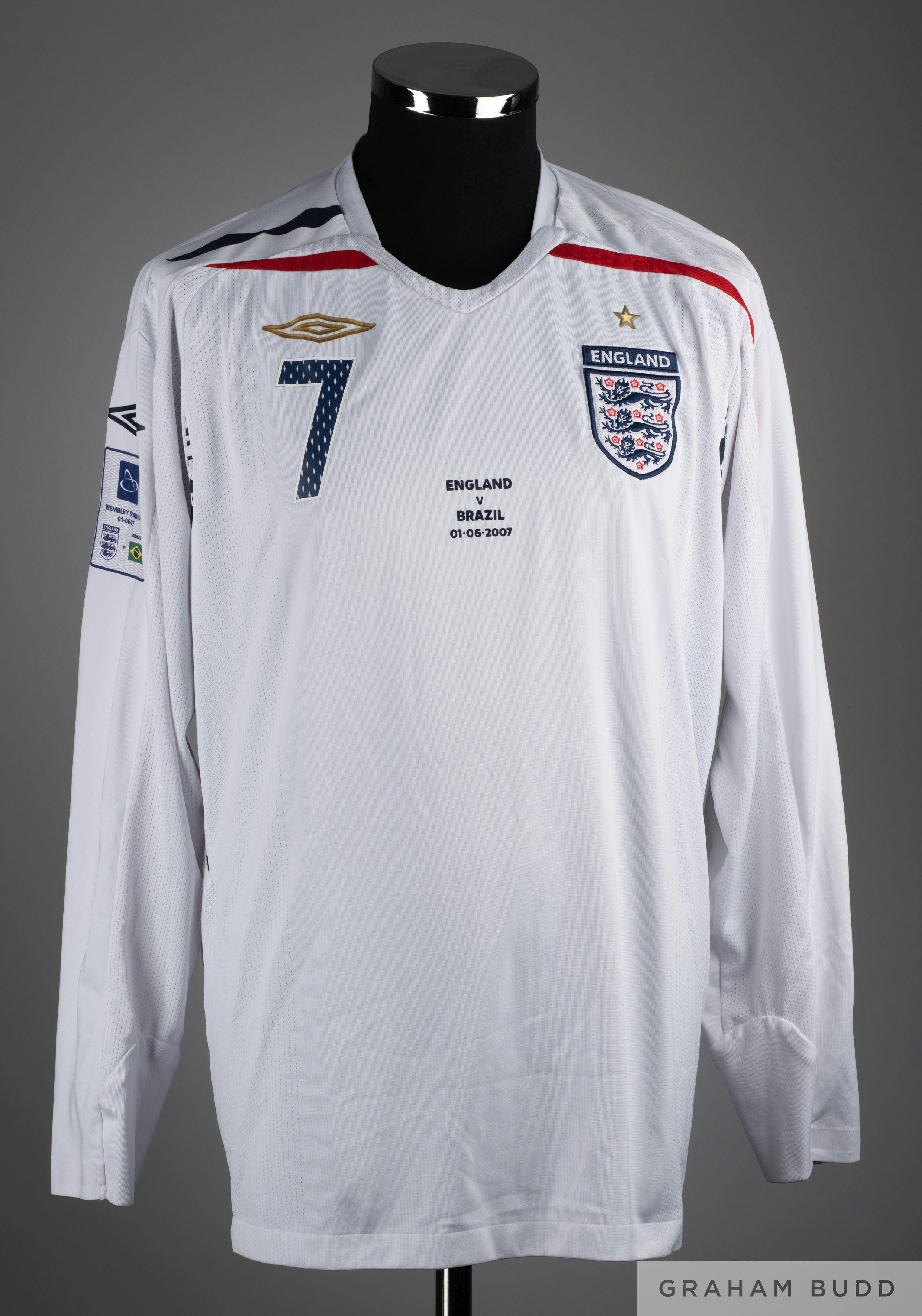 David Beckham white No.7 England v. Brazil spare International long-sleeved shirt, 2007, Umbro, XL, with v-neck collar and embroidered three lion badge inscribed ENGLAND, with England v. Brazil 01.06.2007 decal, the reverse lettered BECKHAM, the right sleeve with Wembley Stadium 01-06-07, England v. Brazil flash In the friendly match played on 1st June 2007 at Wembley, England drew the match 1-1