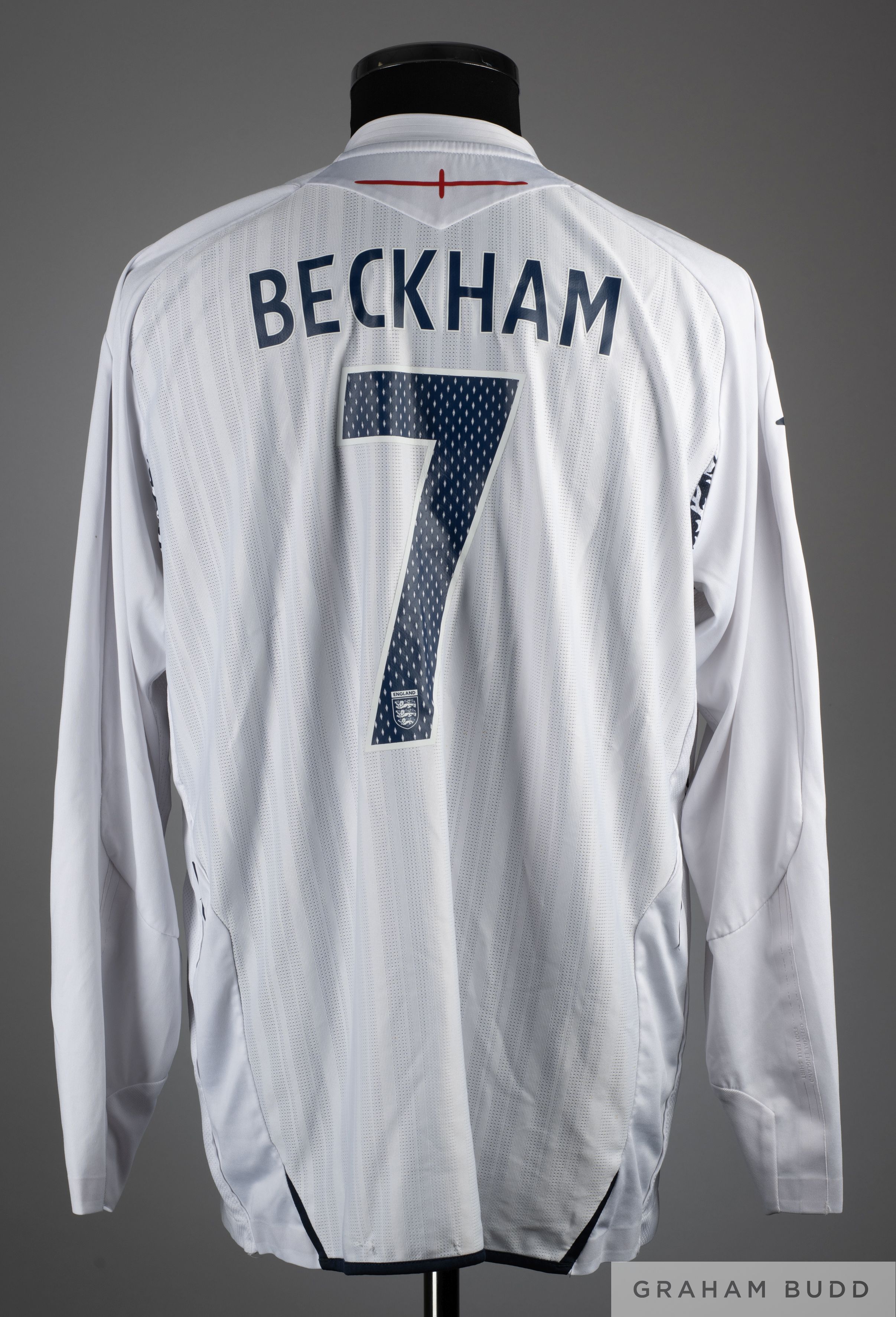 David Beckham white No.7 England v. Brazil spare International long-sleeved shirt, 2007, Umbro, XL, with v-neck collar and embroidered three lion ba