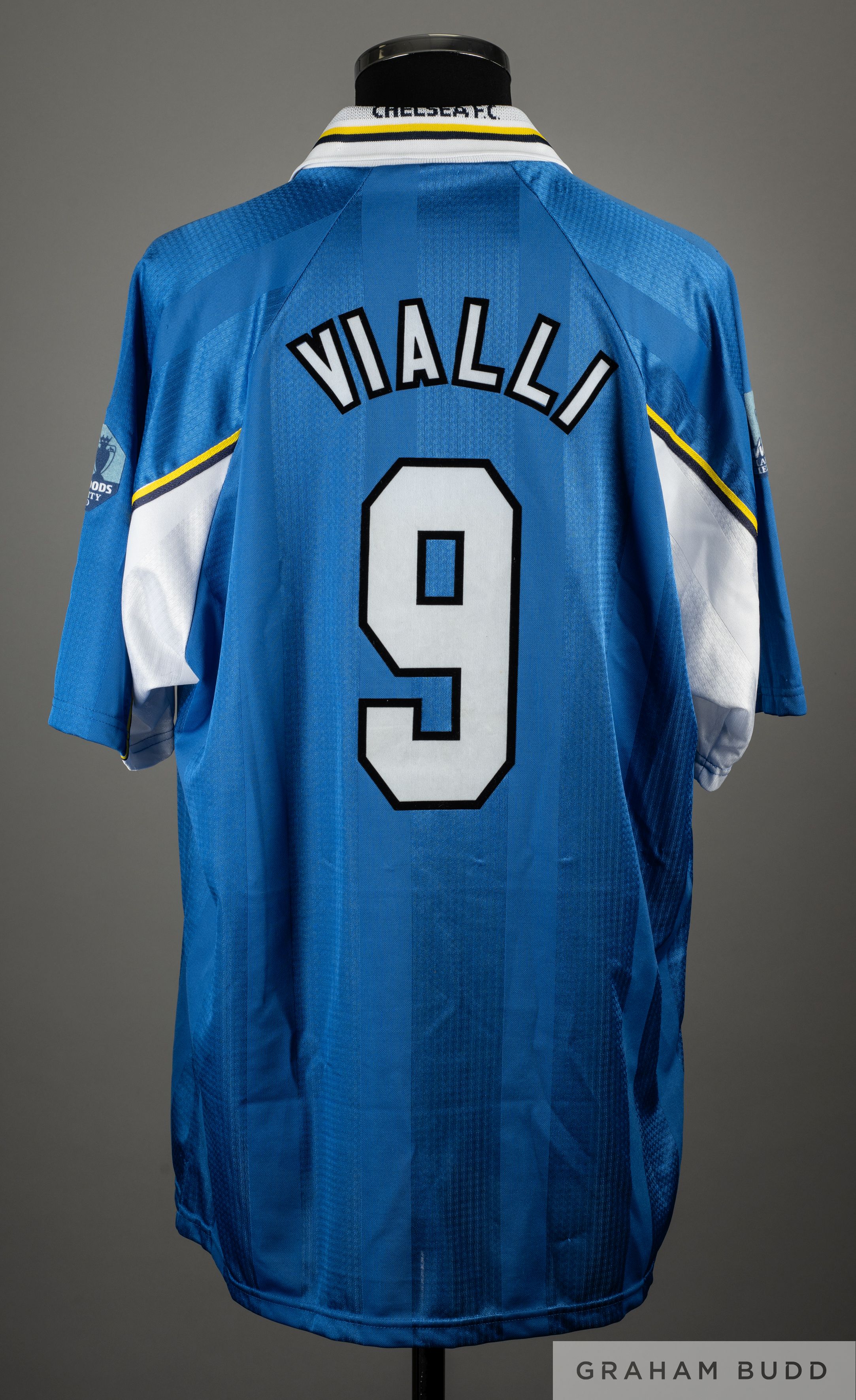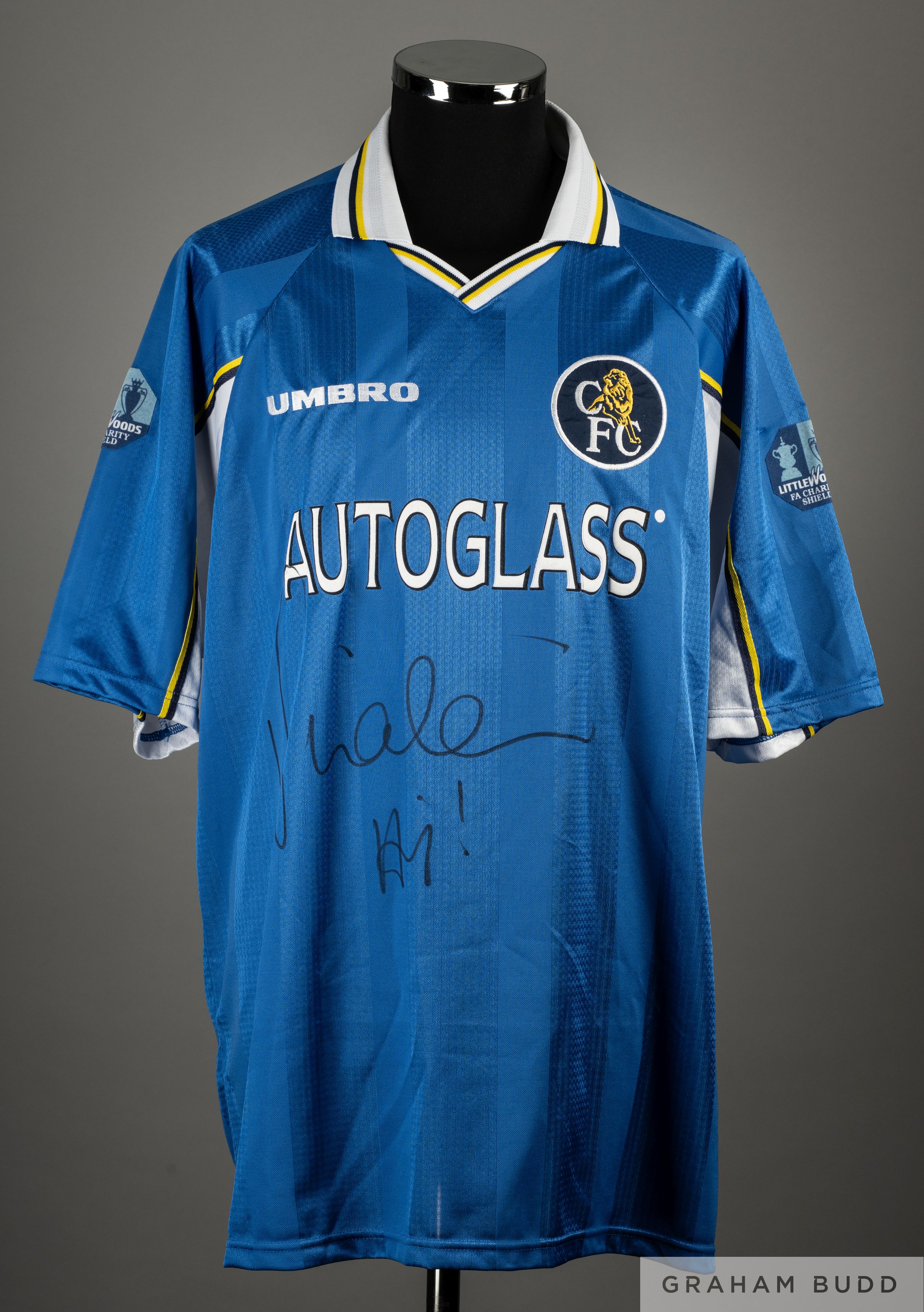 Gianluca Vialli blue No.9 Chelsea v. Manchester United 1997 Charity Shield match worn/issued short-sleeved shirt, Umbro, XXL, with v-neck collar and embroidered cloth badge inscribed CFC,the front of the shirt also autographed by Vialli, the reverse lettered VIALLI, the sleeves with Littlewoods FA Charity Shield flashes In the match played on 3rd August 1997 at Wembley, Manchester United defeated Chelsea 4-2 on penalties, the match ending 1-1 after extra time