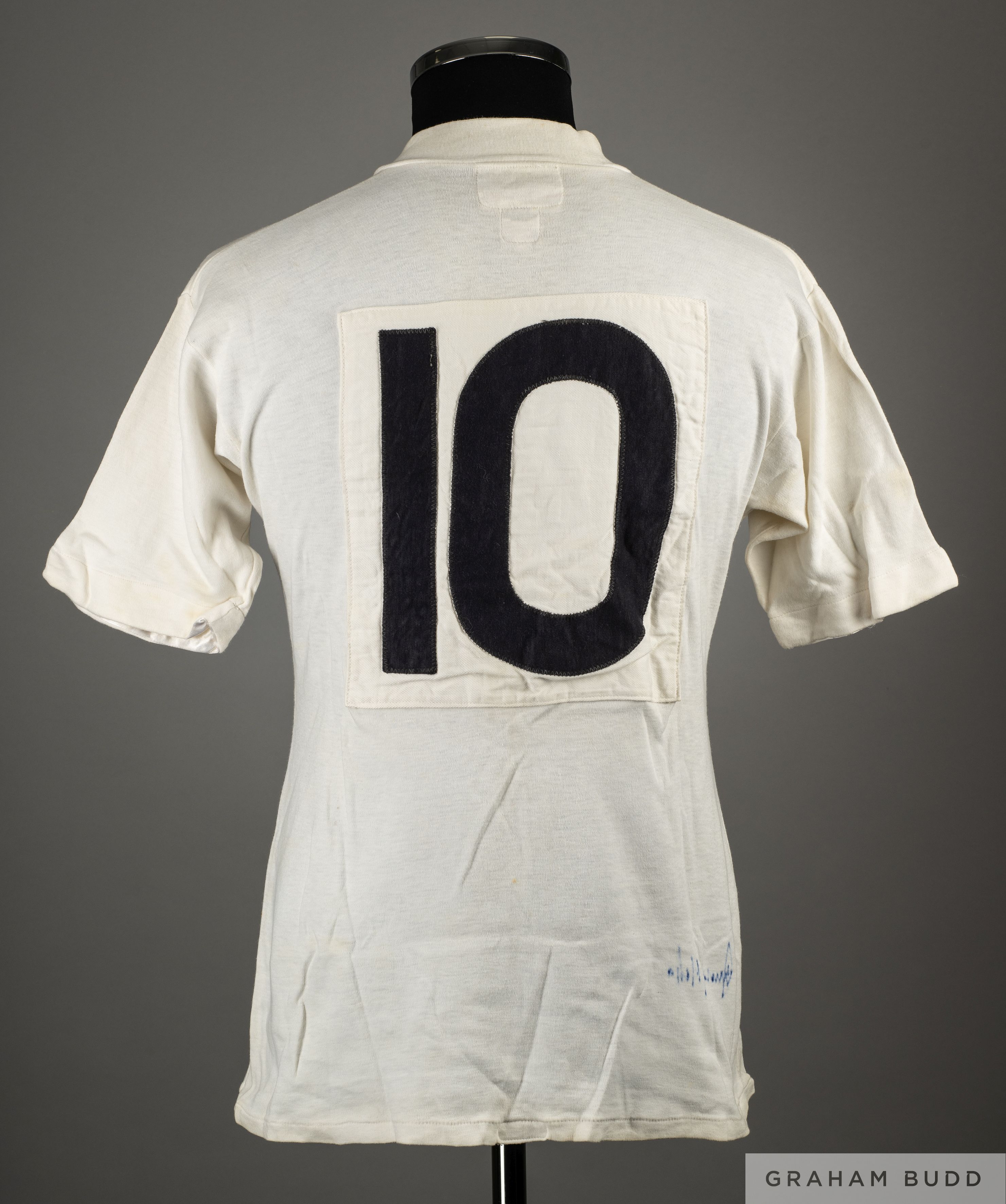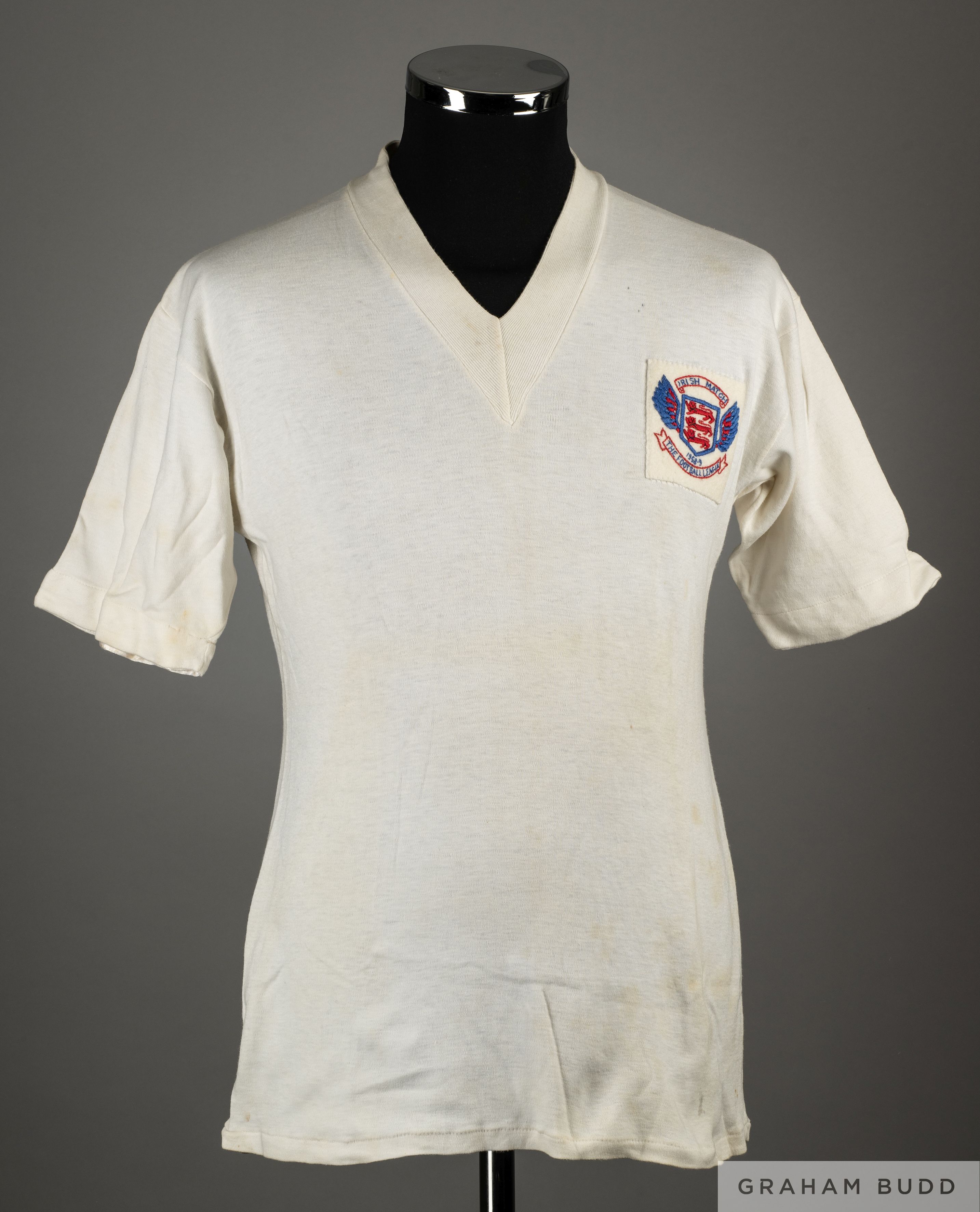 White No.10 Football League v. Irish Football League match worn short-sleeved shirt, 1958, Umbro, 38, with v-neck collar and embroidered cloth badge inscribed, IRISH MATCH, 1958-9, THE FOOTBALL LEAGUE, the interior of the shirt autographed by Jimmy Melia Some discoloration and staining due to age It is believed that the above shirt was worn by Johnny Haynes and gifted to Jimmy Melia. In the match played on 12th November 1958 at Anfield, the match ending in a 5-2 victory for the Football League, Haynes scoring 1 goal.