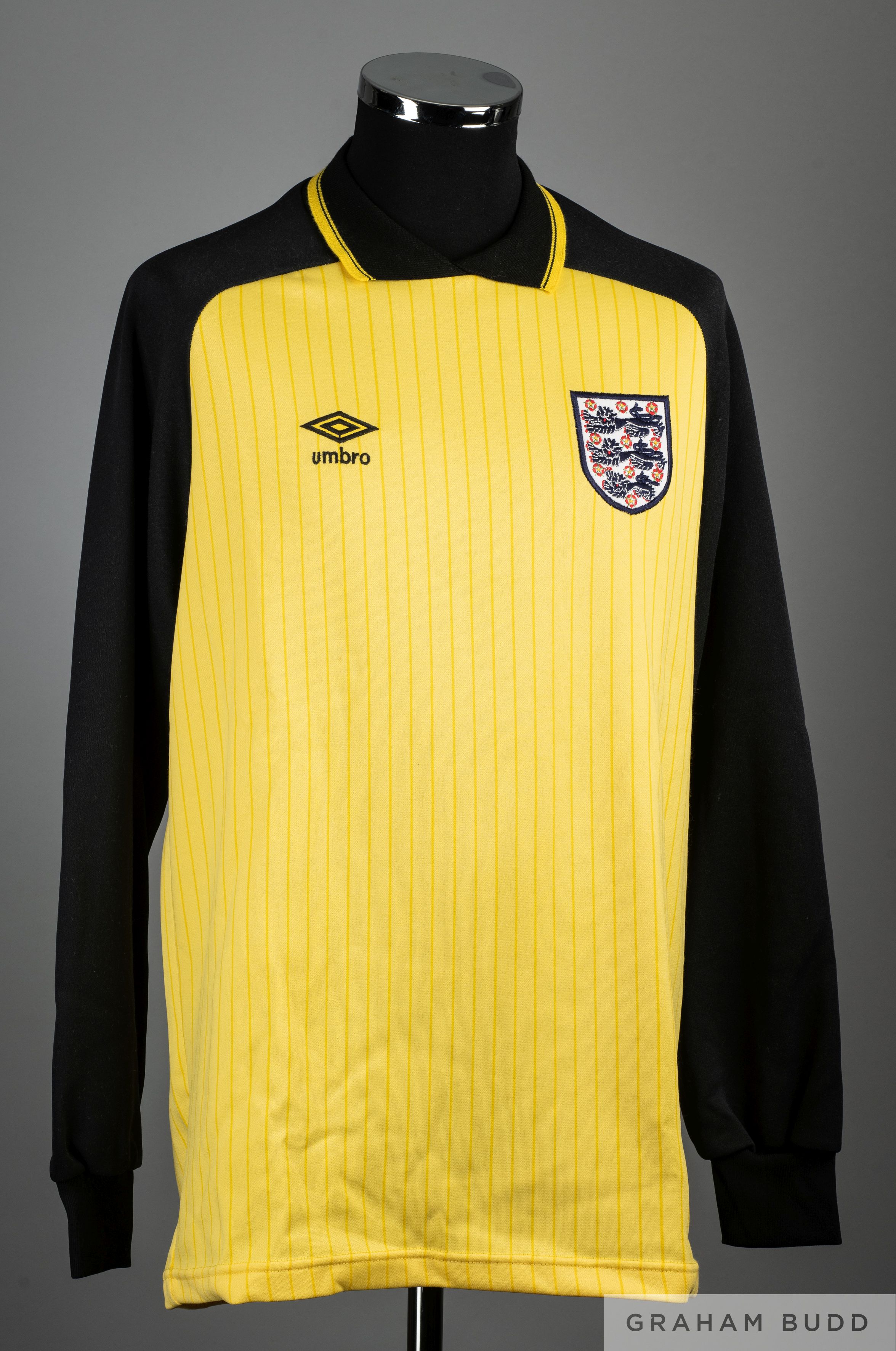 Peter Shilton yellow No.1 England International match worn goalkeepers shirt, 1984-86, Umbro, L, with crew-neck collar and embroidered three lion cloth badge, the interior of the collar autographed by Peter Shilton PROVENANCE: The Peter Shilton Collection