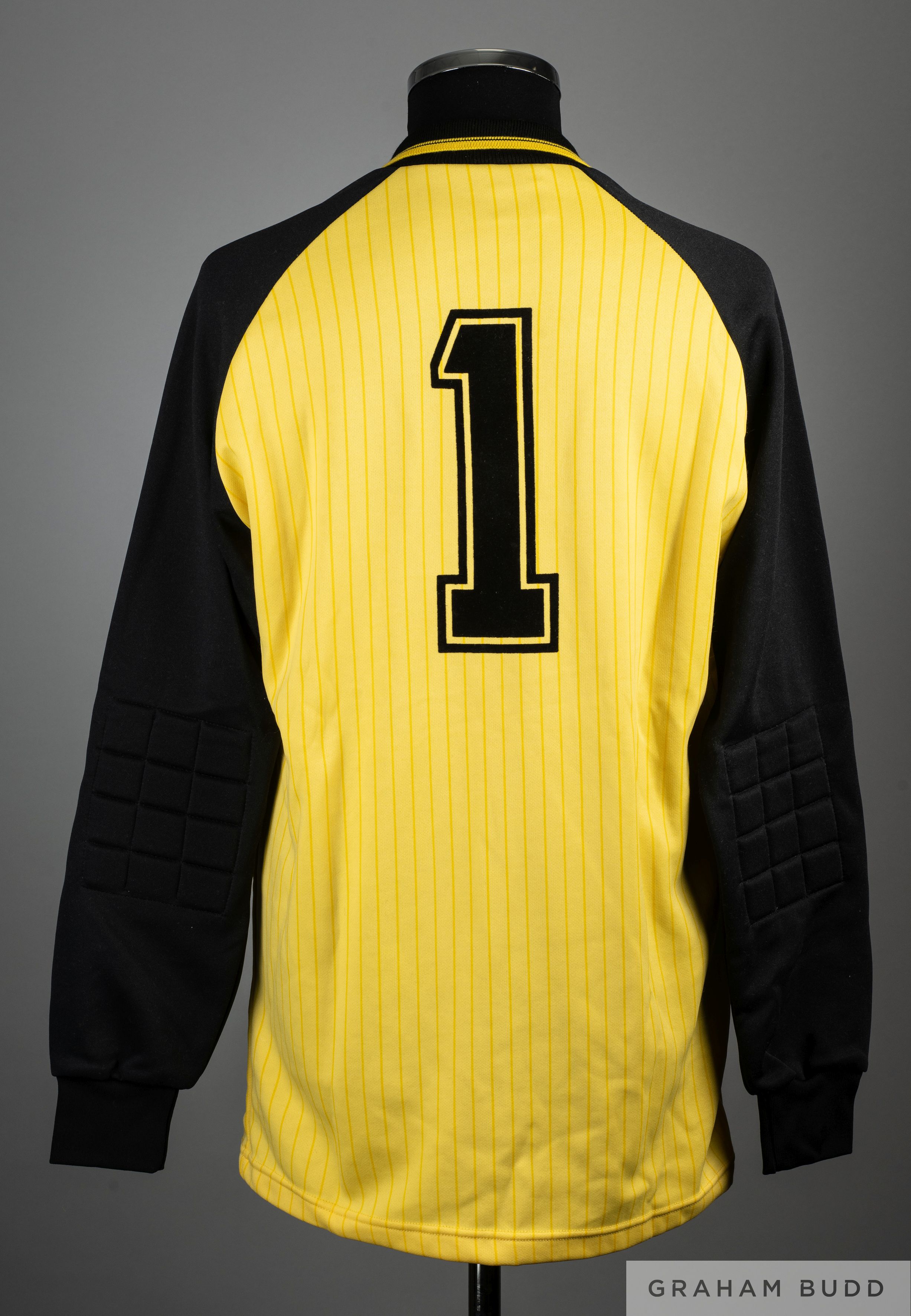 Peter Shilton yellow No.1 England International match worn goalkeepers shirt, 1984-86, Umbro, L, with crew-neck collar and embroidered three lion cl