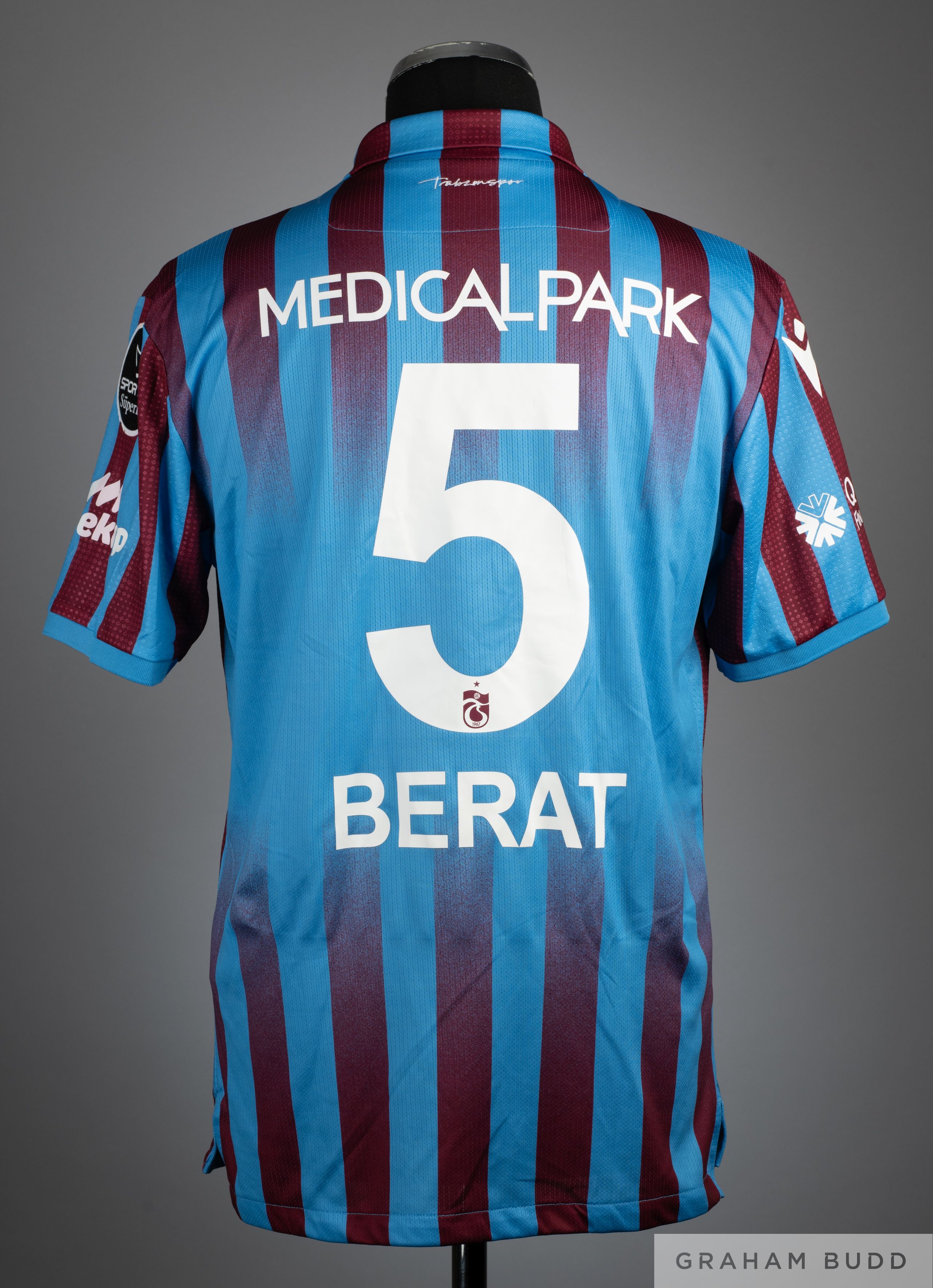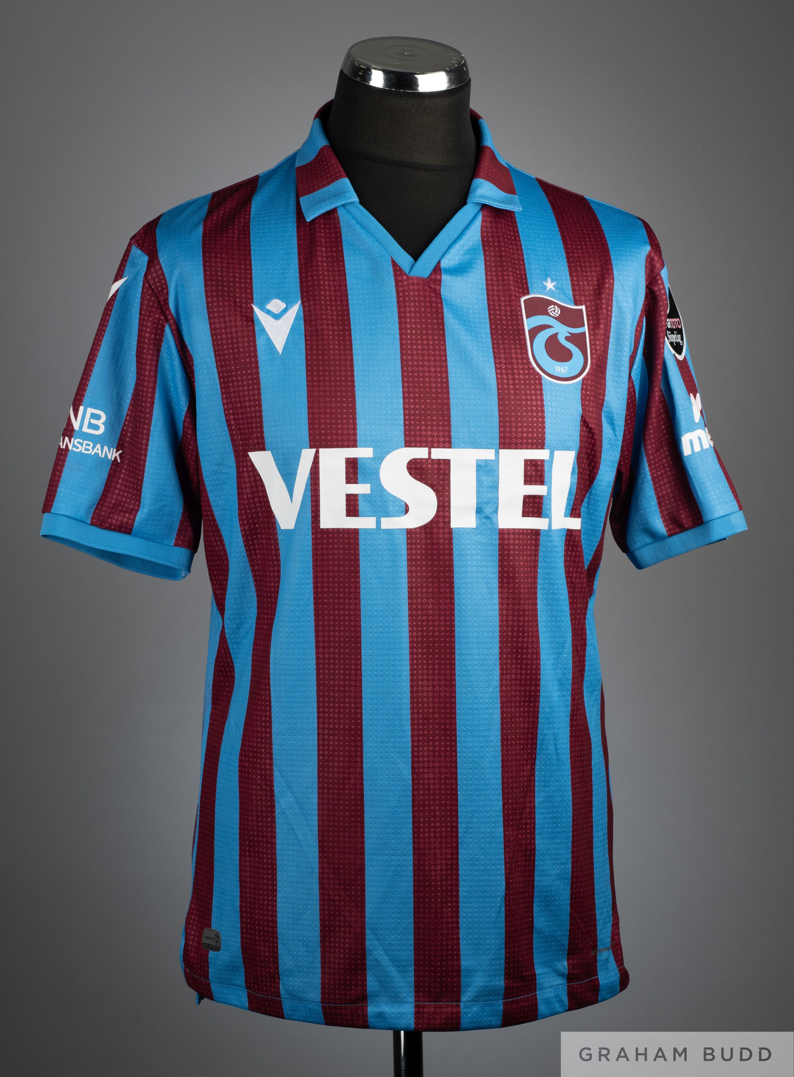 Berat Ozdemir claret and blue No.5 Trabzonspor short-sleeved shirt, 2021-22, Macron, XL, with v-neck collar and embroidered badge inscribed TS 1967, the revers lettered BERAT, the left sleeve with SuperLig flash, with COA from Agostino Alessio who was Roberto Mancini 's masseur - physiotherapist and worked with him at Lazio, Inter, Galatasaray and Manchester City (2)