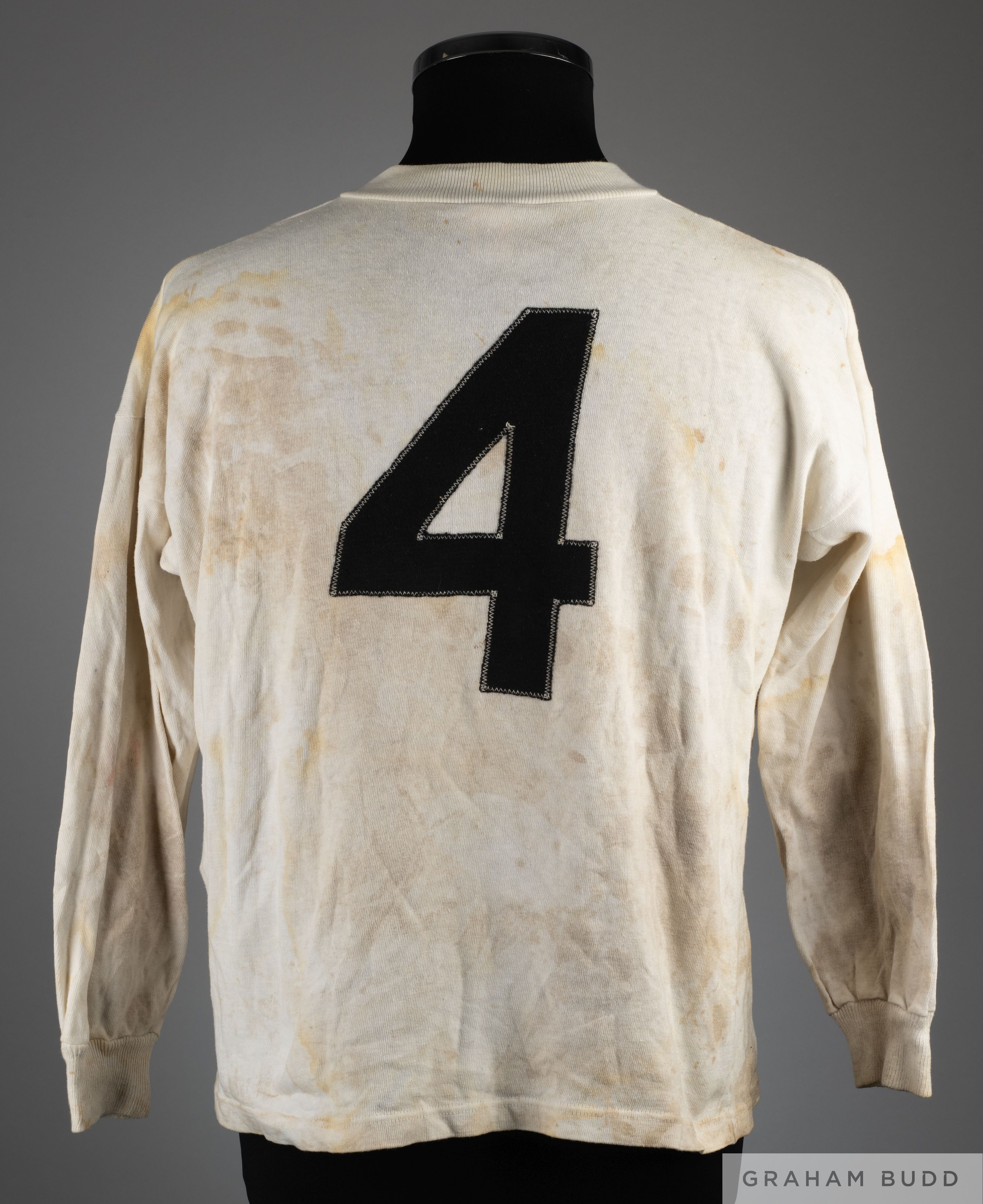 Norbet Hof white No.4 Austria v. Italy International long-sleeved shirt, 1970 with v-neck collar and embroidered cloth badge, large areas of staining front and back The above shirt was worn by Norbet Hof in the UEFA European Championship, Group 6 match against Italy played on 31st October 1970, the match ending in a 2-1 victory for Italy, the shirt was gained by Italian International football legend Sandro Mazzola as a swap after the match Please note that the above shirt was worn by Norbet Hof in the Italy match and not August Starek as initially catalogued.