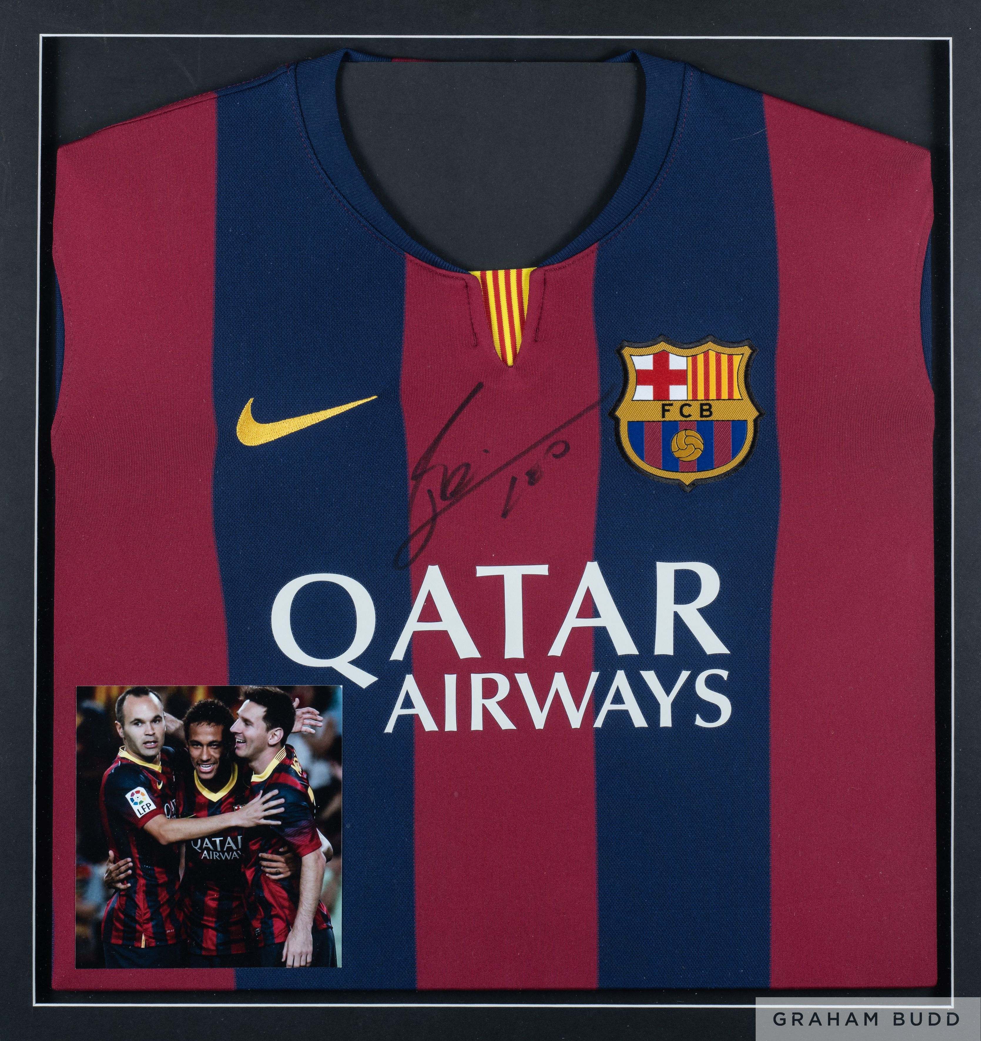 Lionel Messi framed signed Barcelona shirt, Nike, crew neck and signed in black pen with a photographic insert of Messi and team mates.