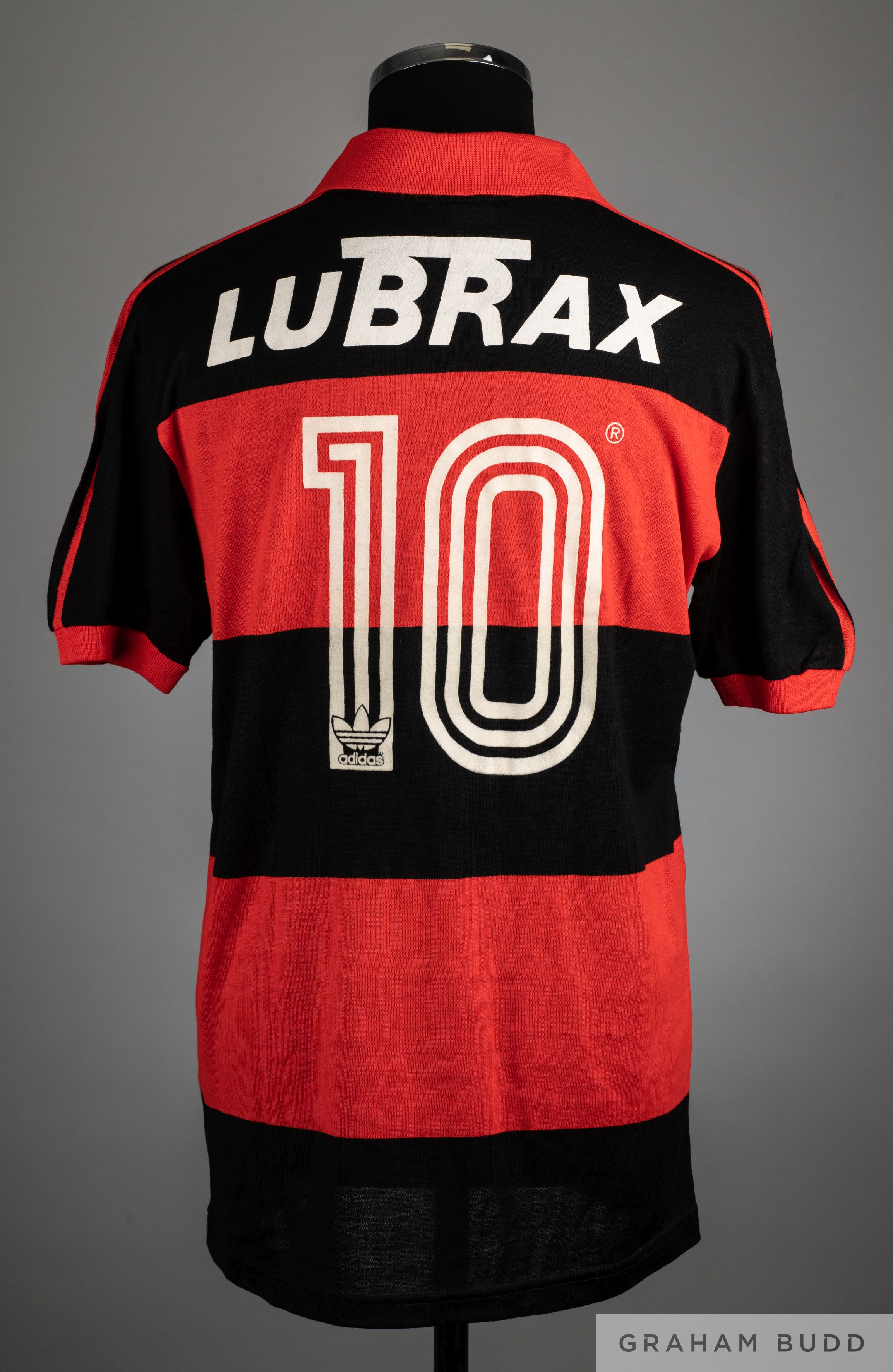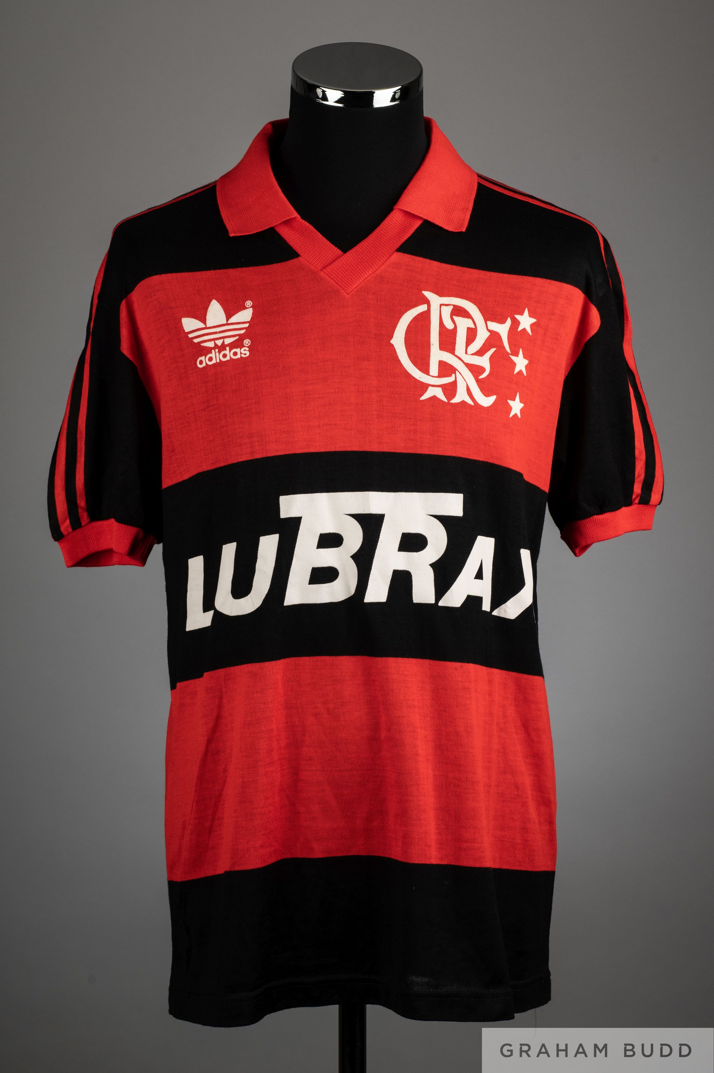 Zico red and black No.10 Flamengo v. Argentinos Juniors match worn short-sleeved shirt, 1989, Adidas, with v-neck collar and sponge badge The abov