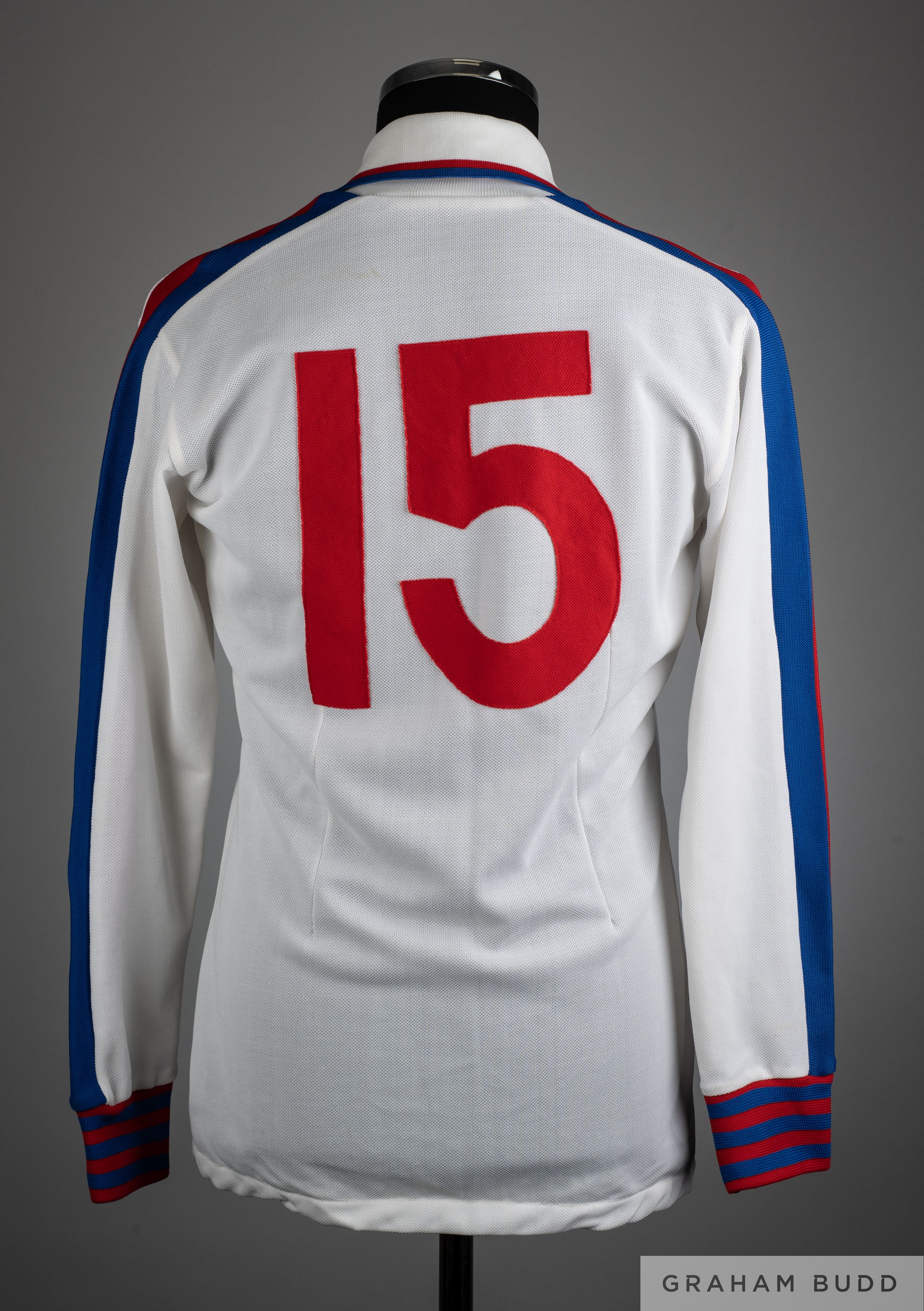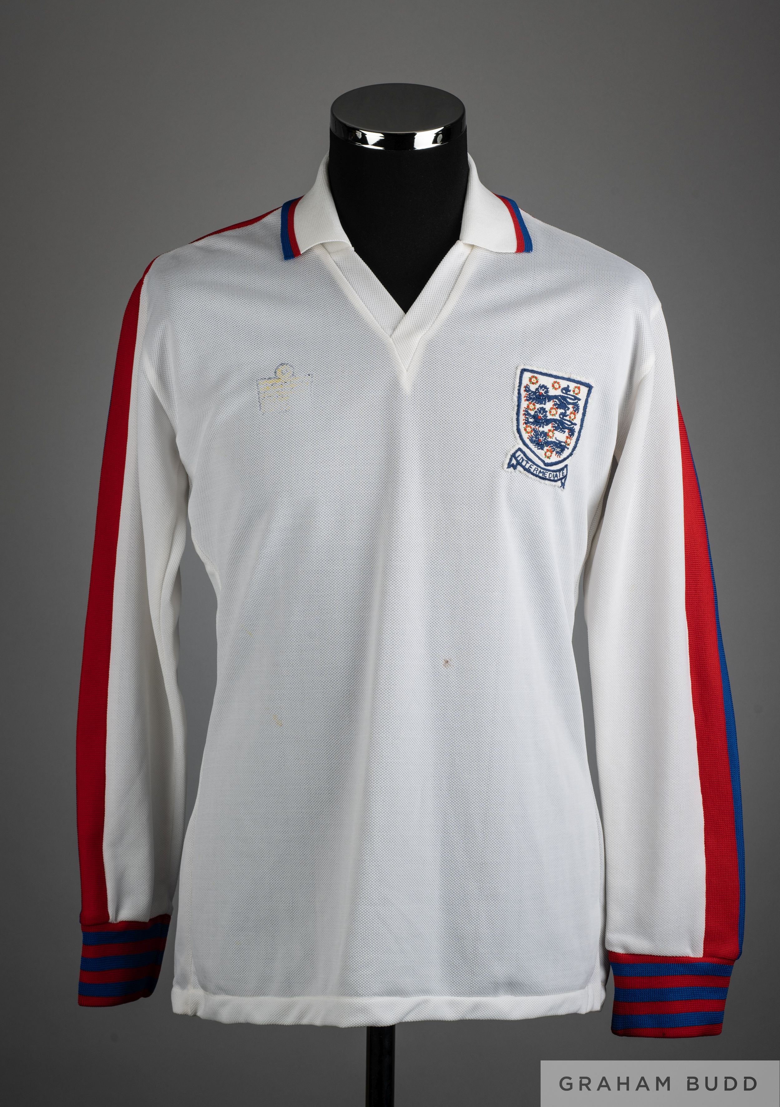 Glenn Hoddle white No.15 England Intermediate long-sleeved shirt, Admiral, 38/40cm., with v-neck collar and embroidered badge inscribed INTERMEDIATE The above shirt was worn by Glenn Hoddle in an Intermediate match for England with COA from Racing Club Museum Provenance: Racing Club Museum