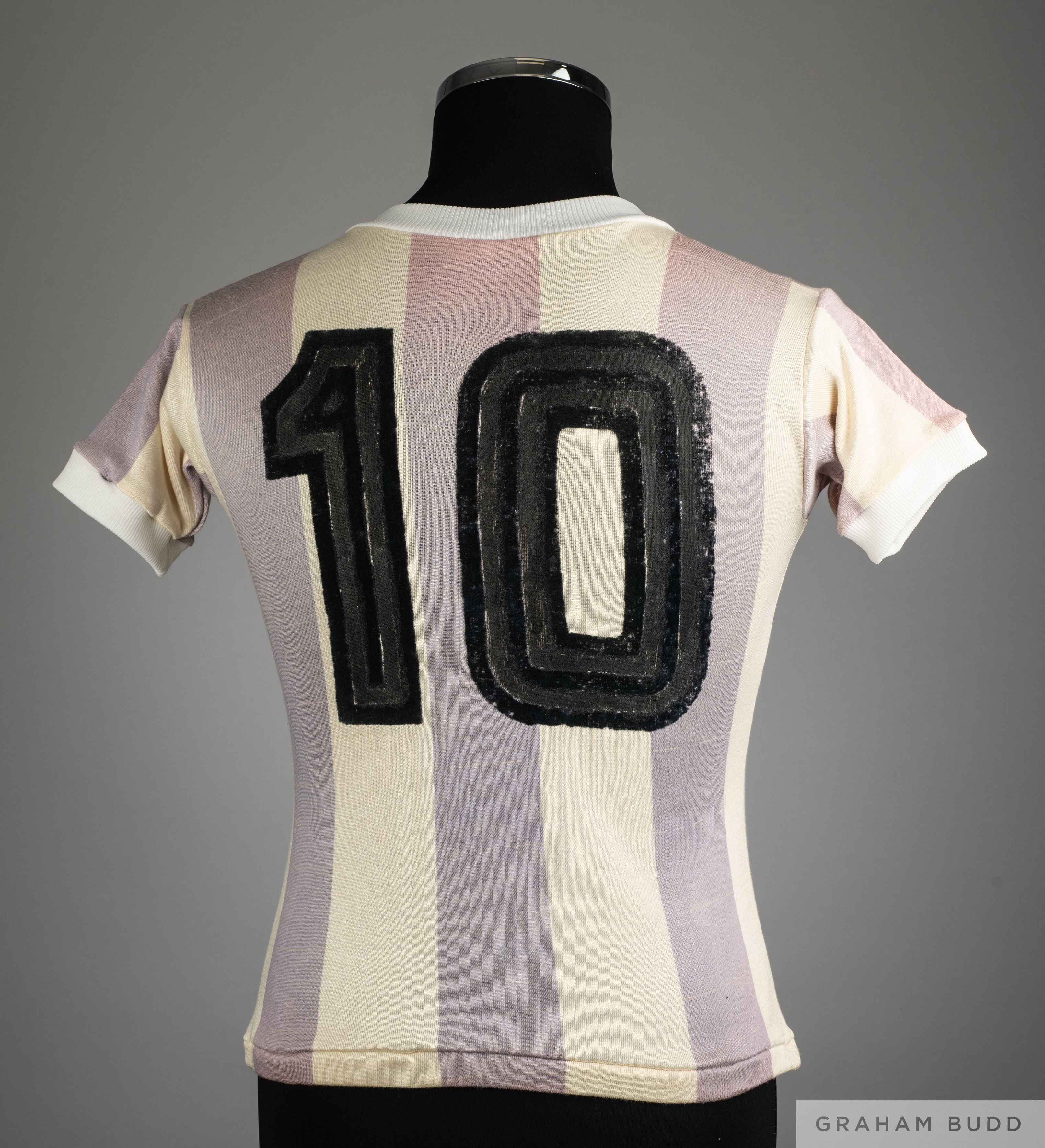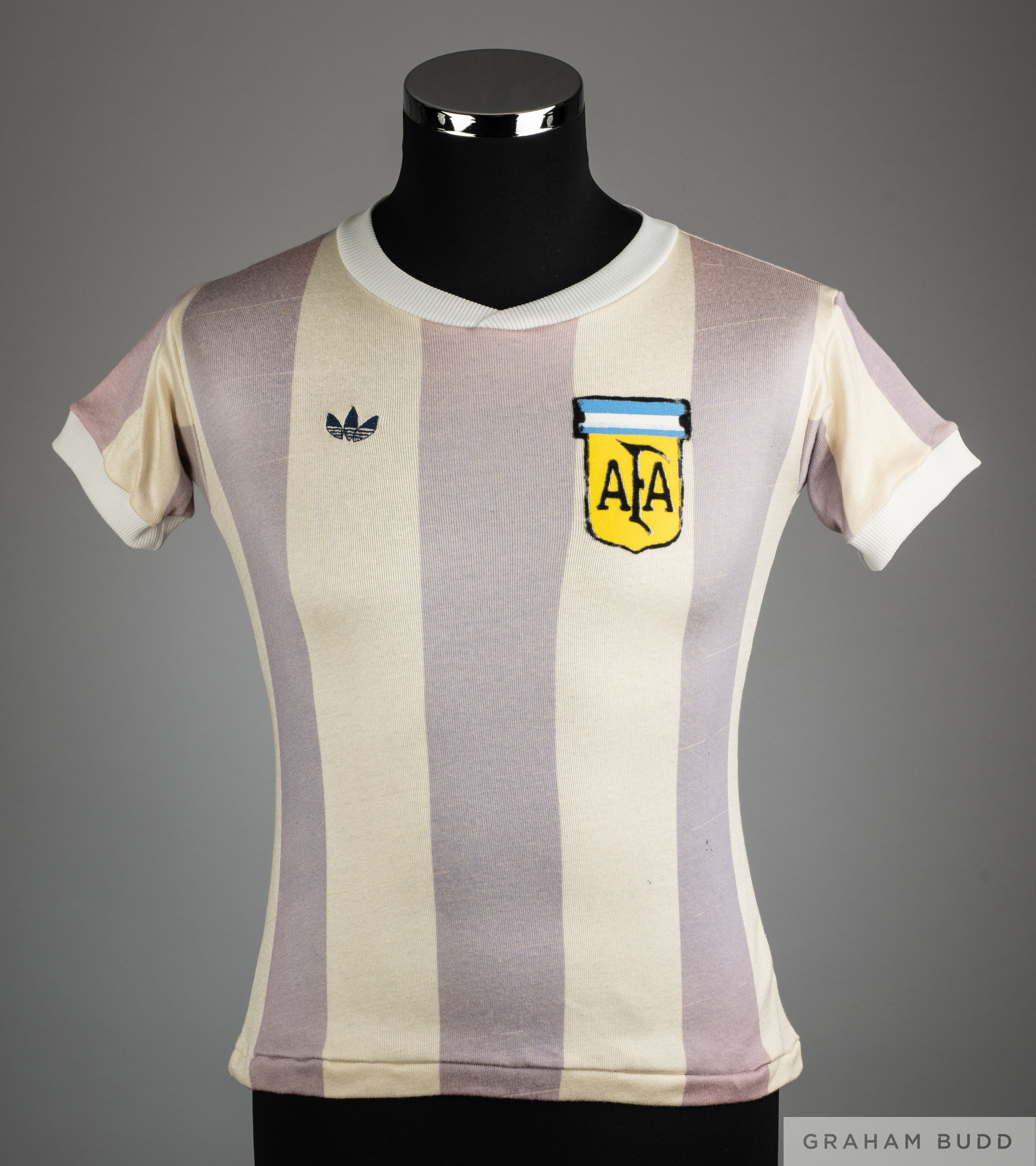 Diego Maradona blue and white No.10 Argentina v. Ecuador Under-20 match worn short-sleeved shirt, Adidas, with crew-neck collar and sponge badge inscribed AFA The above shirt was worn Maradona in the 1979 FIFA World Youth Championship, South American section qualifying. With rare number format worn in the match against Ecuador played on 18th January 1979, the match ending in a 5-0 victory for Argentina, with COA from Racing Club Museum Provenance: Racing Club Museum