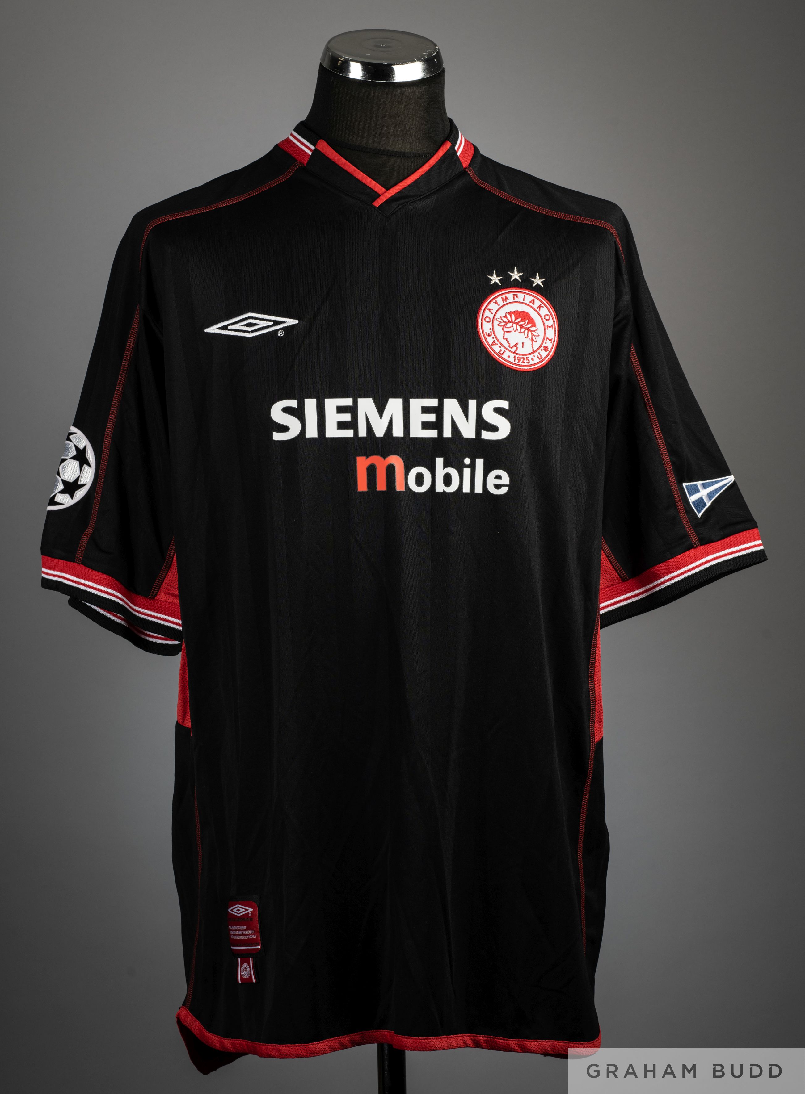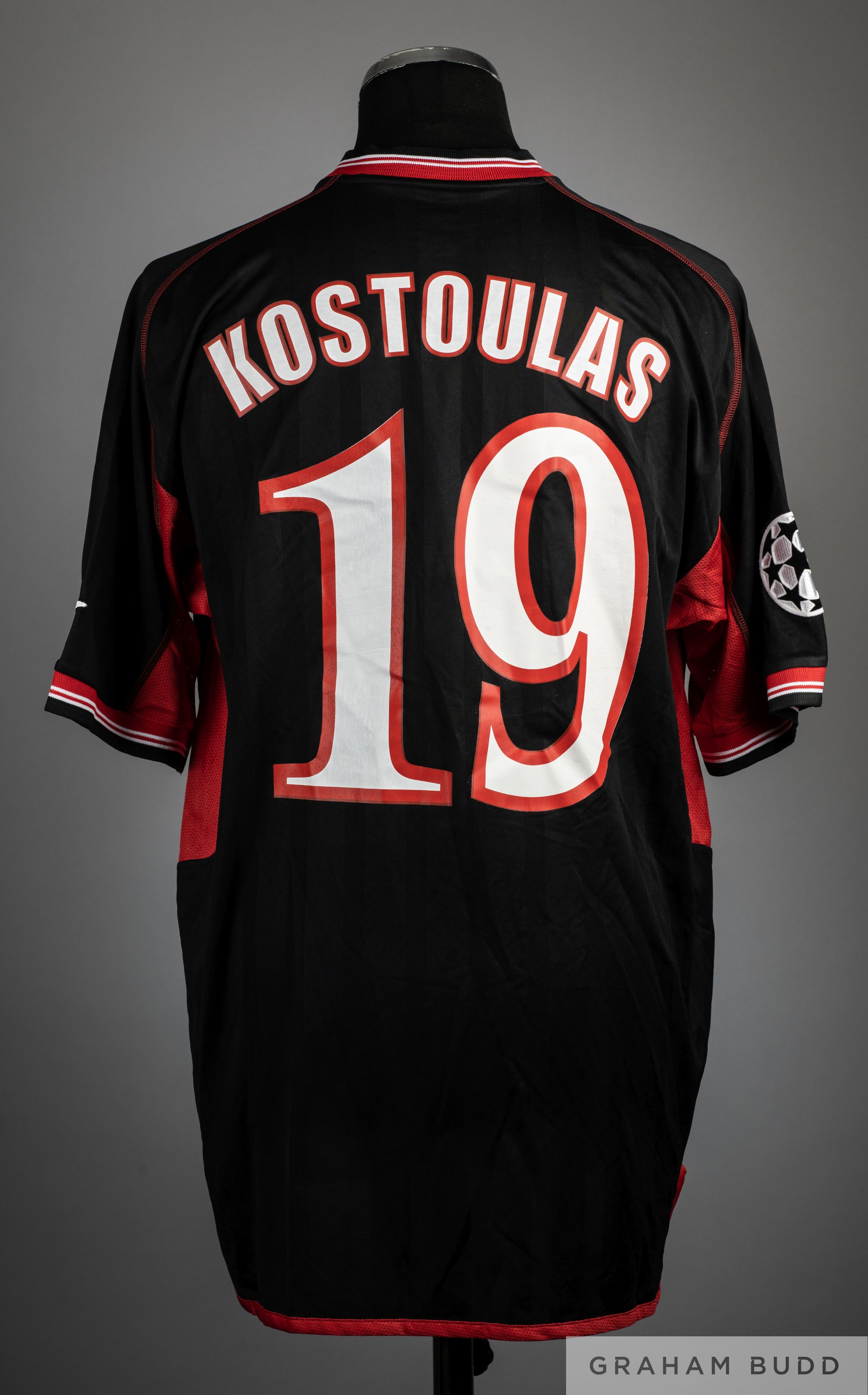 Athanasois Kostoulas black and red No.19 Olympiacos Champions League short-sleeved shirt, Umbro, XL, with v-neck collar and embroidered cloth badge, the reverse lettered KOSTOULAS, the right sleeve with Champions League flash