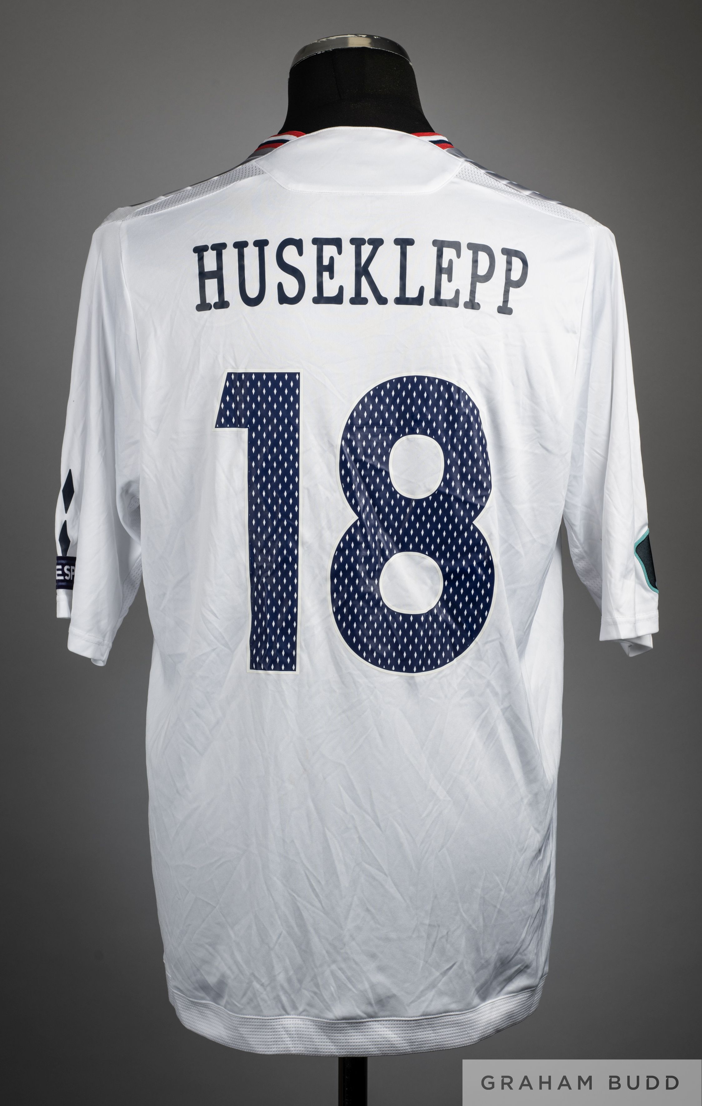 Erik Huseklepp signed white & grey No.18 Norway International 2012 Euro Qualifiers short-sleeved shirt, Umbro, L, with v-neck collar and embroidered cloth badge, the front of the shirt autographed by Huseklepp, the reverse lettered HUSEKLEPP, the right sleeve with UEFA Euro 2012 Qualifiers flash, the left sleeve with UEFA Respect flash