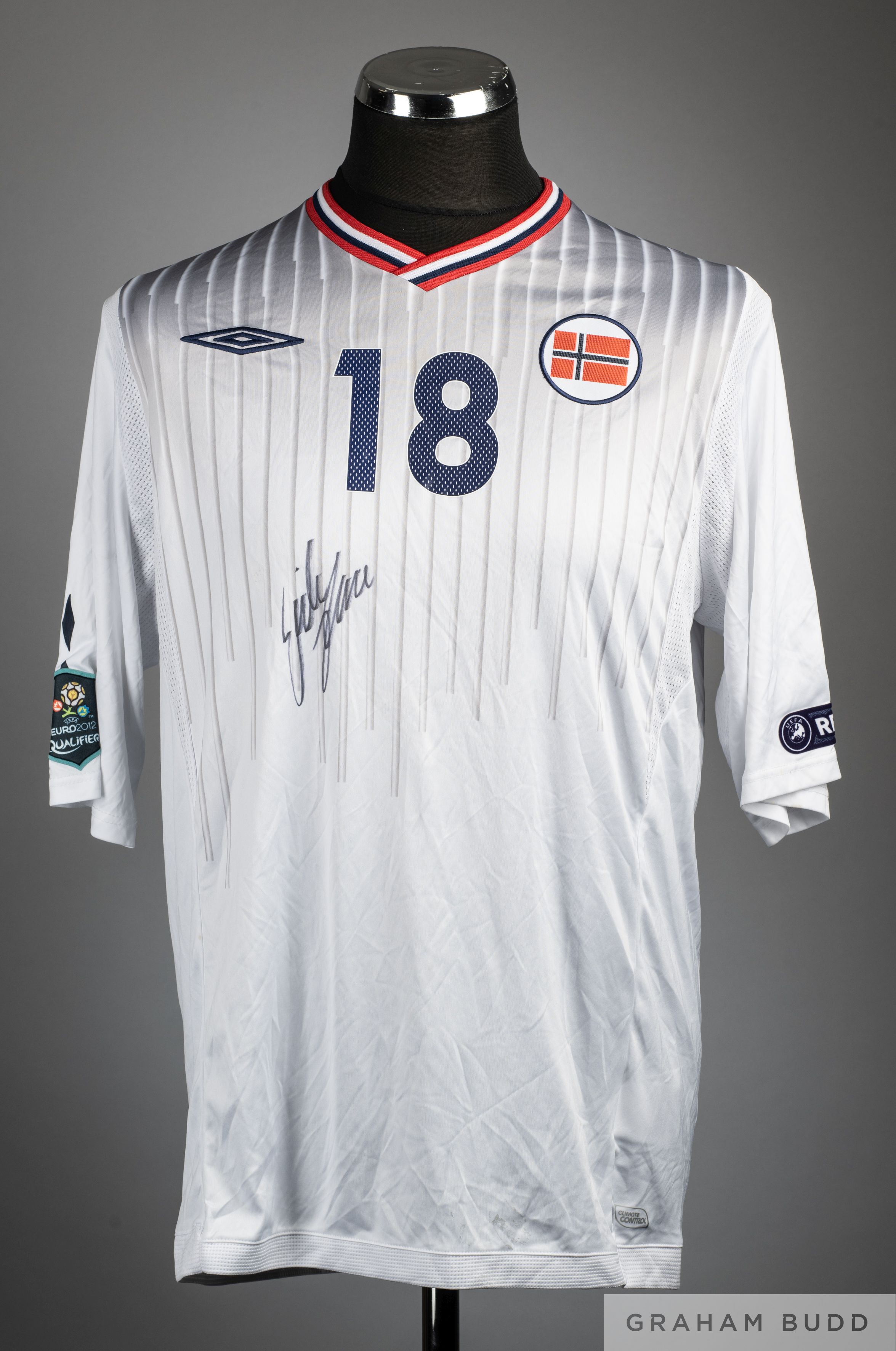 Erik Huseklepp signed white & grey No.18 Norway International 2012 Euro Qualifiers short-sleeved shirt, Umbro, L, with v-neck collar and embroidered