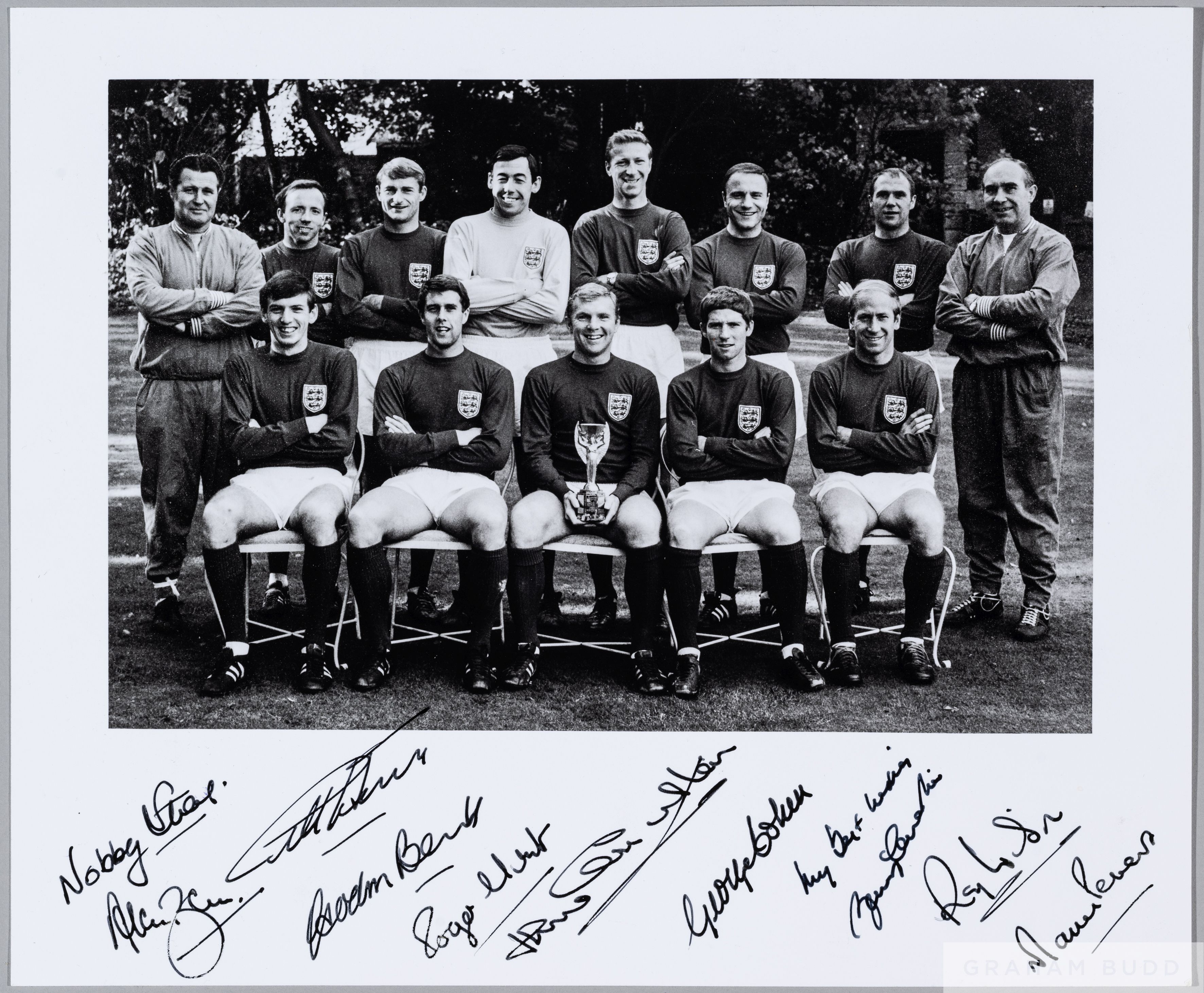 A black and white 1966 England World Cup team line up autographed photograph the margin autographed by ten of the World Cup-winning side lacking Bobb