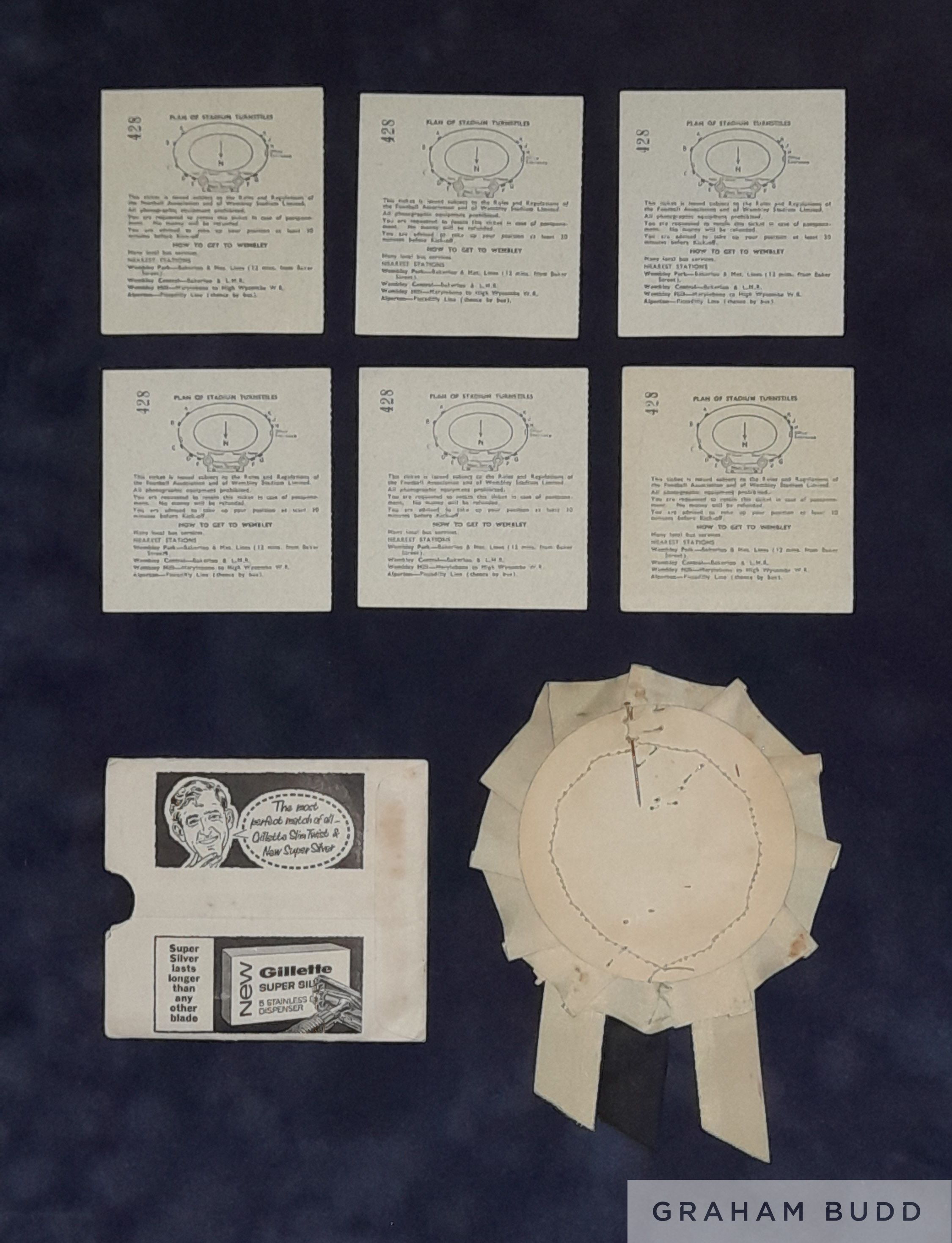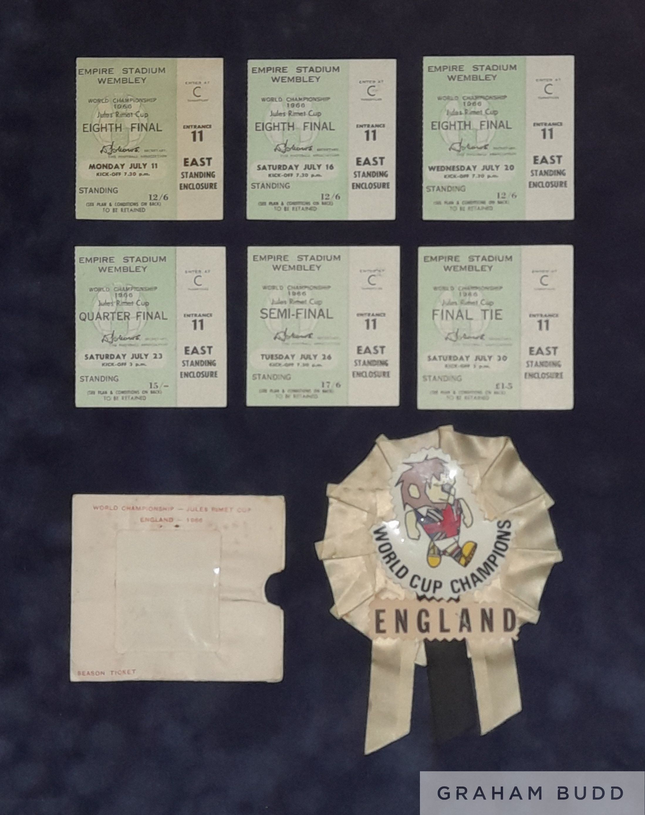 England 1966 World Cup original rosette, along with England's six tournament match tickets in their season ticket wallet, rosette is in excellent condition or its age surviving the past 57 years intact whilst the tickets are also in excellent condition just showing normal signs of handling. Tickets are for all matches at Wembley stadium, same turnstile C entrance 11, East Standing Enclosure, and are as follows. England's three group matches against Uruguay July 11th, Mexico July 16th & France July 20th, quarter final against Argentina July 23rd, semi final against Portugal July 26th & the final against West Germany July 30th as shown in auction photos