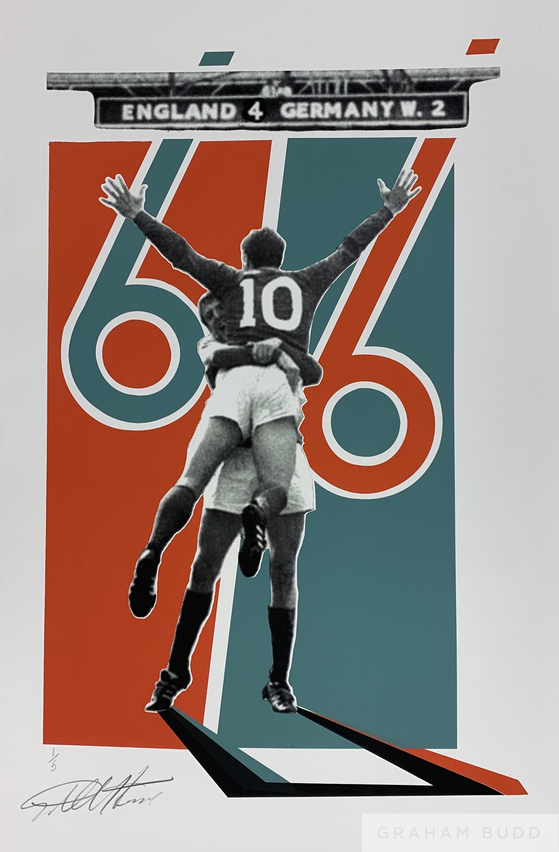 Sir Geoff Hurst Collection: Final Whistle signed by Sir Geoff Hurst, No.2 of 5, original screen print, 105 by 75cm paper size, mounted and framed, with COA That jubilant moment at the full time whistle, with Geoff being lifted by his great friend and team mate Martin Peters, finally realising their childhood dreams. The artwork showing the year and the famous scoreline. Sir Geoff Hurst scored the most memorable hat-trick in the 1966 World Cup Final for England. In celebration of his 80th birthday, he created a series of five unique artworks giving a new and never seen before take on the events that shaped that famous victory for England in 1966. The inks used to create Sir Geoff Hurst’s Original Edition prints are infused with the hallowed turf from Wembley – Wembley’s DNA Provenance: Icon Arts - Sir Geoff Hurst Collection