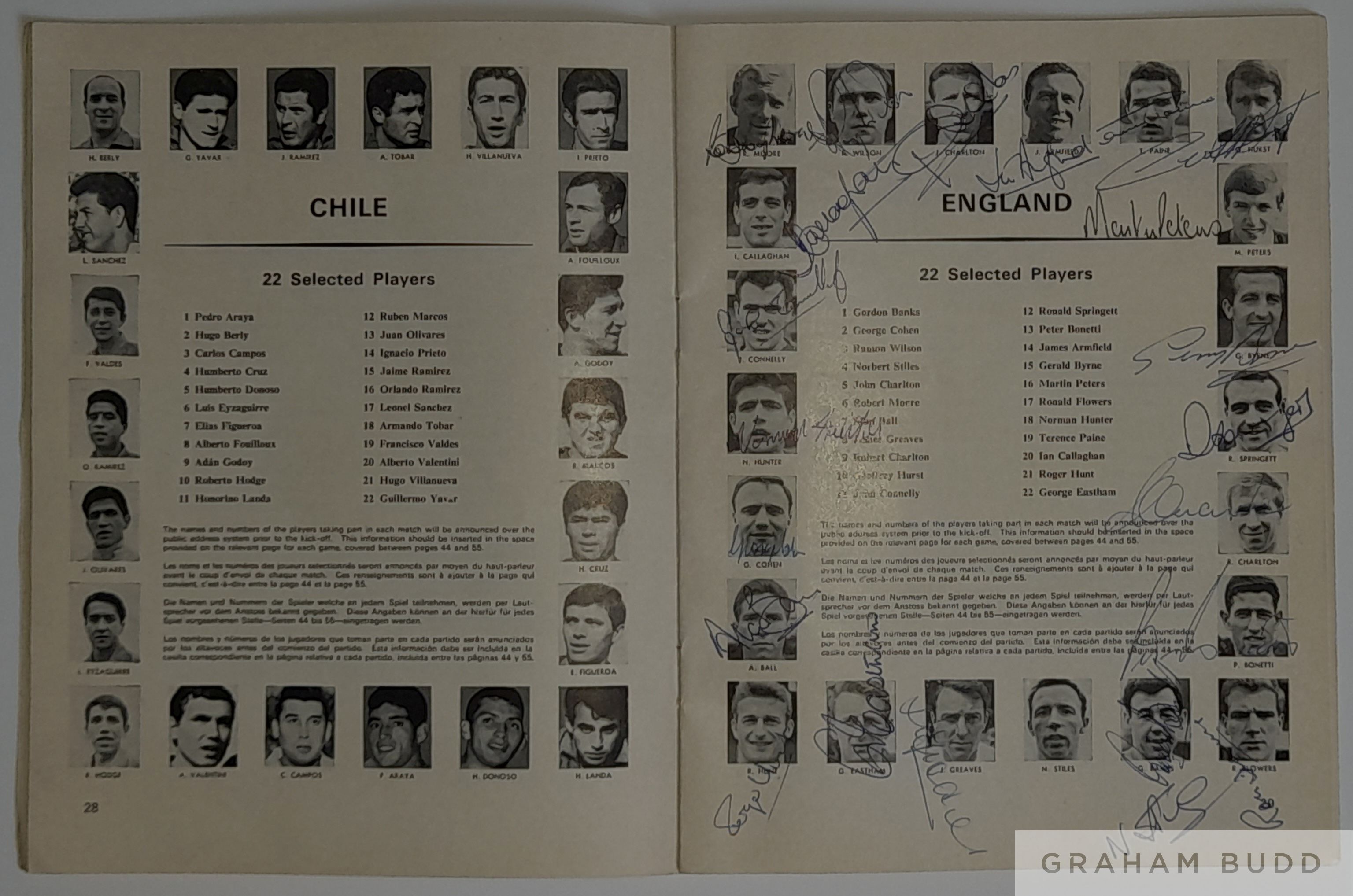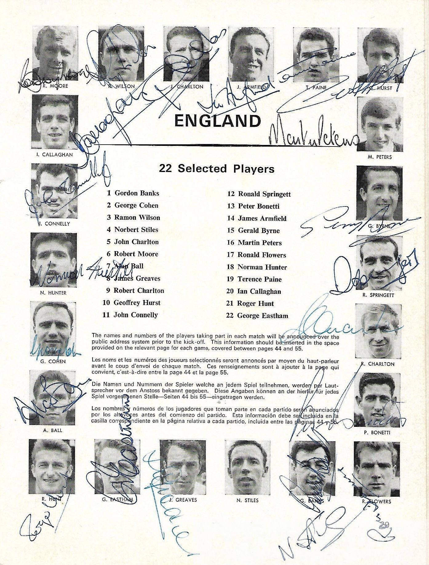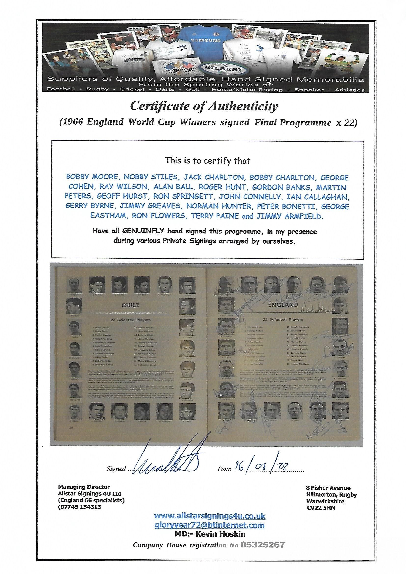 England 1966 World Cup tournament programme fully signed by the 22 man winning squad, of Bobby Moore (captain), Geoff Hurst, Martin Peters, Gordon Banks, Roger Hunt, Jack Charlton, Nobby Stiles, Bobby Charlton, Ray Wilson, George Cohen, Alan Ball, Ian Callaghan, Norman Hunter, John Connelly, Terry Paine, George Eastham, Gerry Byrne, Jimmy Greaves, Ron Springett, Peter Bonetti, Ron Flowers and Jimmy Armfield. Programme is in pristine condition with no major creasing, no rips or teats and no writing across any pages except for the autographs