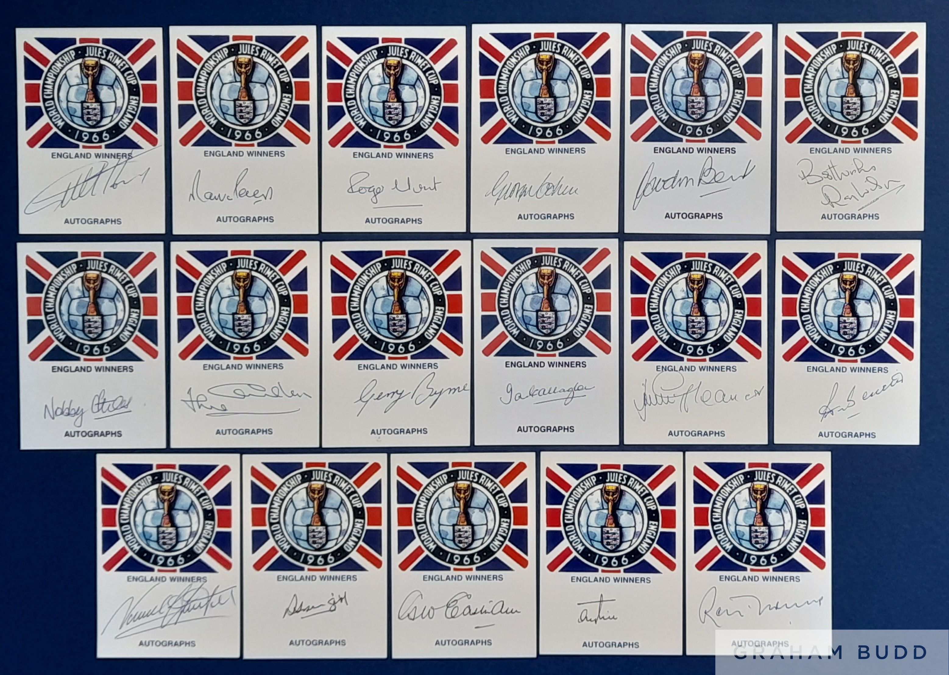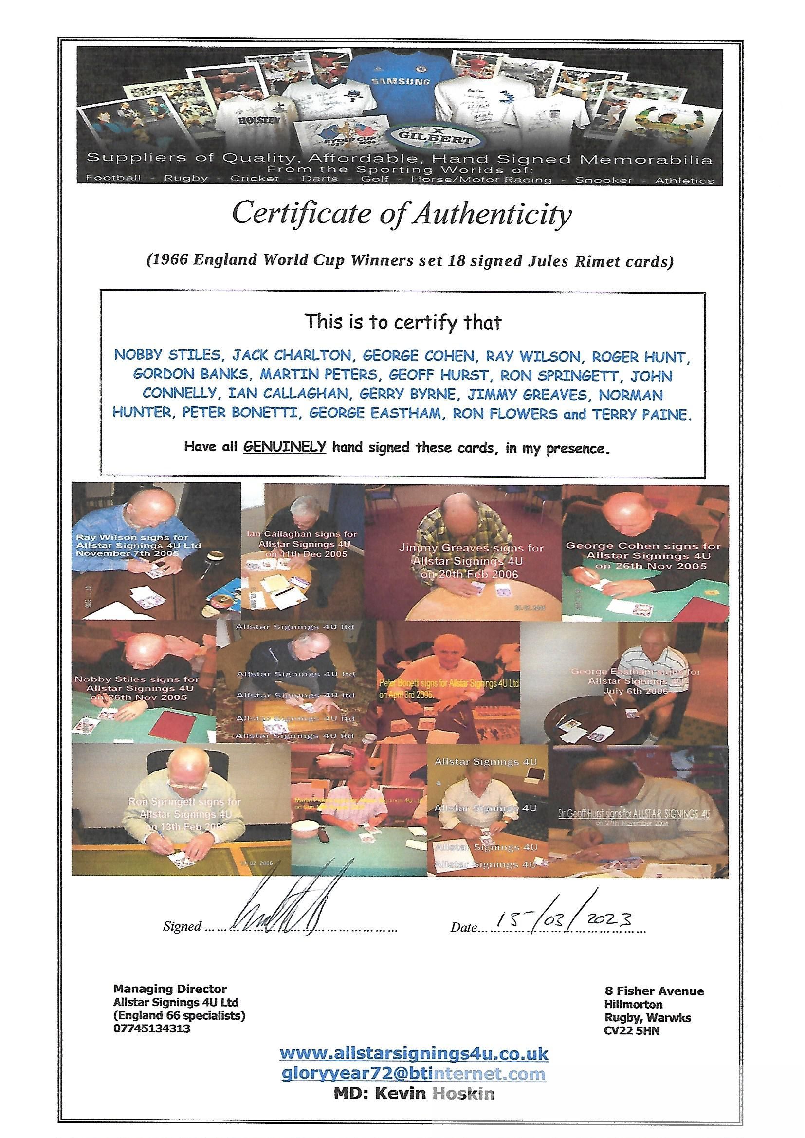 England 1966 World Cup winners set of 17 signed Jules Rimet cards, the eighteen autographs are Geoff Hurst, Martin Peters, Gordon Banks, Roger Hunt, Jack Charlton, Nobby Stiles, Ray Wilson, George Cohen, Ian Callaghan, Norman Hunter, Terry Paine, George Eastham, Gerry Byrne, Jimmy Greaves, Ron Springett, Peter Bonetti, Ron Flowers, each measuring approx.105 x 75mm complete with COA and photo proofs of players signing