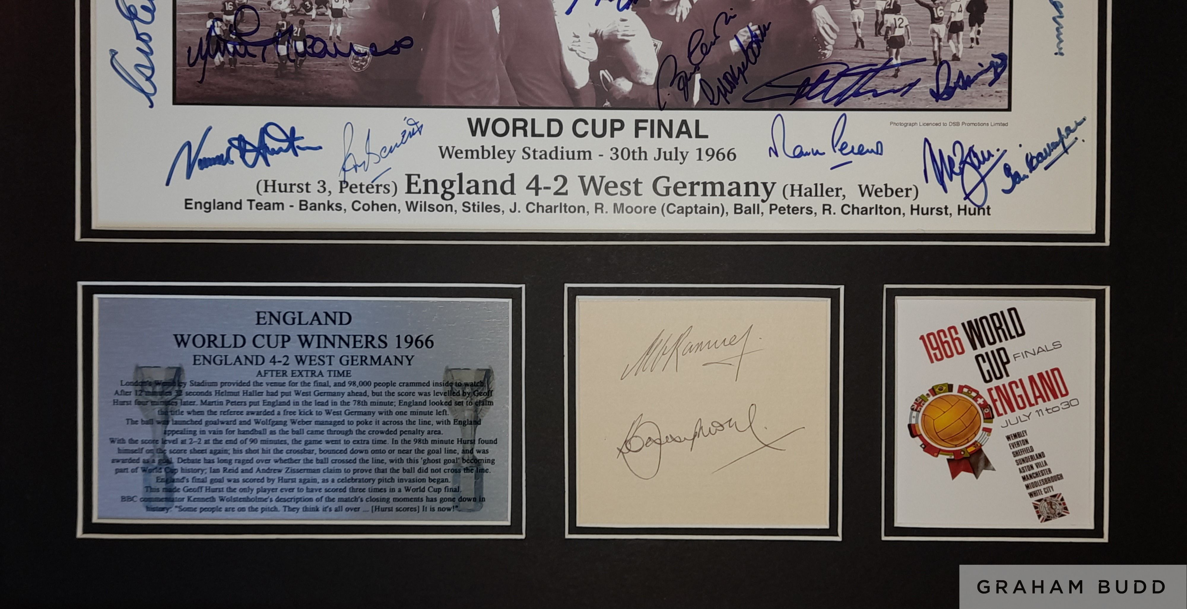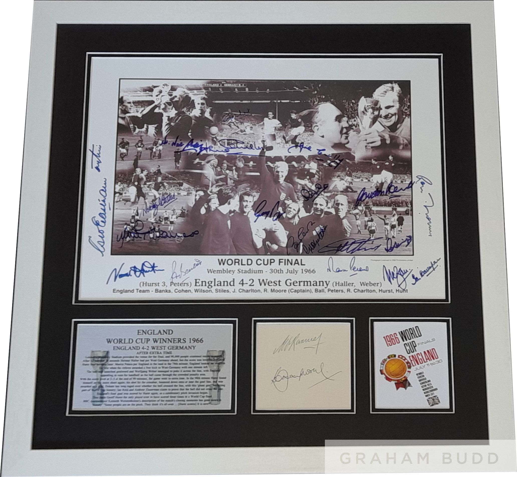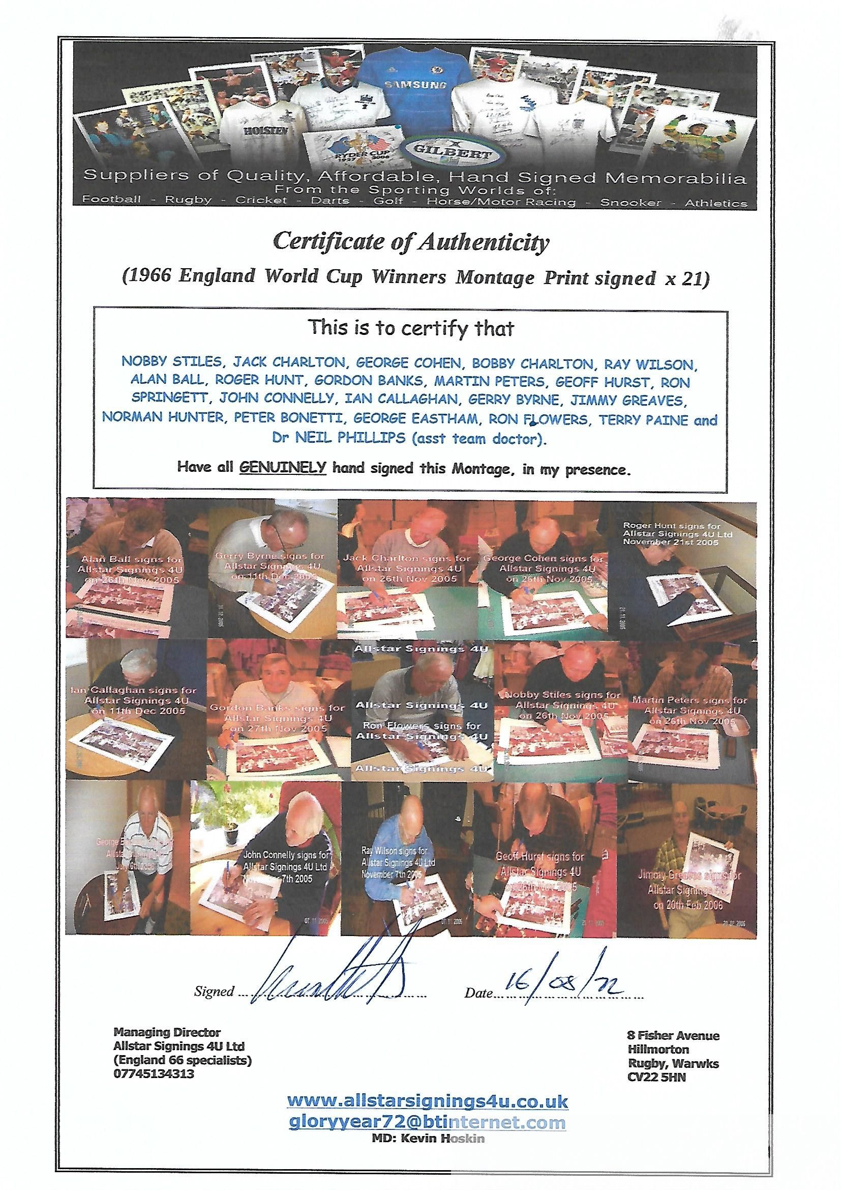 England 1966 World Cup winners signed & framed display, features a b&w montage signed by 21 of the victorious squad Alan Ball, Geoff Hurst, Martin Peters, Gordon Banks, Roger Hunt, Jack Charlton, Nobby Stiles, Ray Wilson, George Cohen, Bobby Charlton, Ian Callaghan, Norman Hunter, John Connelly, Terry Paine, George Eastham, Gerry Byrne, Jimmy Greaves, Ron Springett, Peter Bonetti, Ron Flowers & assistant team doctor Dr Neil Phillips. Mounted below this are the autographs of captain Bobby Moore and manager Sir Alf Ramsey with either side of them a n engraved metal plaque and miniature image of tournament poster. Frame measures 23 x 23in., comes with COA and photograph proof