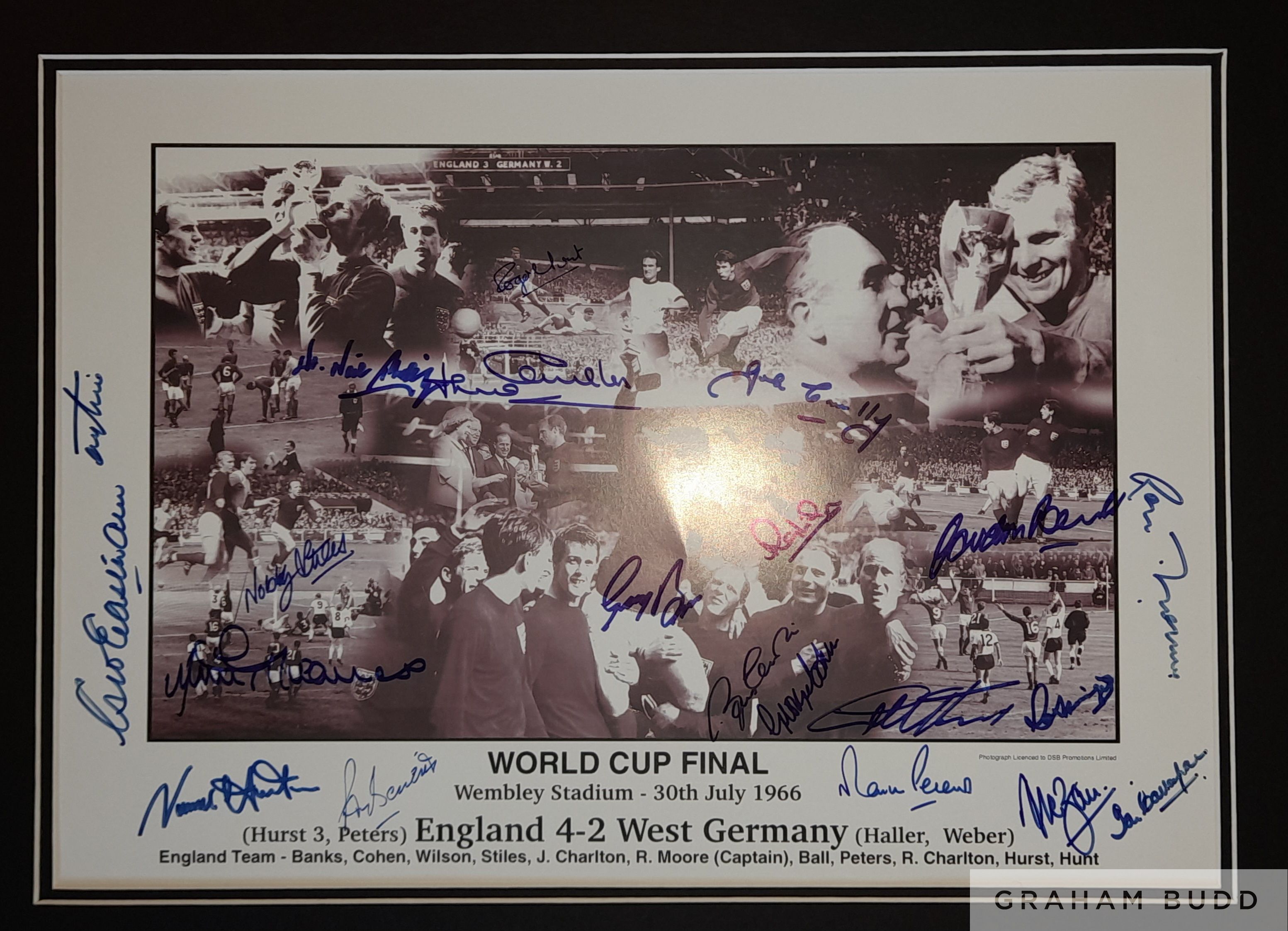 England 1966 World Cup winners signed & framed display, features a b&w montage signed by 21 of the victorious squad Alan Ball, Geoff Hurst, Martin P