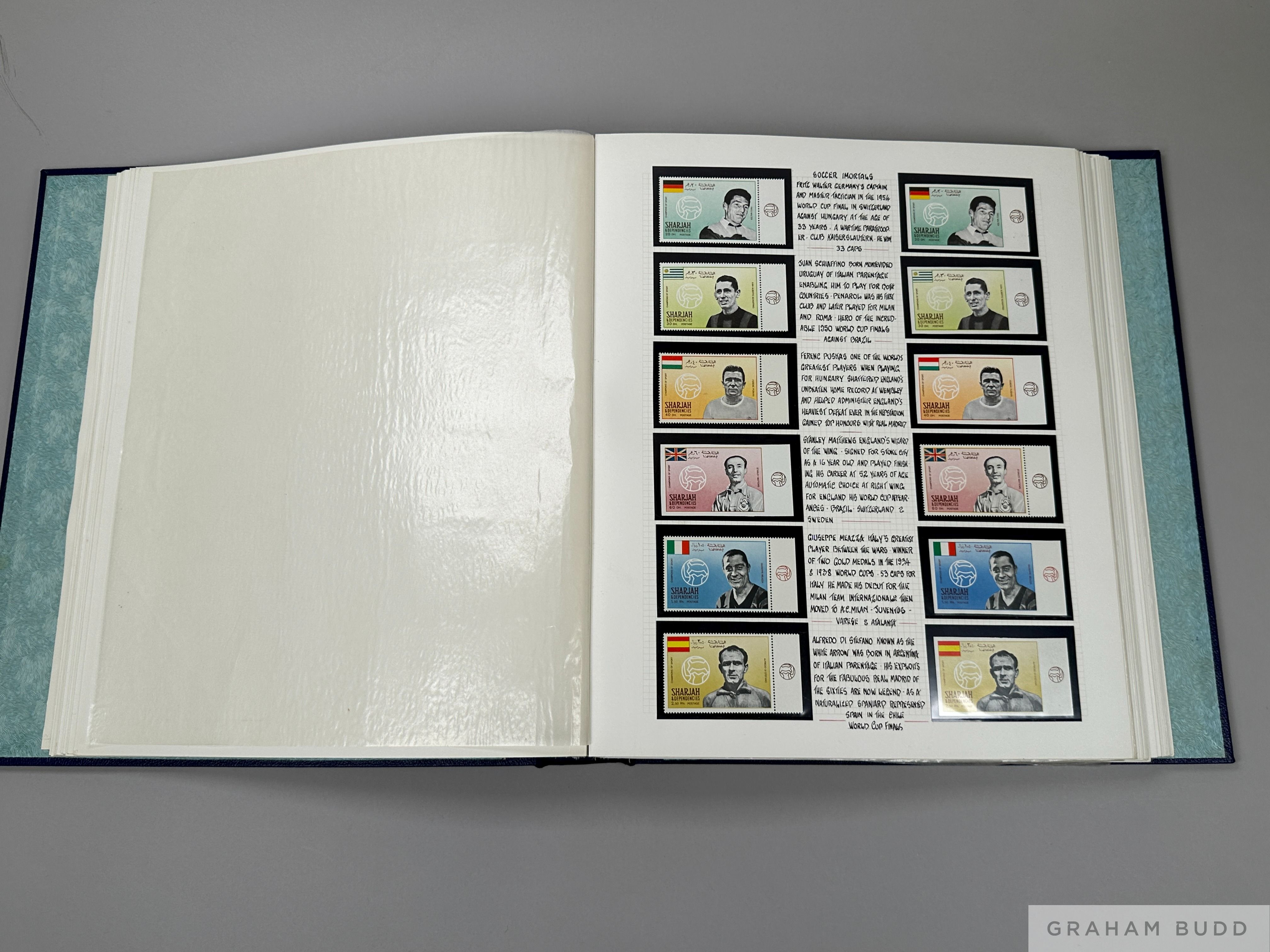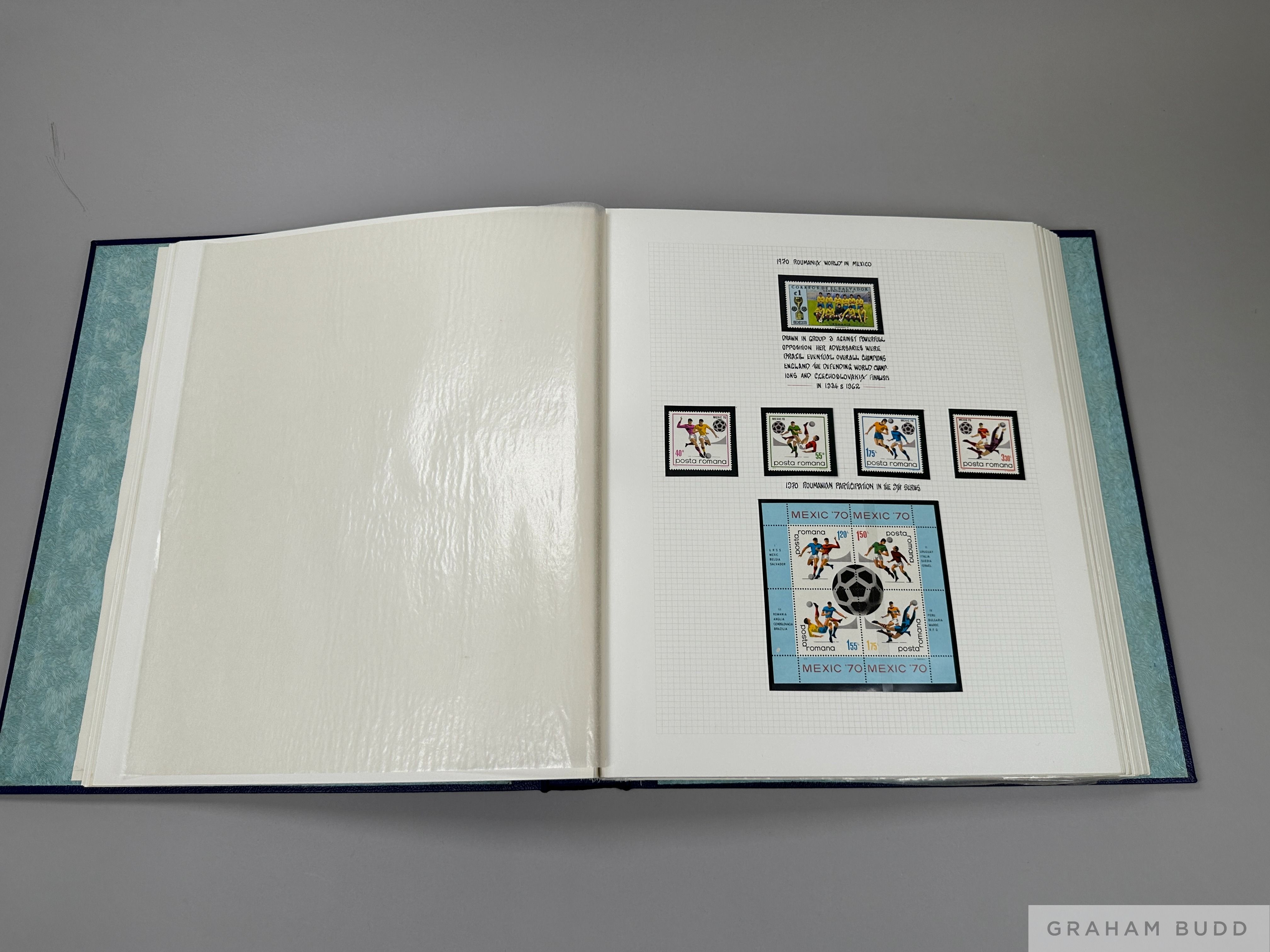 Football World Cup Mexico 1970 presented large album, containing a fine collection of stamps, covers, postcards and mini sheets from around the world and all issued for 1970 World Cup. Includes a scarce Sportmex to exhibition, miniature sheet cancelled with opening exhibition postmark and final day postmark. Signed by the designer a set of four blocks or special issue Mexico World Cup stamps, each block signed by Lance Wynam of New York, numerous stamps issued from various countries featuring players, includes Pele, Moore, Charlton and others, unique archive