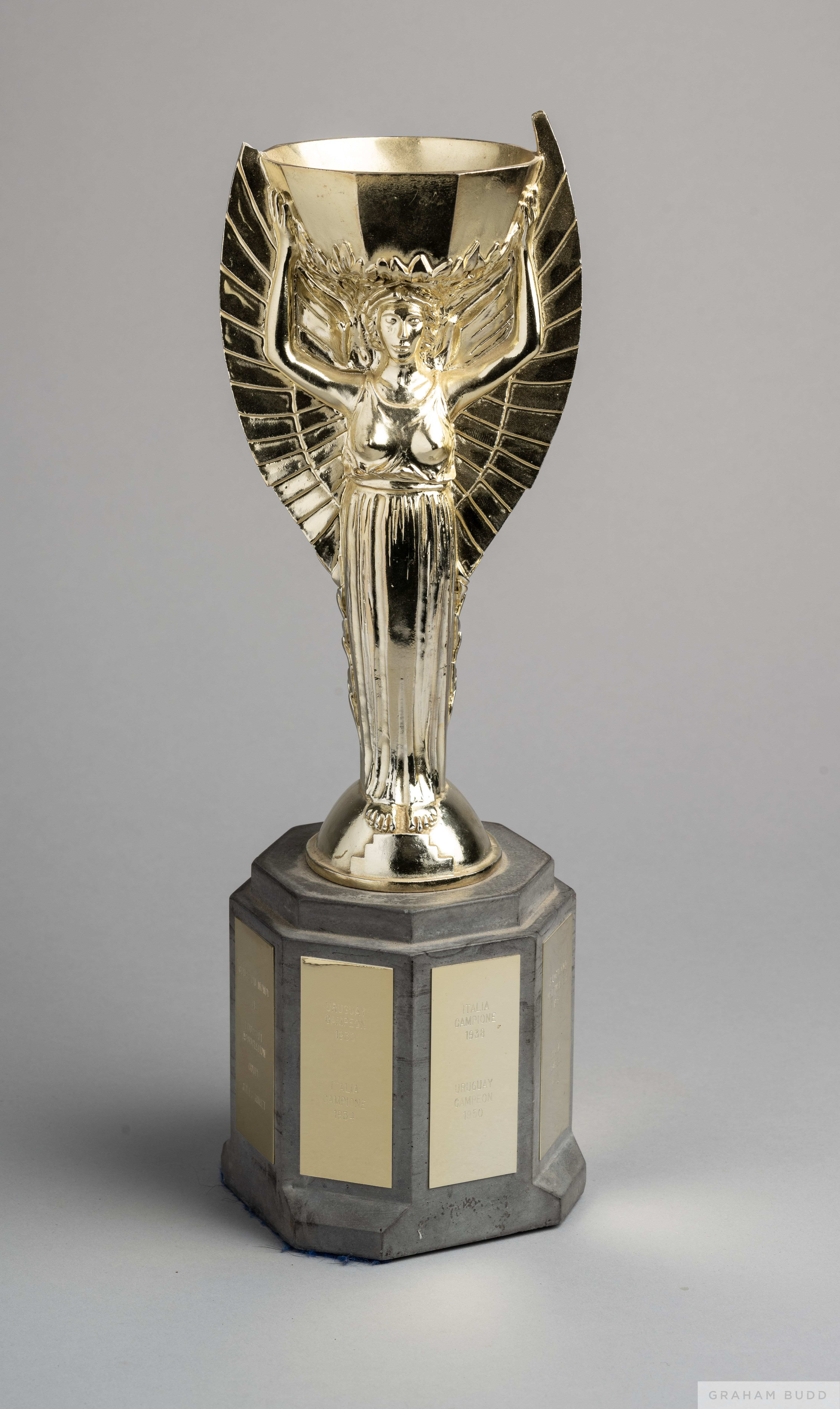 Gilt-lacquered replica of the Jules Rimet Trophy the octagonal stoneware base set with brass plaques listing previous winners 1930 up to 1970, 33cm h
