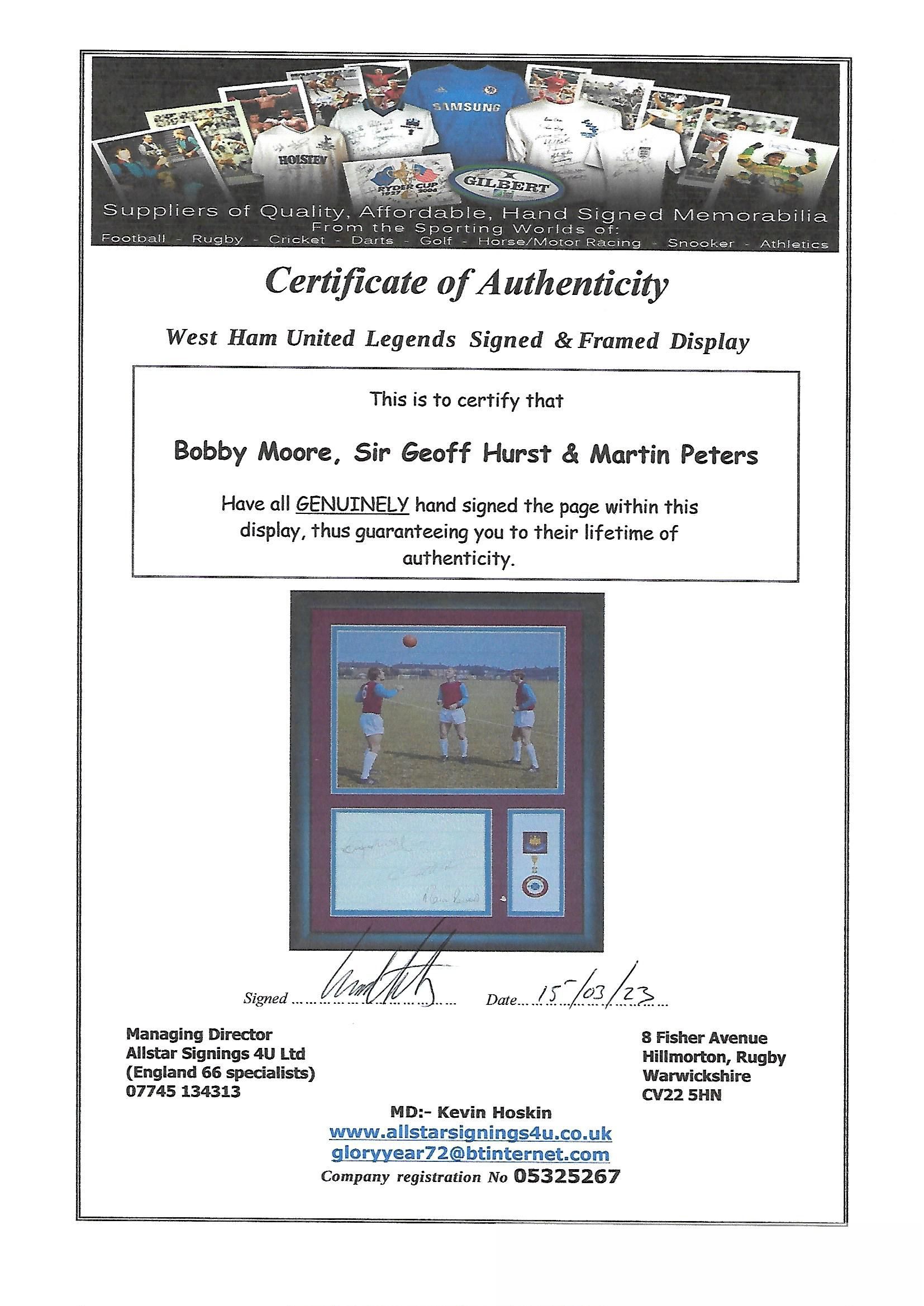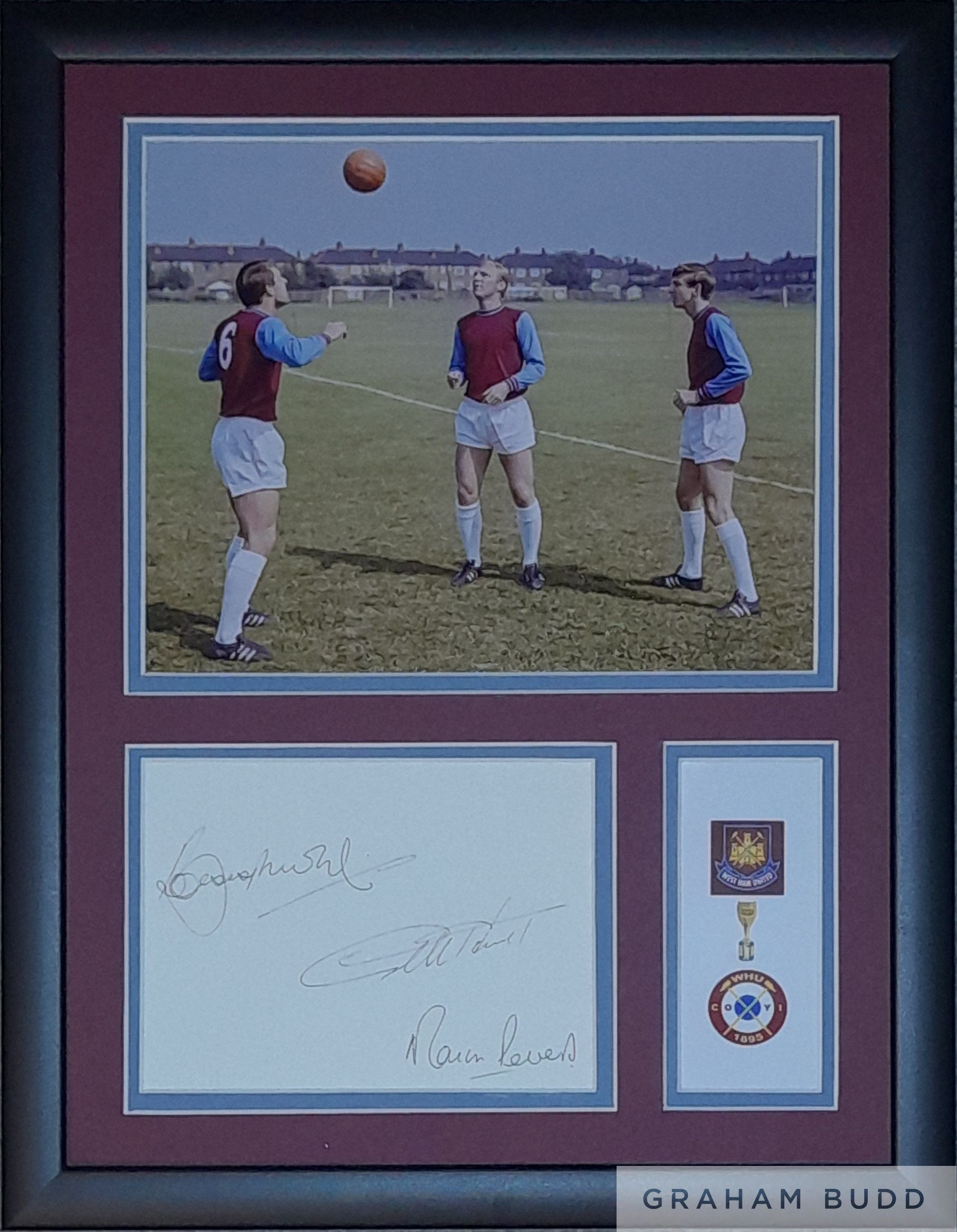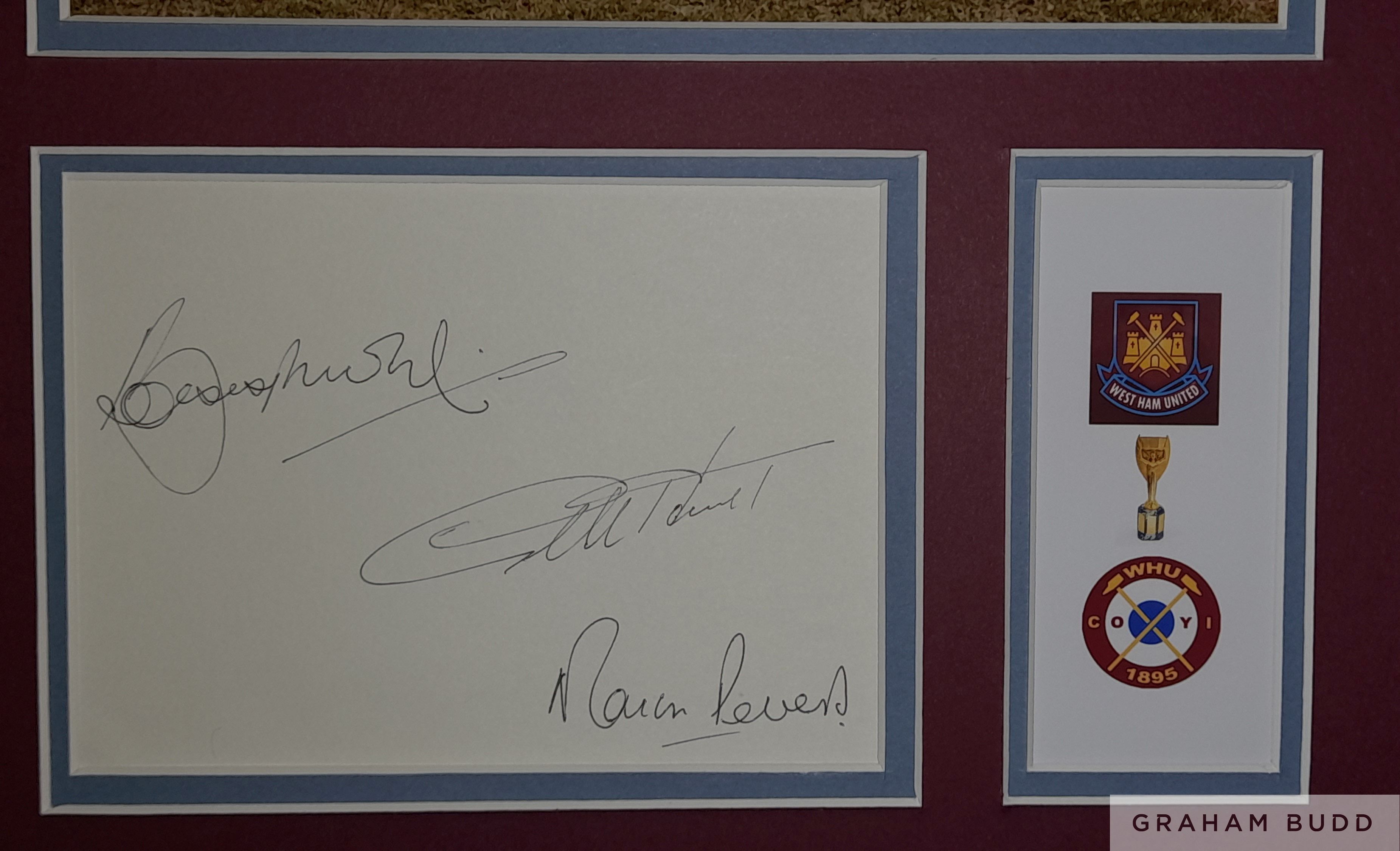 Bobby Moore, Geoff Hurst & Martin Peters signed & framed West Ham United display, features signed autograph book page by all three, photo taken during training and plaque with crests & the Jules Rimet trophy from their 1966 World Cup victory together, measuring 16.5 x 13.5in., comes with COA