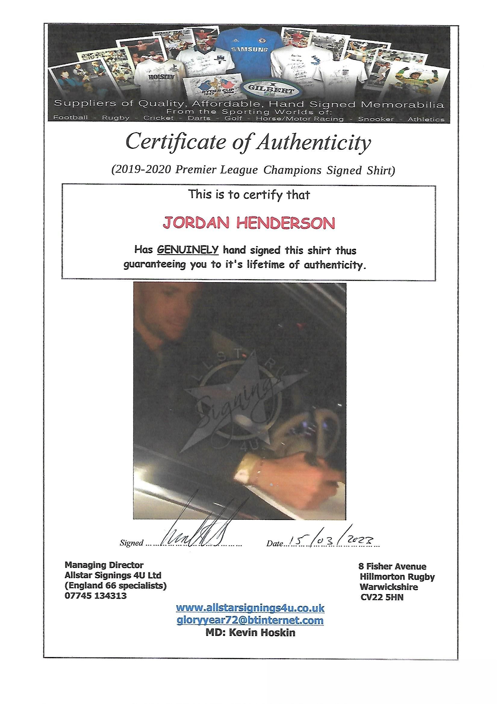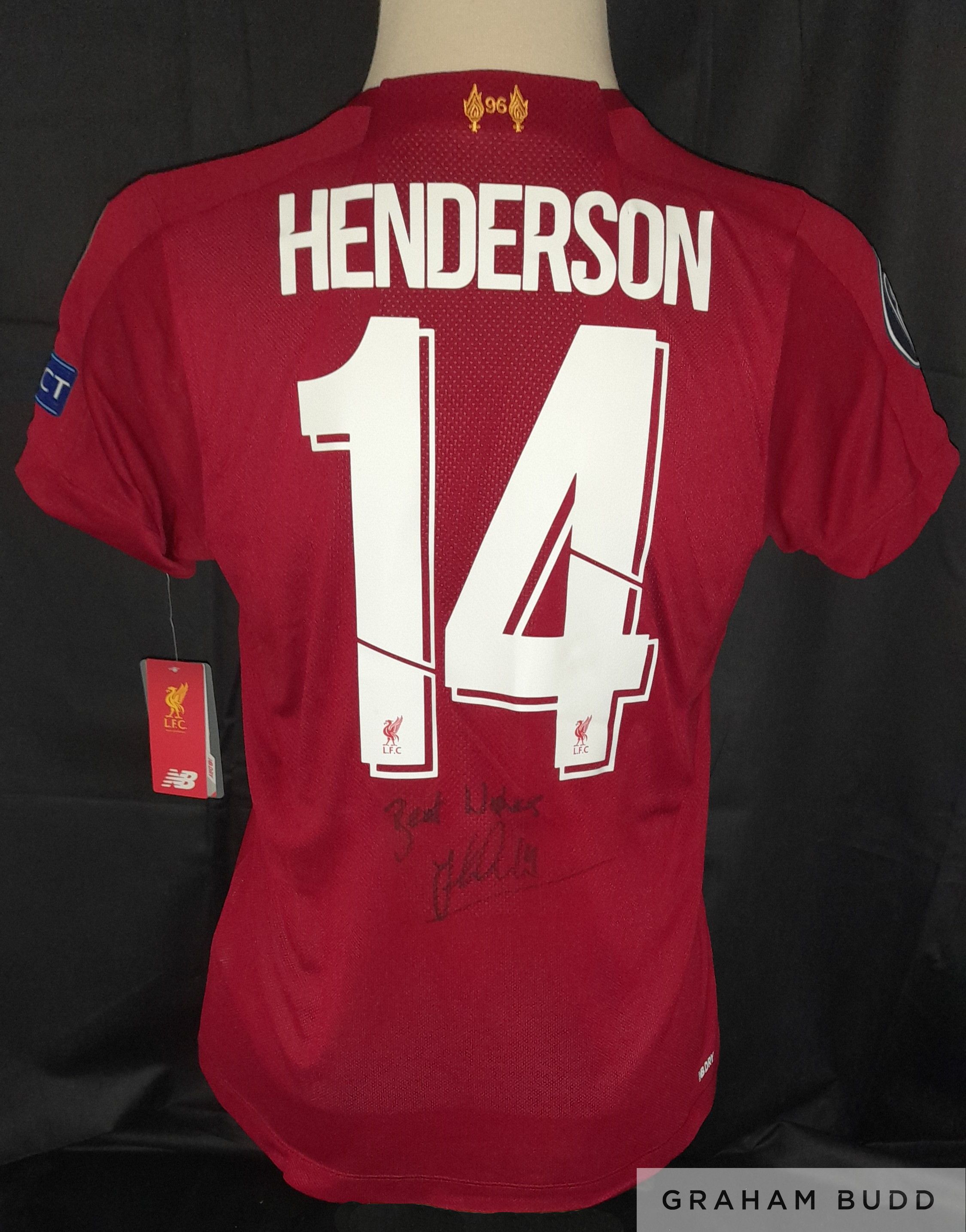 Jordan Henderson Liverpool captain signed 2019-20 Premier League season winning shirt, brand new official Liverpool FC merchandise with tags still attached, autographed by Jordan who added Best Wishes below his number 14 boldly and neatly, shirt has six x European Cup/Champions League winners, UEFA Respect and current 2019 Champions League holders patches across both arms and comes with COA and photograph proof