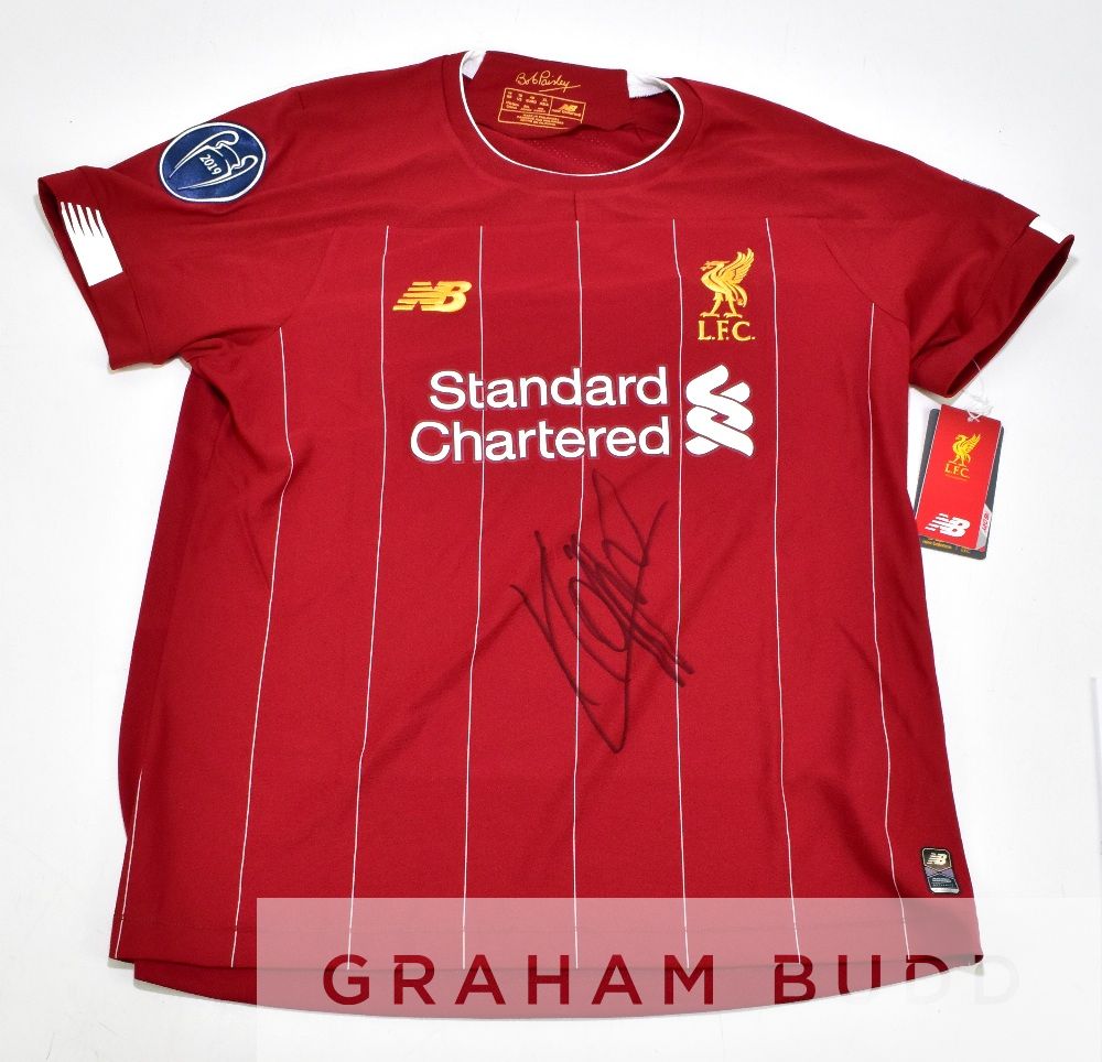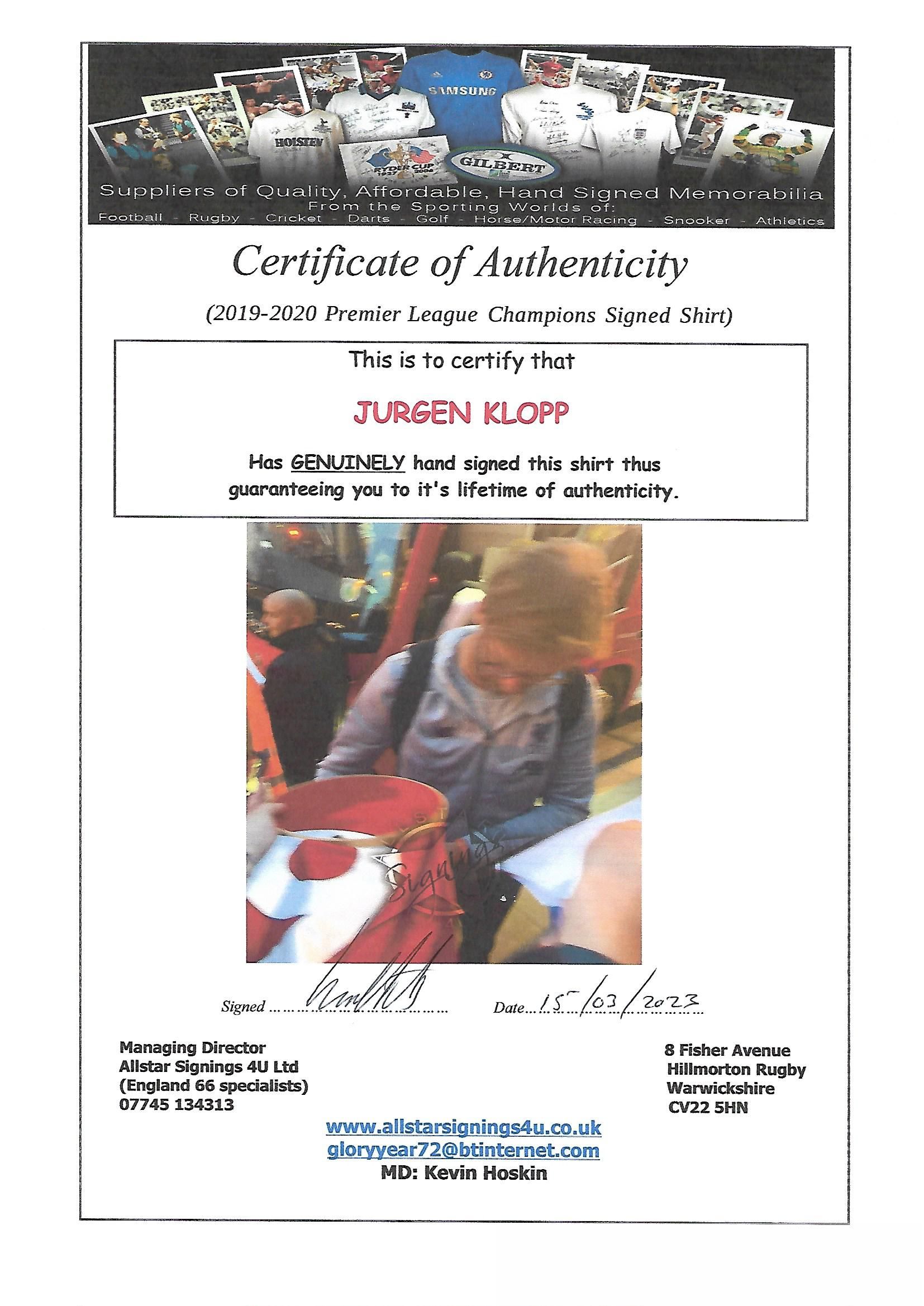 Jurgen Klopp Liverpool manager signed 2019-20 Premier League season winning shirt, brand new official Liverpool FC merchandise with tags still attached, autographed by Jurgen to front below sponsor boldly and neatly, shirt has six x European Cup/Champions League winners, UEFA Respect and current 2019 Champions League holders patches across both arms and comes with COA and photograph proof