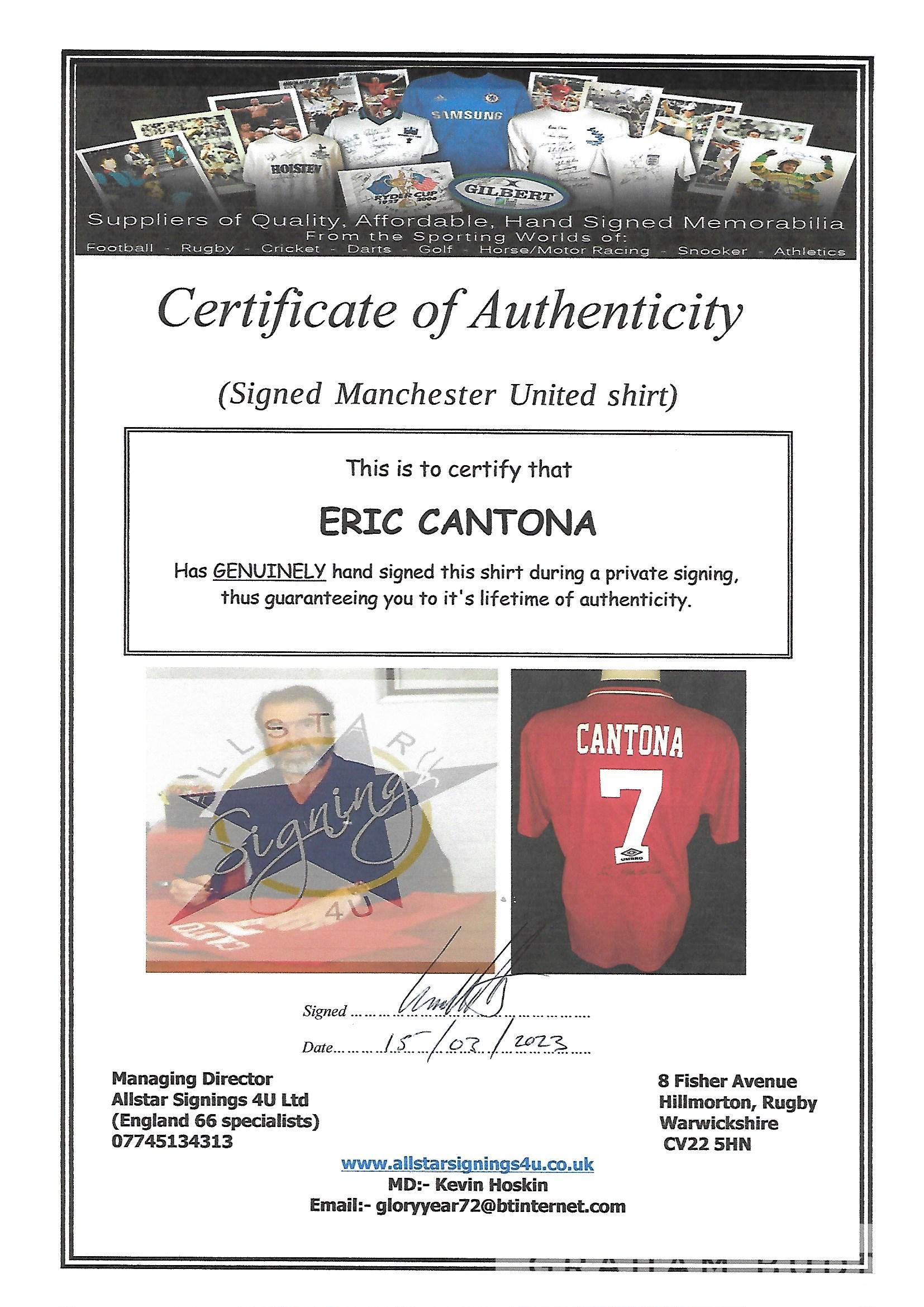 Manchester United Eric Cantona signed shirt 1993 double season Premier League and FA Cup winners, Umbro shirt, size medium. Autographed by Eric to rear below name and his number 7, comes with COA and photograph proof