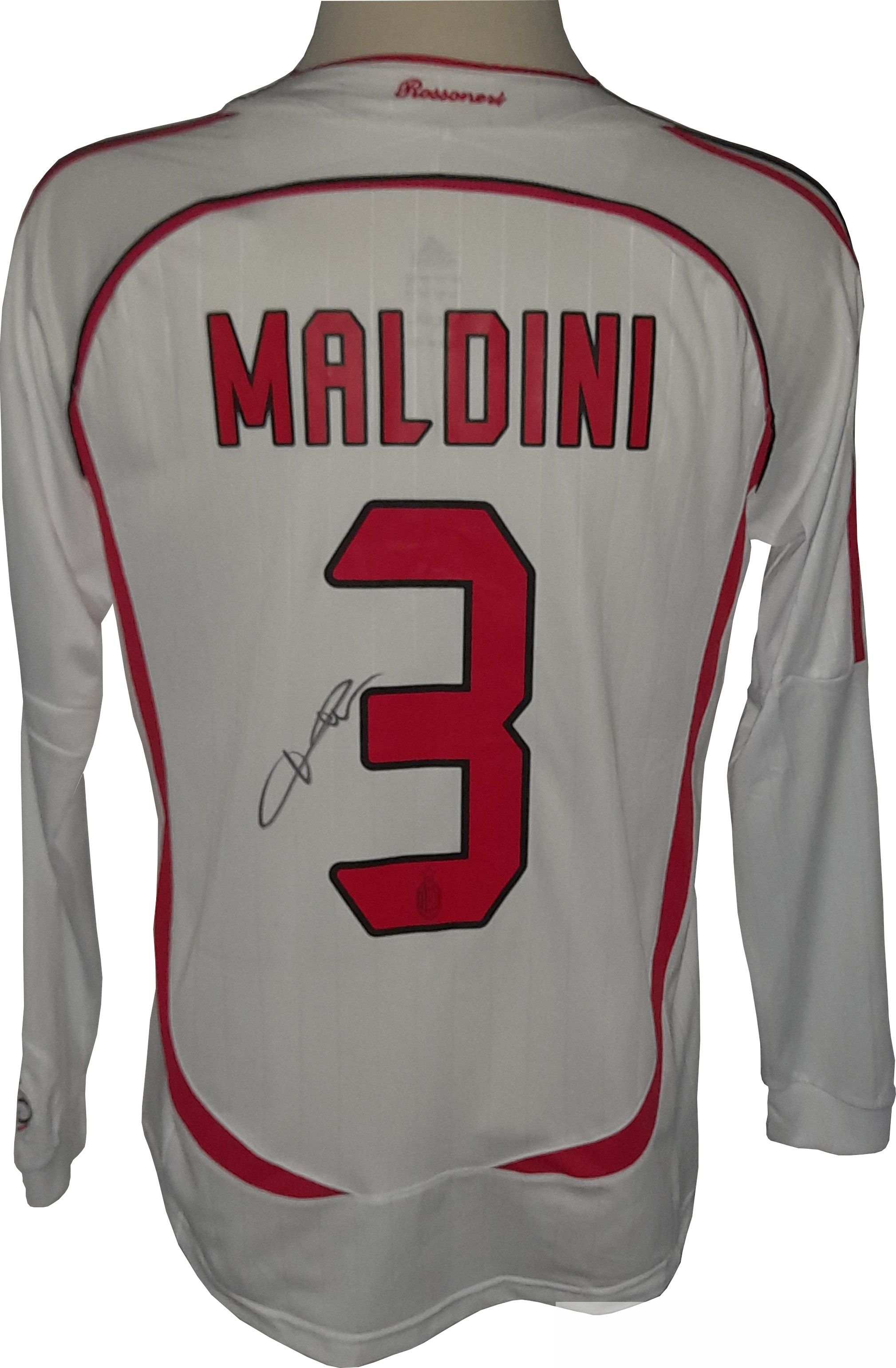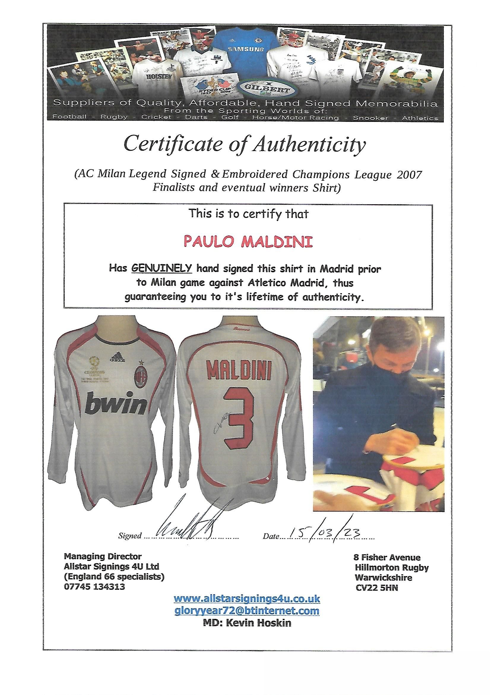 Paulo Maldini signed AC Milan 2007 Champions League finalists Athens 2007, a final they went on to win after beating Liverpool 2-1. Shirt is made by adidas in new condition, size large, with Paulo signing to rear below name by his shirt number, comes with COA and photograph proof from when he signing in Madrid prior to Milan match against Atletico
