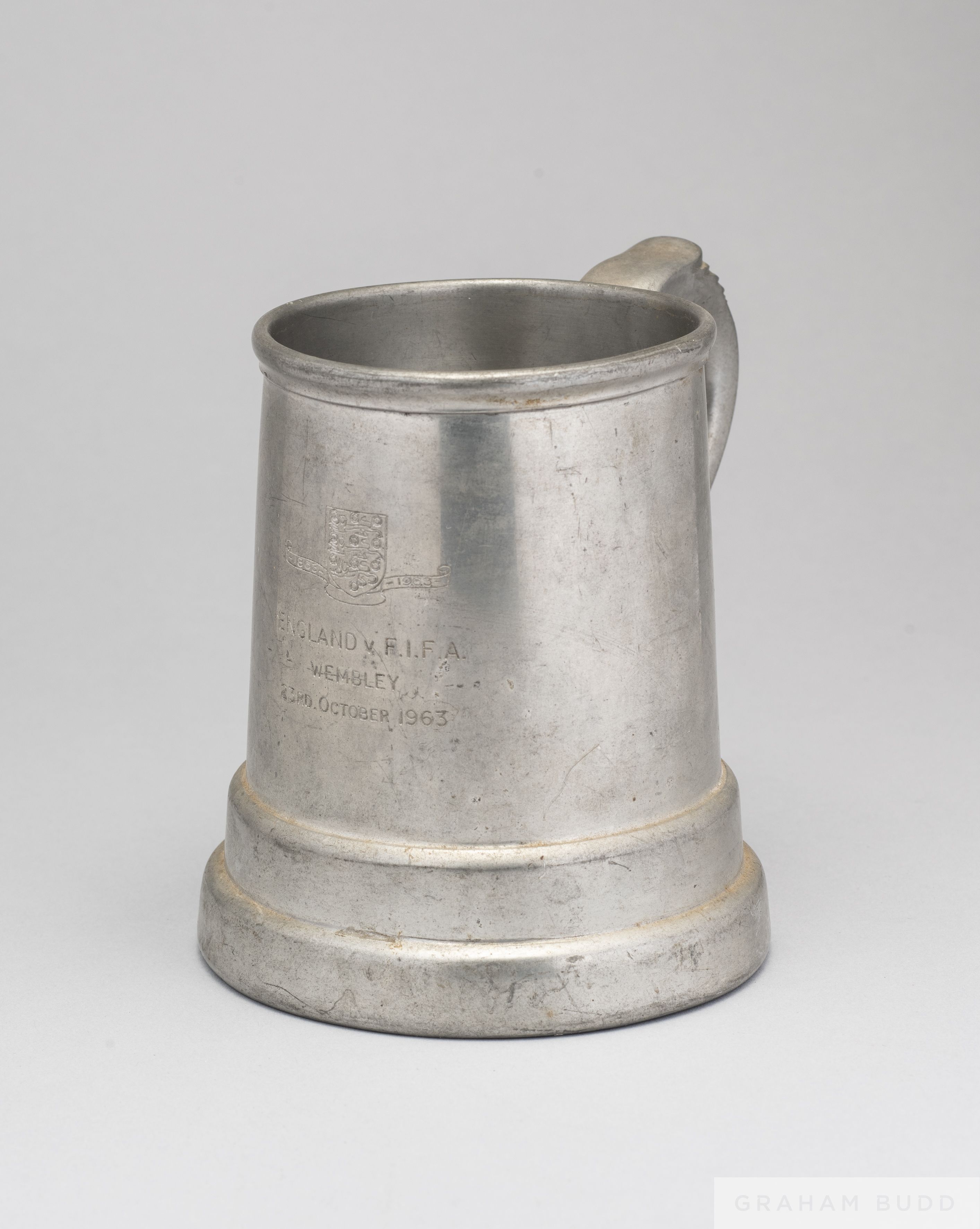 An England v. F.I.F.A. commemorative pewter tankard, 1963 inscribed ENGLAND V. F.I.F.A. WEMBLEY, 23rd October 1963, 12cm high