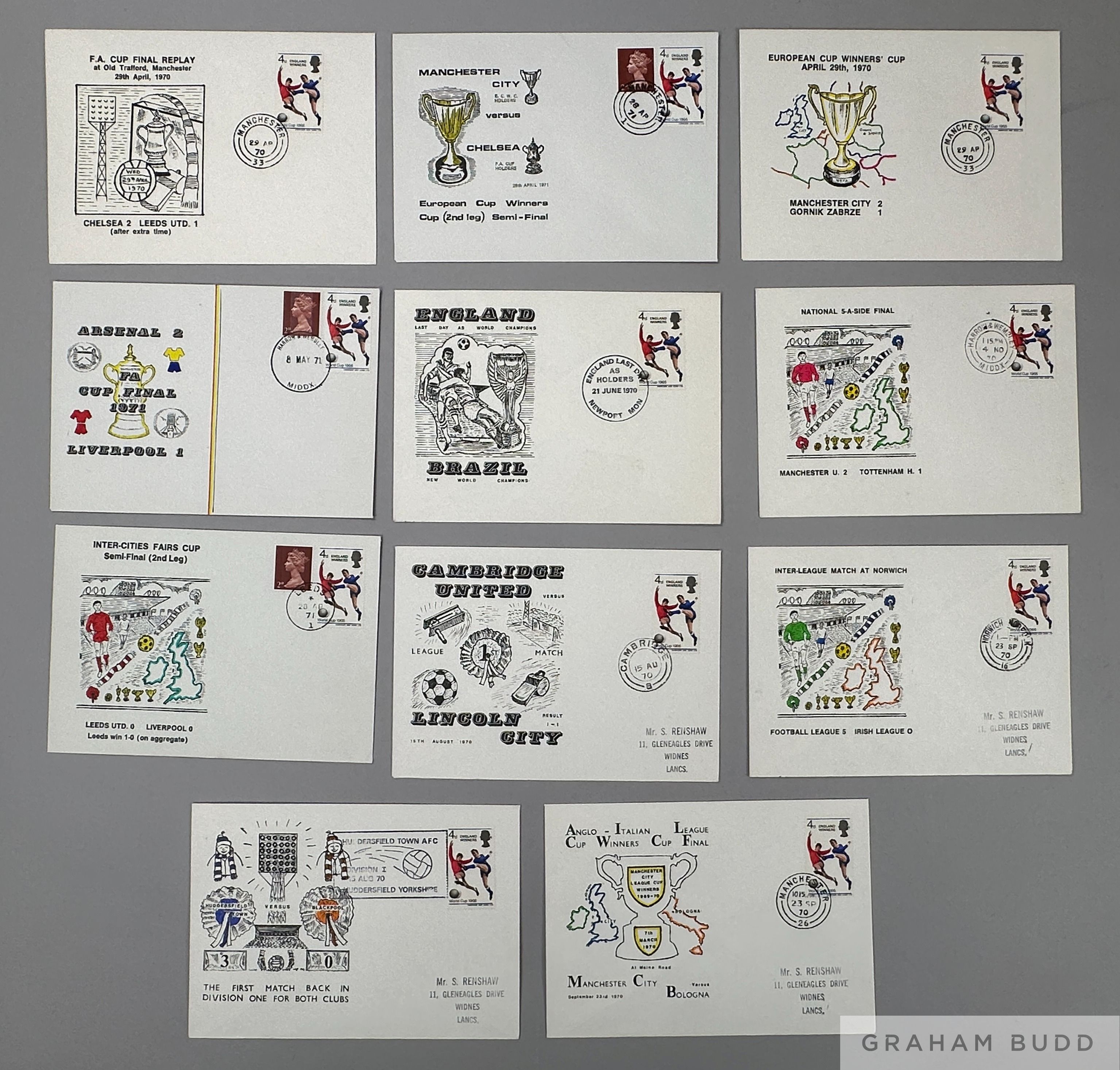 Dawn Covers pre-season of Football covers, this was an experimental series to see the possibility of producing the Football League series of covers in the future, 11 covers were produced, each had England's Winners stamp. Very few were produced of each cover in case of Manchester United v Tottenham Hotspur '5' a side; English League v Irish League; only 20 of each were produced, maximum for any individual card was 40. The 11 covers were as follows: PS1 Manchester City v Gornik, PS2 Leeds v Chelsea FAC/F replay, PS3 England last day World Cup holders, PS4 Huddersfield v Blackpool, PS5 Manchester City v Chelsea S/F ECWC, PS6 English League v Irish League, PS7 Leeds v Liverpool S/F Fairs Cup, PS8 Liverpool v Arsenal FAC/F 1971, PS9 Manchester United v Tottenham Hotspur 5 a side national, PS10 Manchester City v Bologna Anglo/Italian, PS11 Cambridge United first ever League match. These are individually very rare, unique as full set. In 1981 Dawn catalogue they had just auctioned a set for £300, (11)