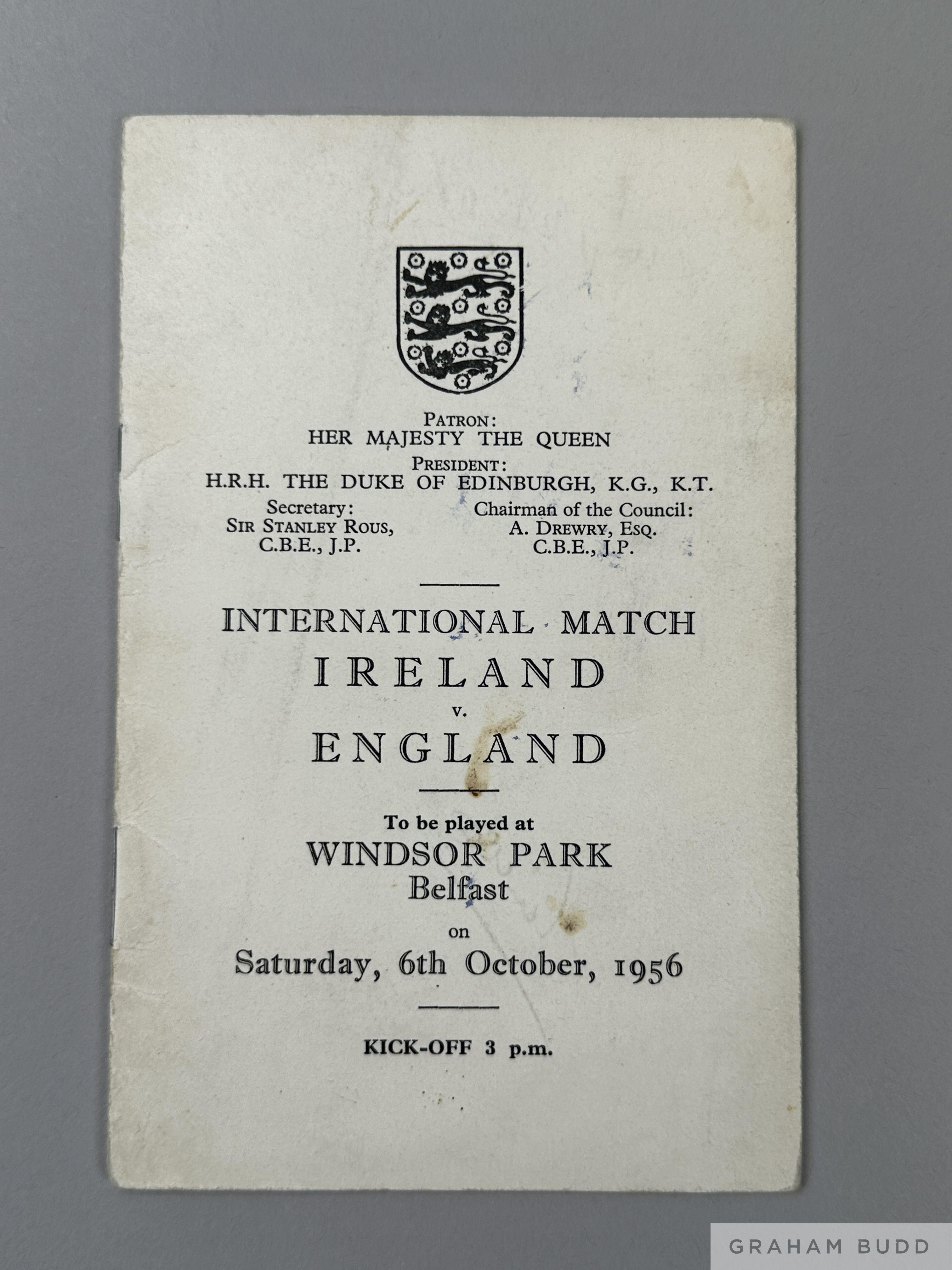 An England v Ireland player itinerary, from the game that took place at Windsor Park, Belfast on Sunday 6th October 1956 and signed in pen on the inside cover by 13 of the England squad including Duncan Edwards, Stanley Matthews and Billy Wright. The itinerary is in excellent condition with some slight marking to the front along with age related dirt marks to the cover. Provenance: From the collection of Colin Grainger