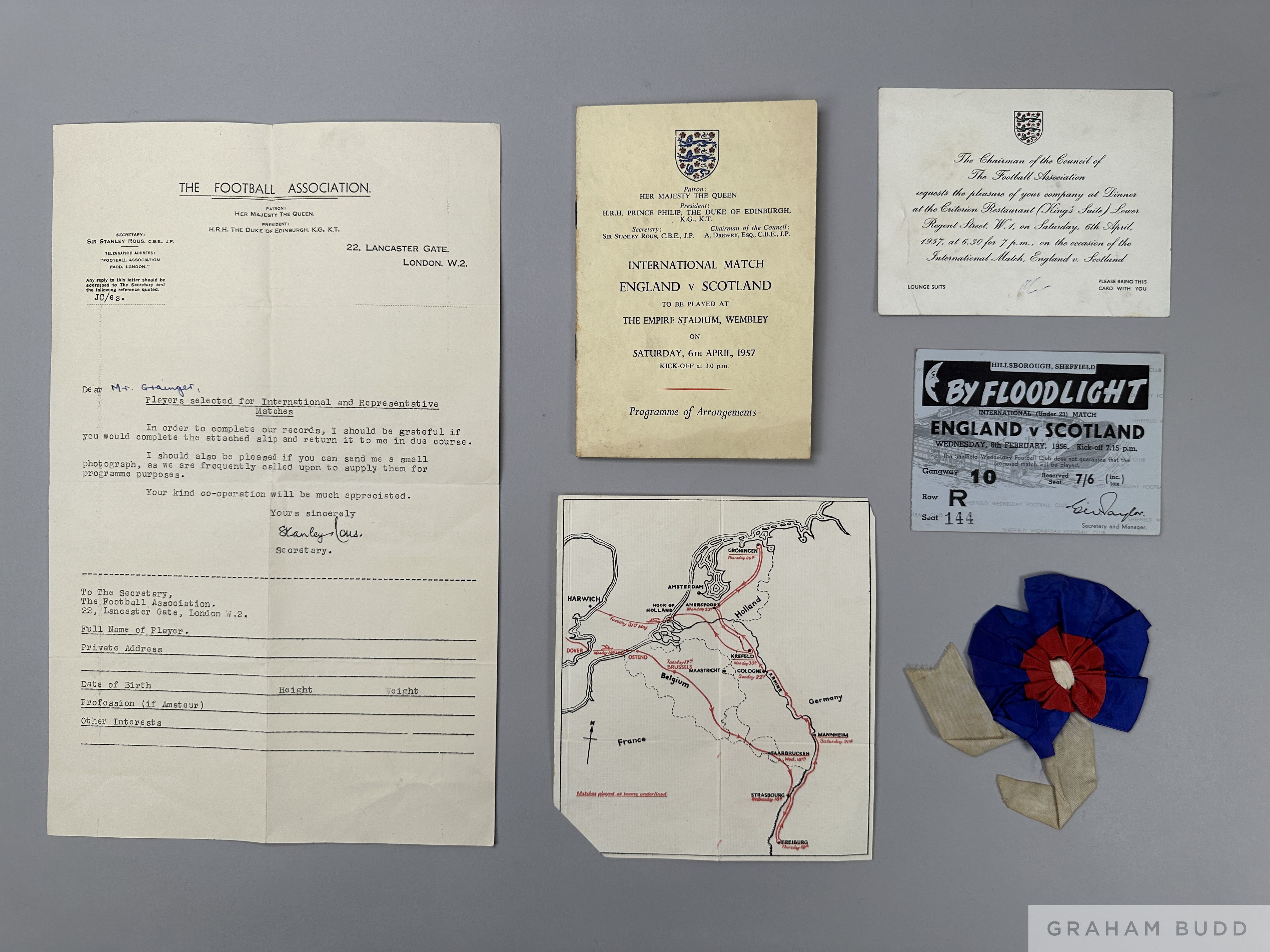 England v Scotland handbook for the game at Wembley on 6th April 1957, along with an FA Letter, an Invitation to the post inner for the game, an England rosette and a ticket for the England v Scotland U23 game at Hillsborough on February 8th 1956 and a directional map issued to players for Holland, (qty) The condition of the items is generally good with some slight rusting to the staples of the itinerary and some small marks to the invitation in pen. Provenance: The Grainger family
