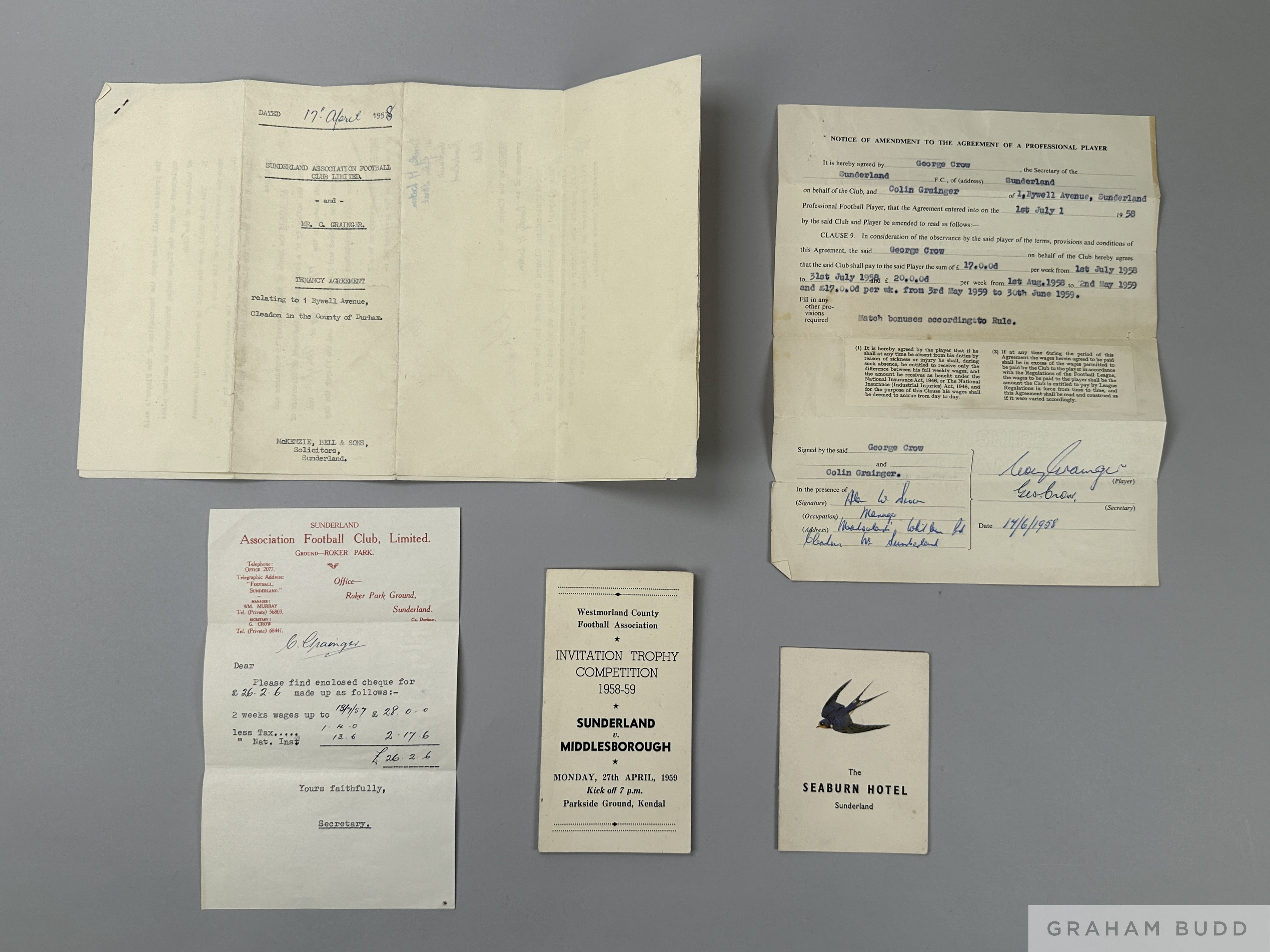 A nice selection of items relating to Colin Grainger's career at Sunderland AFC, including an amendment to his contract agreement from July 1st 1958, a receipt in respect of wages on Club headed paper, an invitation and menu to the Westmoreland County Football Association competition 27th April 1958/9, a tenancy agreement for the Club house and a room confirmation for the Seaburn Hotel Sunderland, (qty) Provenance: The Grainger family.