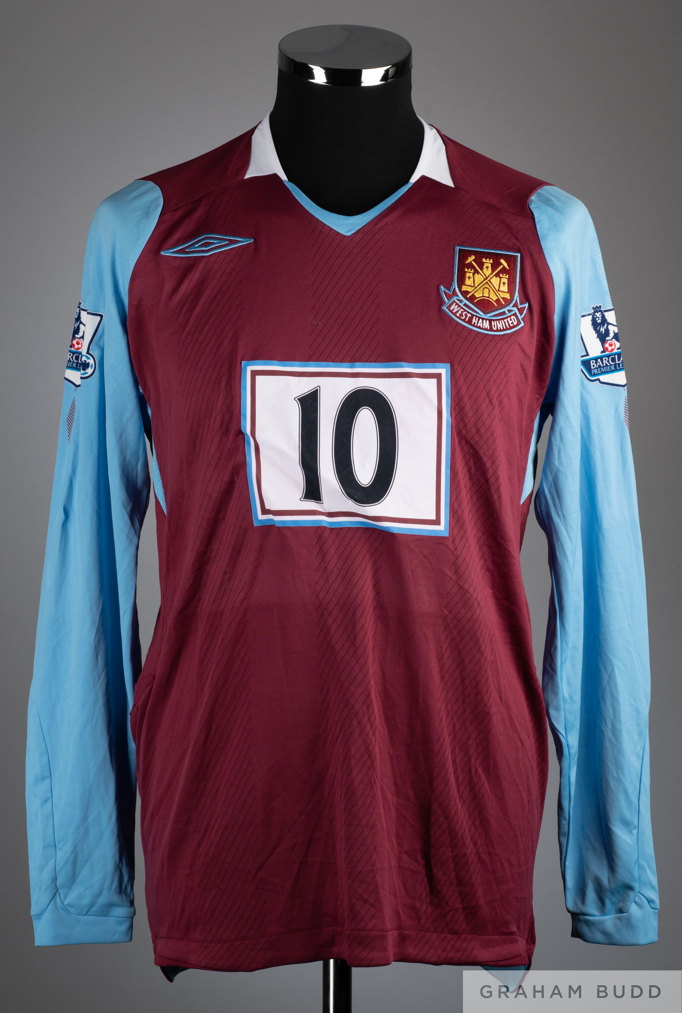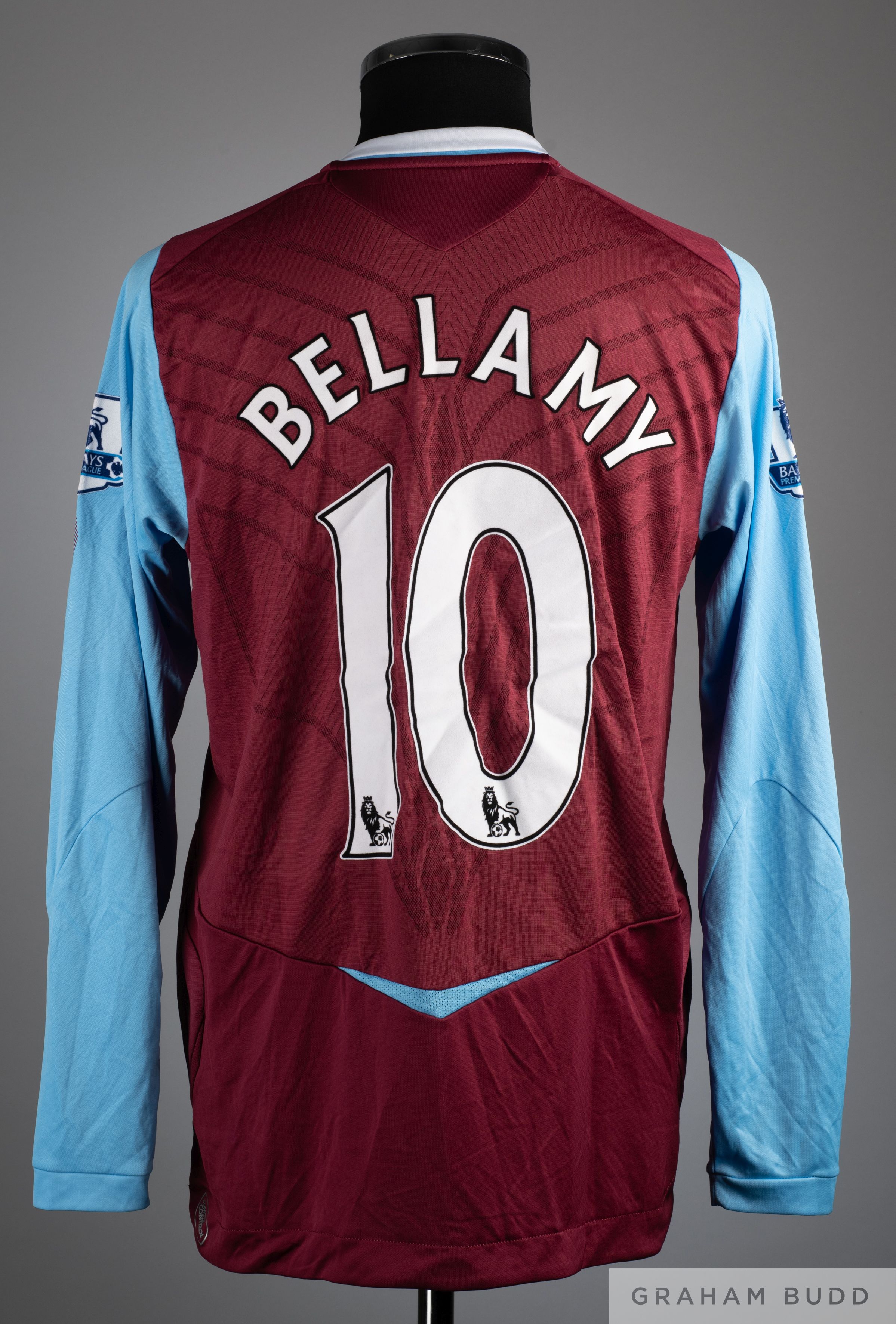 Craig Bellamy claret and blue West Ham United no.10 long sleeved shirt, 2008, Umbro size M, crew neck with embroidered cloth badge inscribed WEST HAM UNITED, reverse lettered BELLAMY and the sleeves have the Barclays Premier League flashes. The squad number replaced the sponsor on the shirt from September to December 2008.