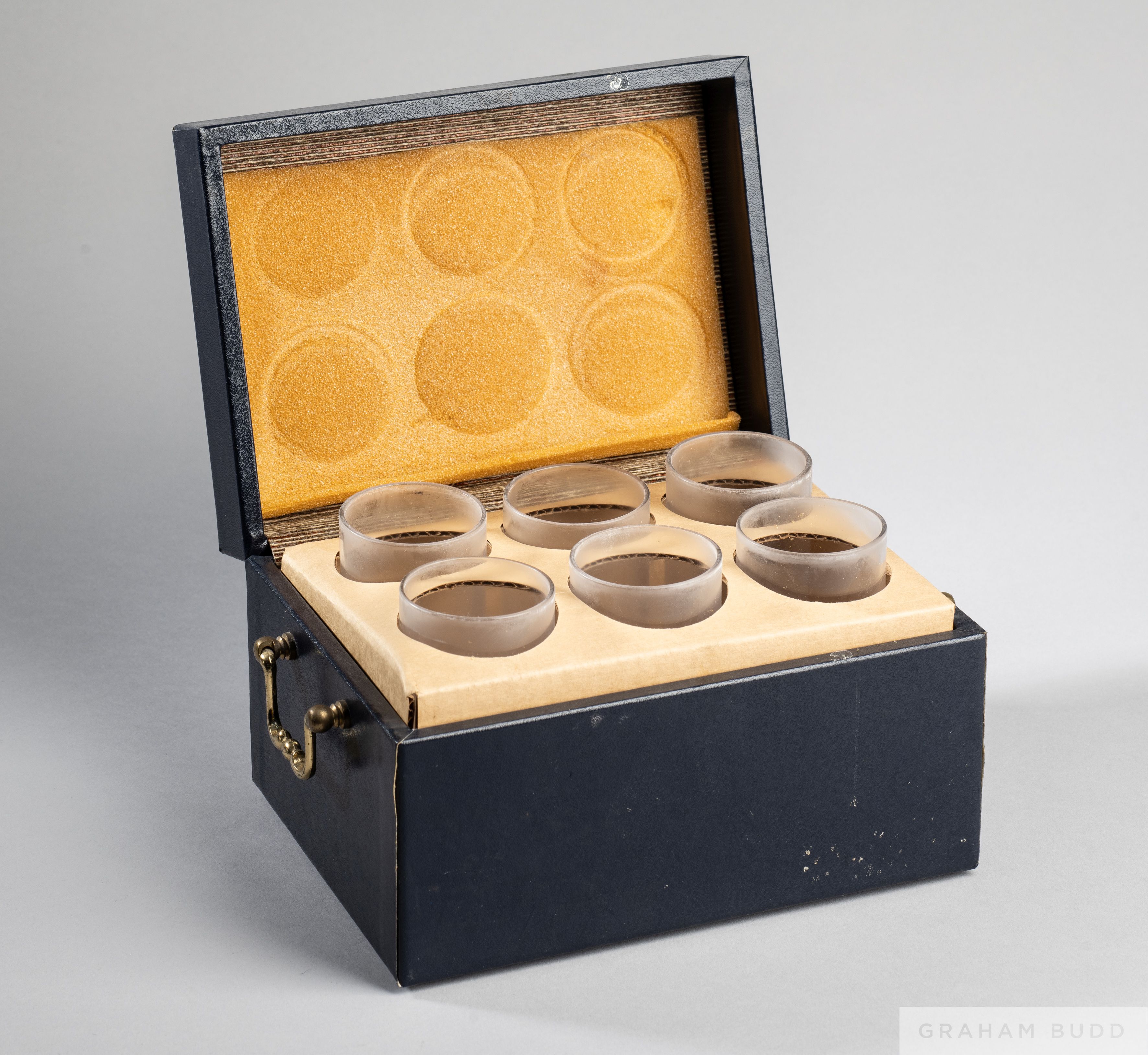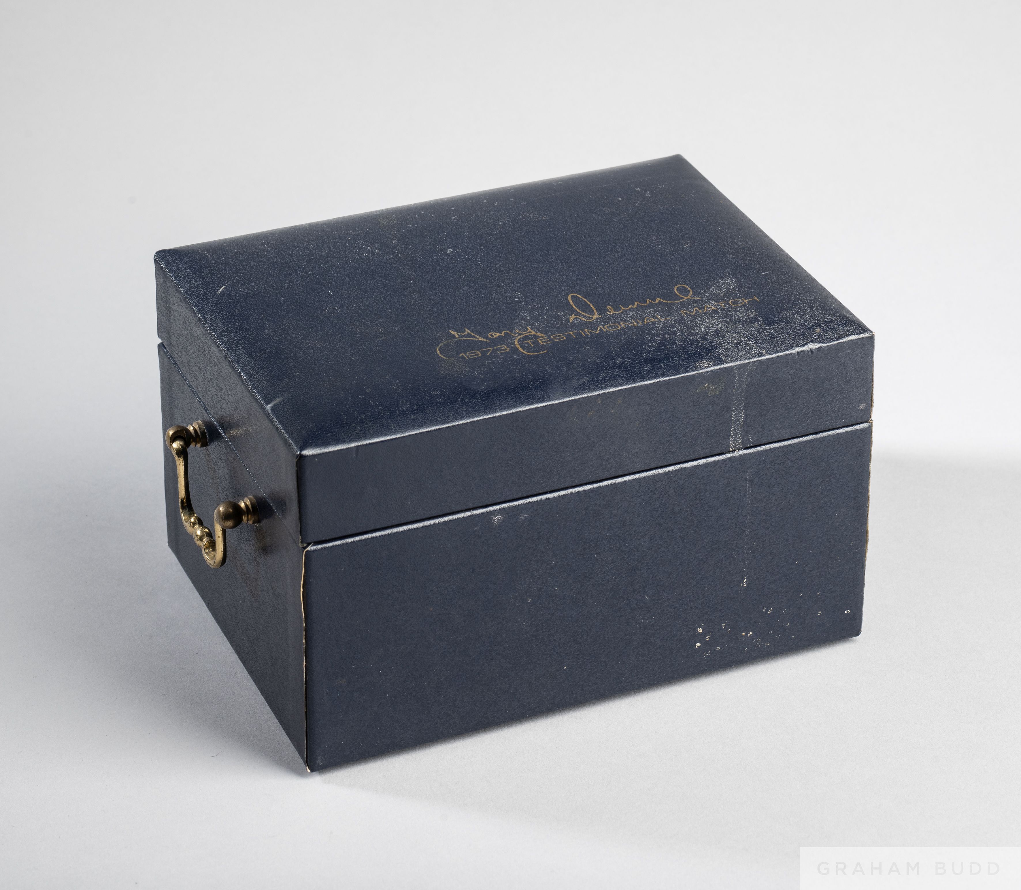 Manchester United Tony Dunne 1973 Testimonial Match souvenir drinking glasses set, comprising a set of six shot glasses each bearing a silver sticker stamped, ROYAL, SWEDISH, in blue leather cover box with gilt carrying handles, the cover stamped gilt with Tony Dunne's facsimile signature and inscribed 1973 Testimonial Match, good condition other than in need of a clean Tony Dunne's Testimonial was played at Old Trafford 24th October 1973 between Manchester United and Manchester City