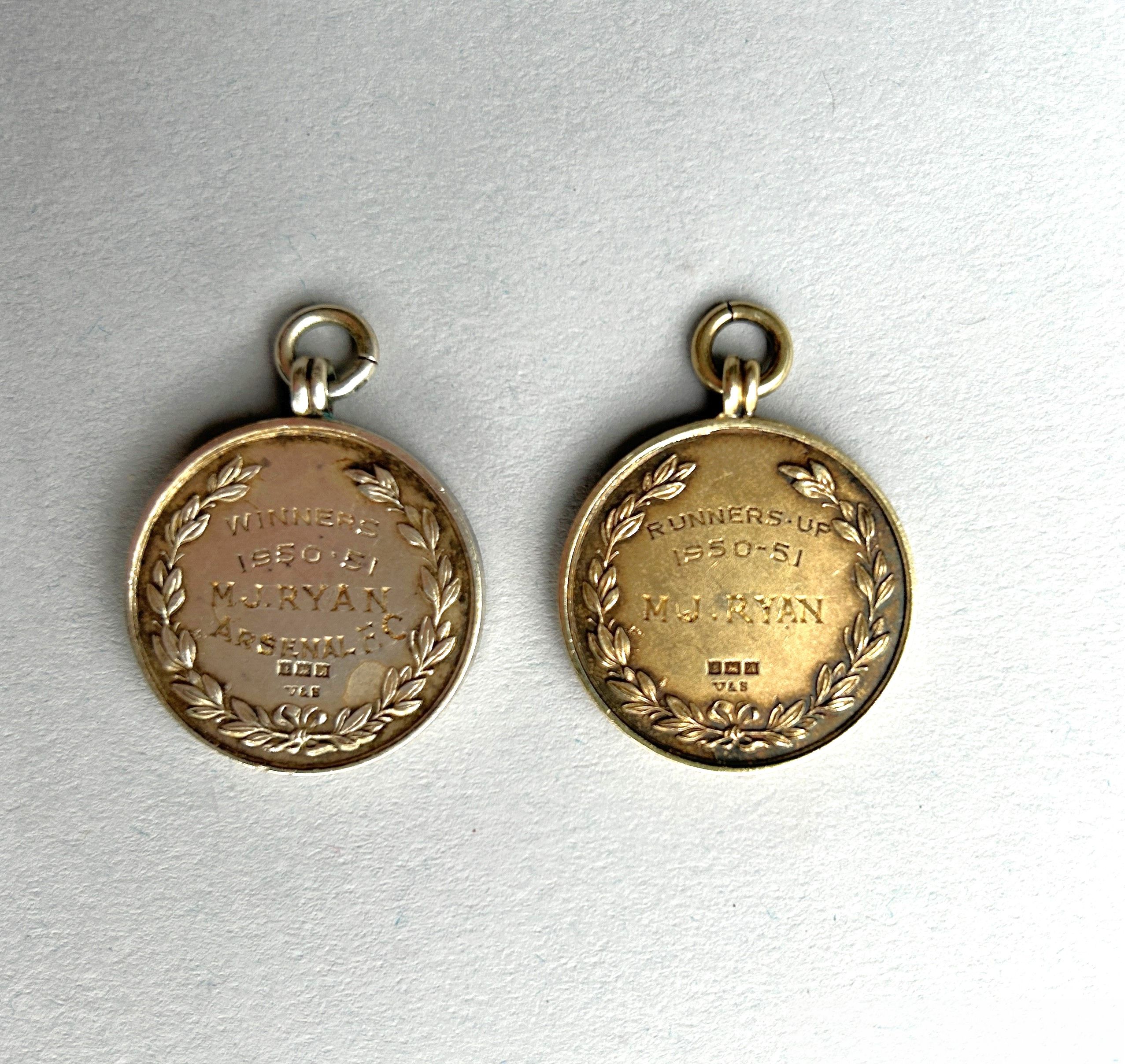 M.J. Ryan pair of silver-gilt Arsenal medals comprising Football Combination League Champions winners medal, 1950-51 the obverse inscribed THE FOOTBALL COMBINATION, LEAGUE CHAMPIONSHIP, the reverse inscribed WINNERS 1950-51, M.J. RYAN, Arsenal F.C. with ring suspension and a silver-gilt Football Combination Cup runners-up medal, the obverse inscribed FOOTBALL COMBINATION CUP COMPETITION, the reverse inscribed Runners-up, 1950-51, M.J. Ryan (2)