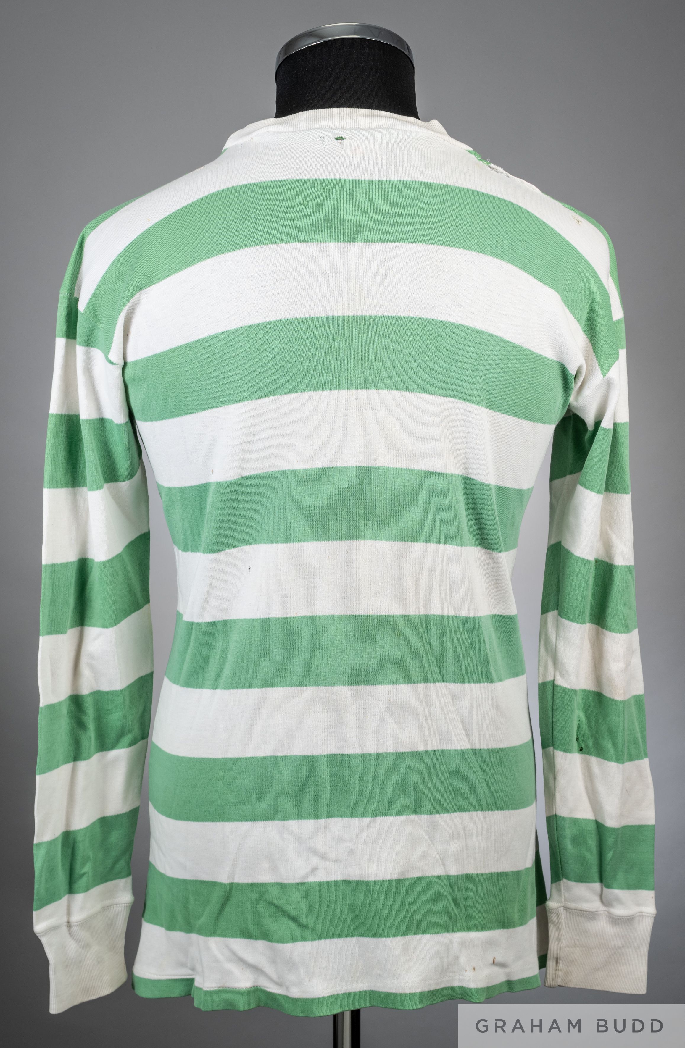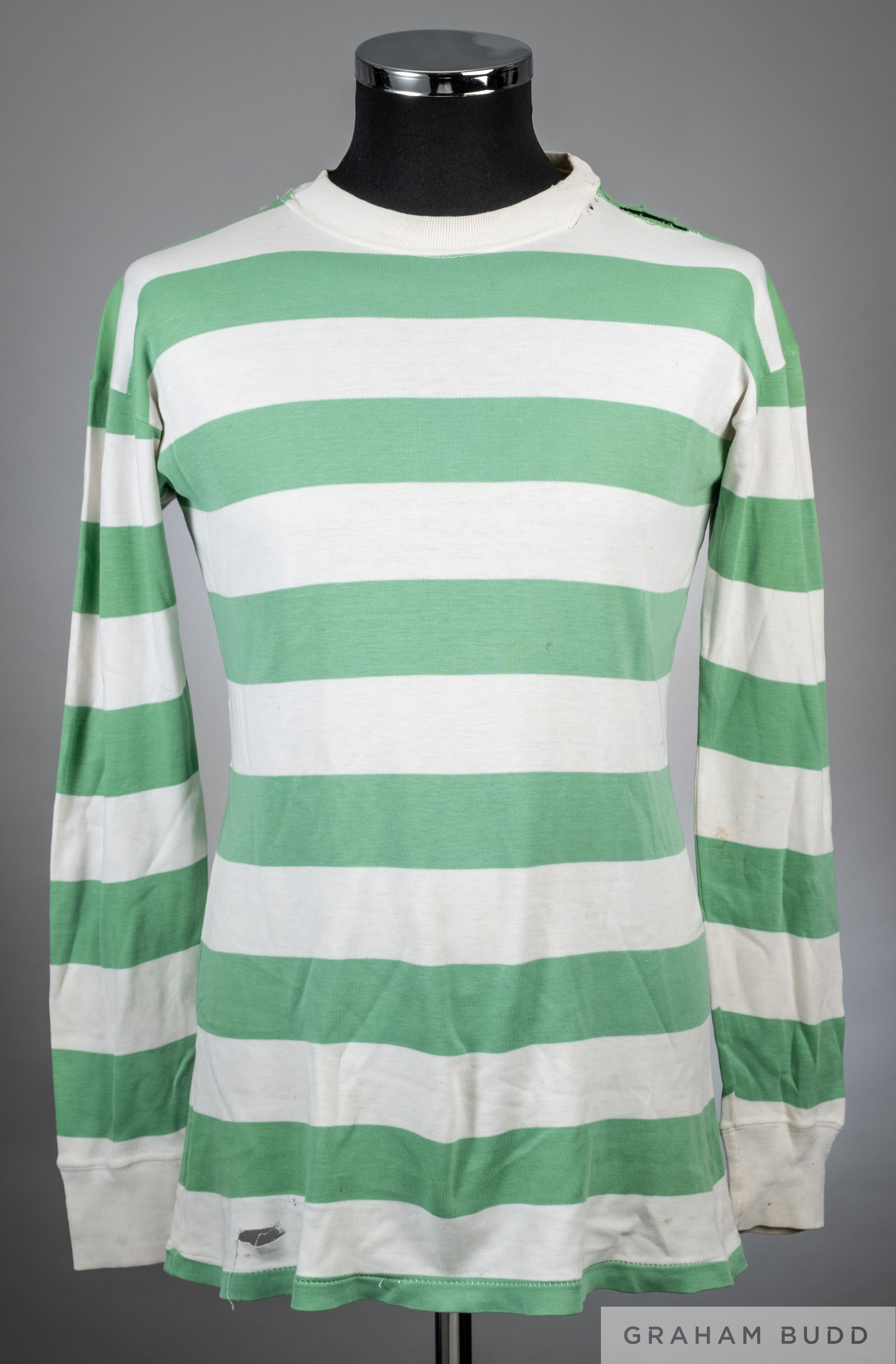 Tommy Gemmell green and white Celtic 1970 match worn shirt, Umbro, long-sleeve with crew-neck collar Two-inch tear on left shoulder and further hol