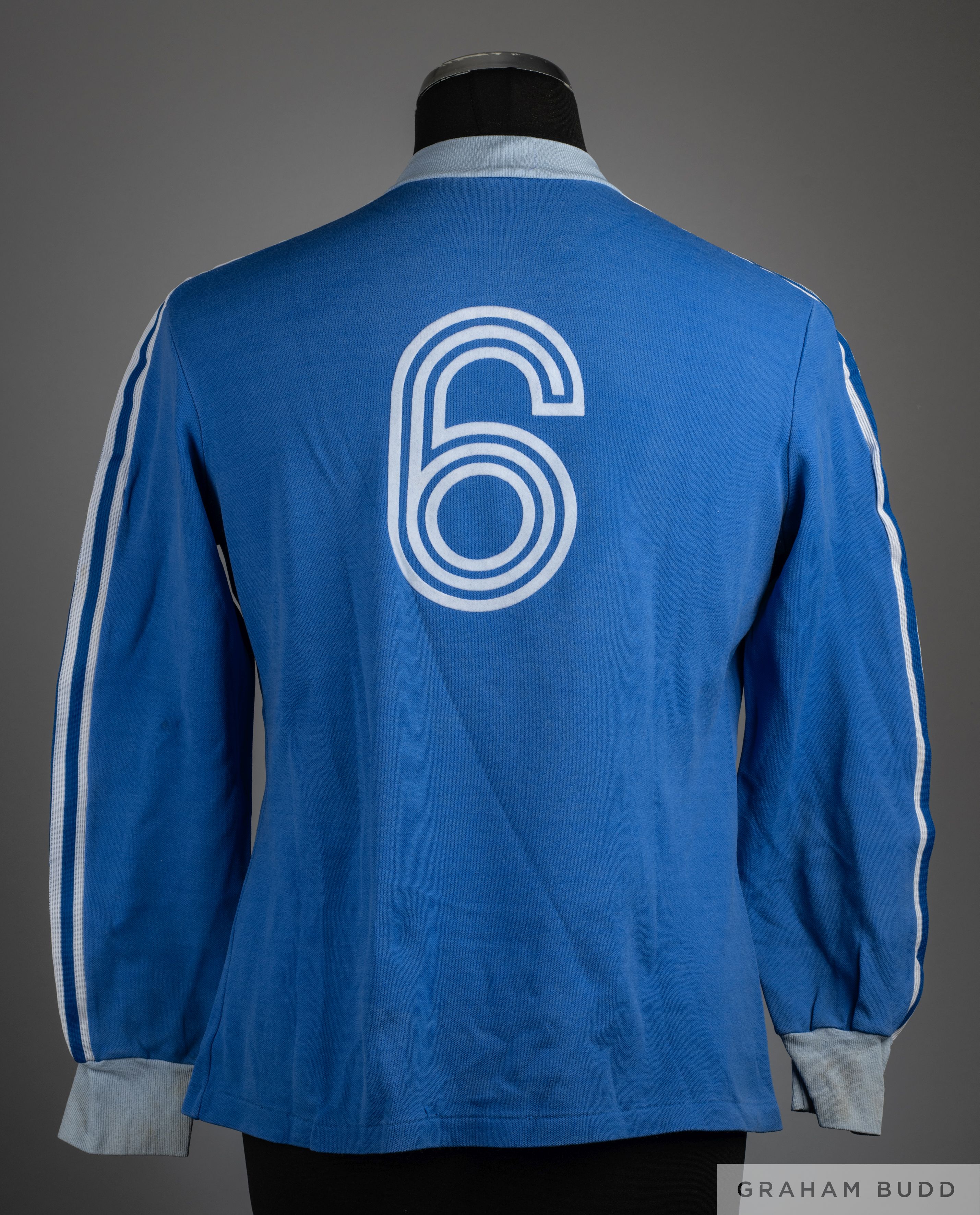 Blue No.6 SC Bastia long sleeved shirt, circa 1970s Adidas, no size specified, crew neck with large central badge and remains of Adidas logo on front