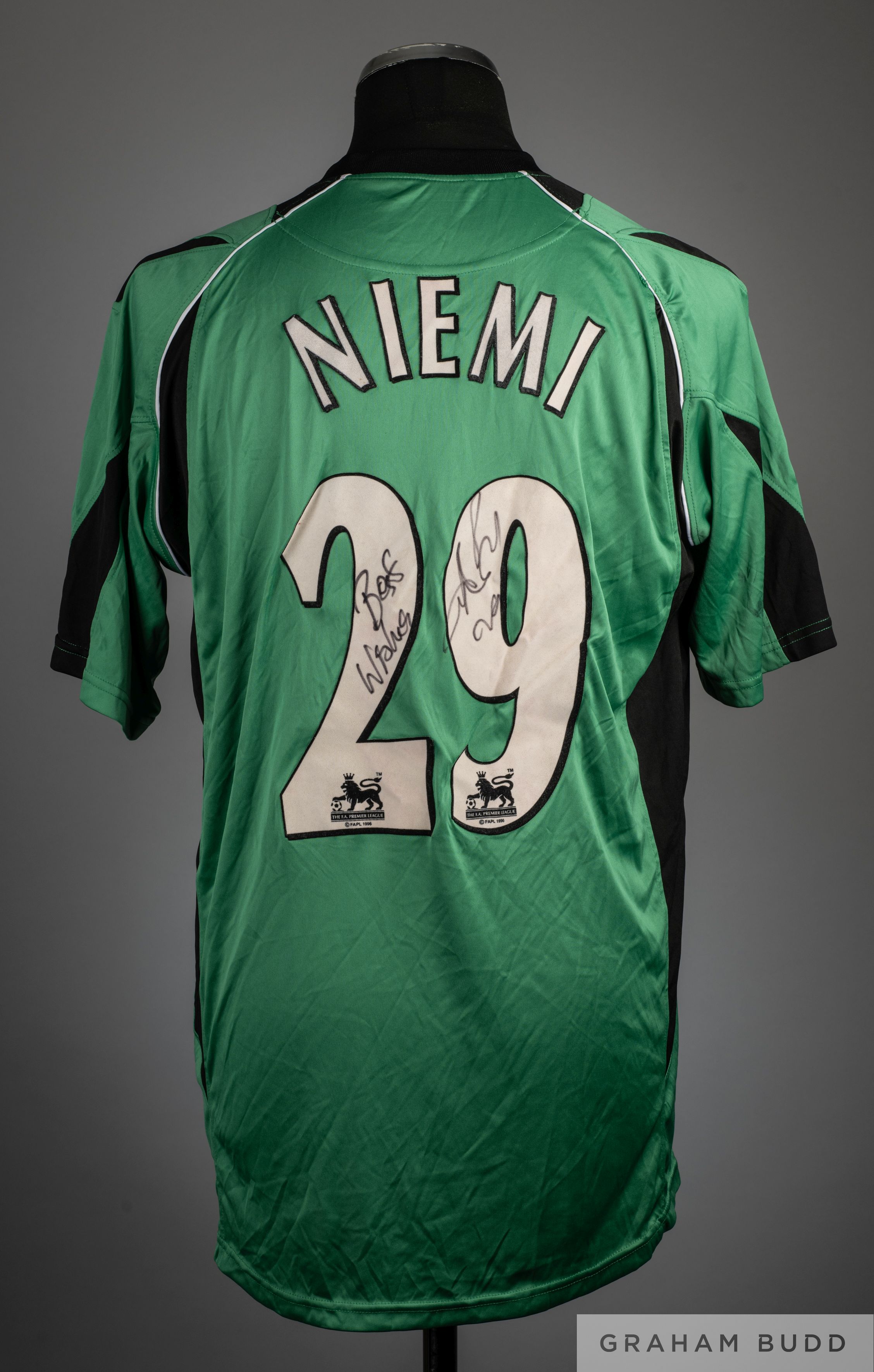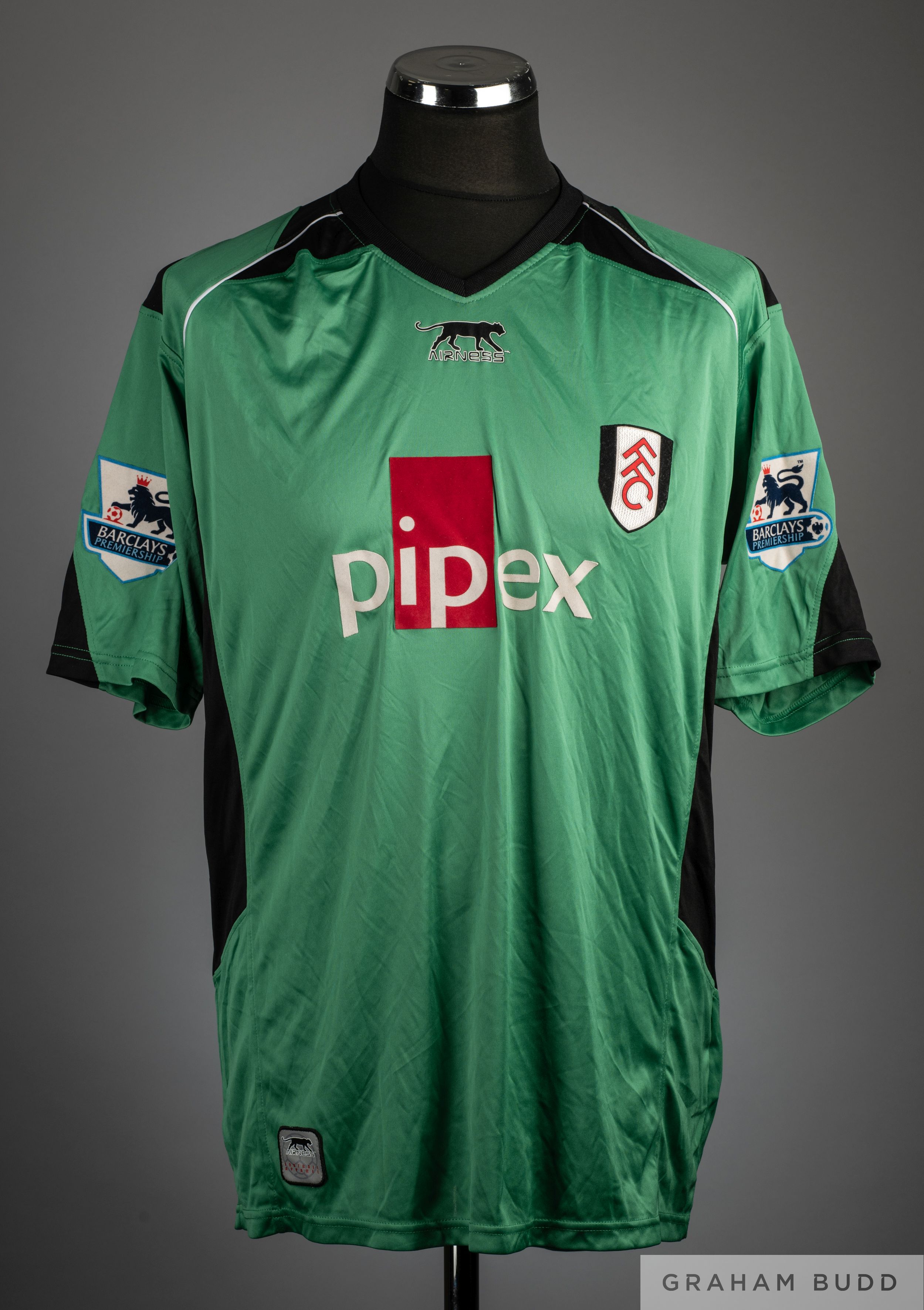 Antti Niemi signed green and black No.29 Fulham goalkeepers short-sleeved shirt, 2006-07, Airness, XXL, with v-neck collar and embroidered cloth badge inscribed FFC, the reverse lettered NIEMI, the reverse also autographed by Niemi, the sleeves with Barclays Premiership flashes
