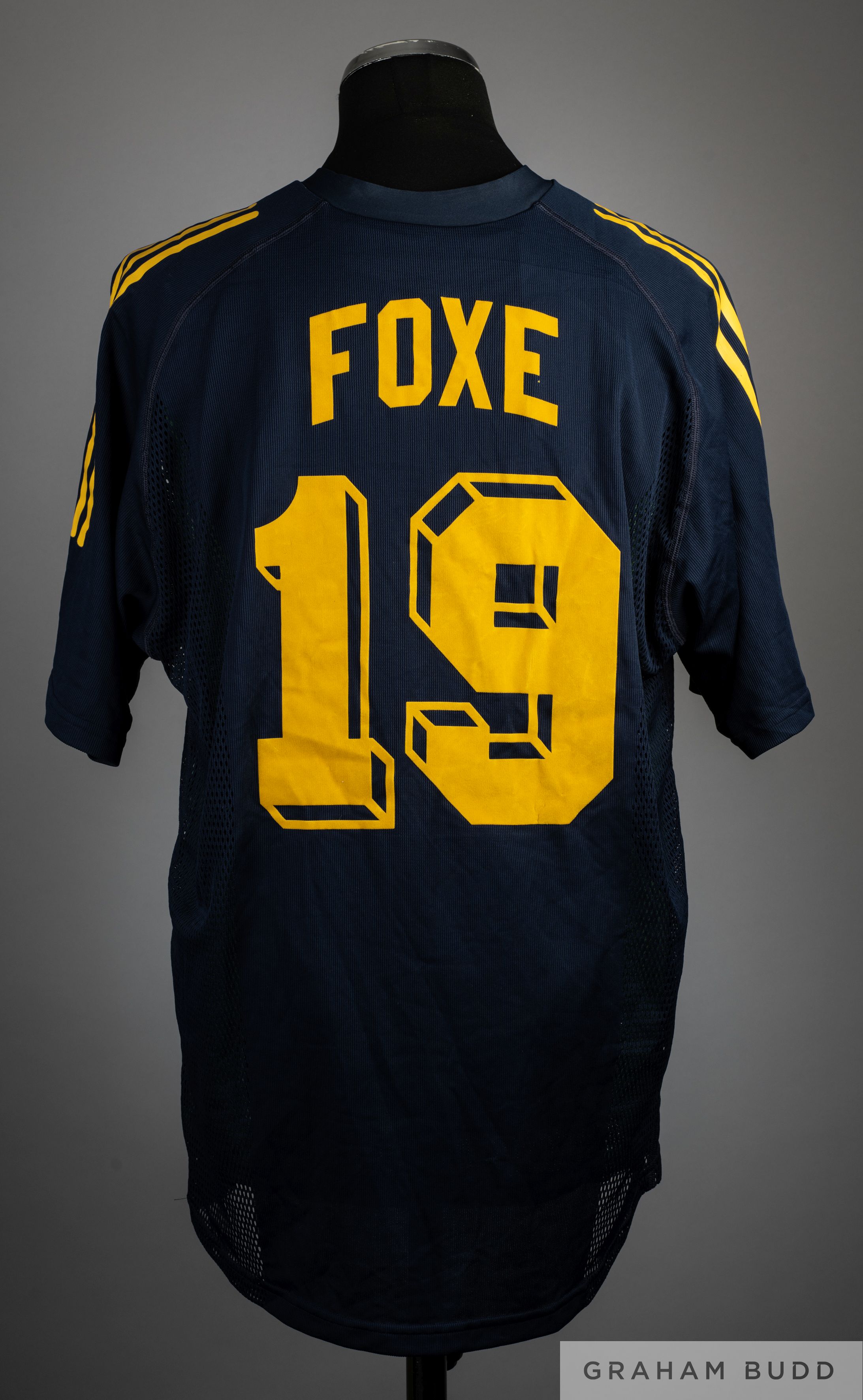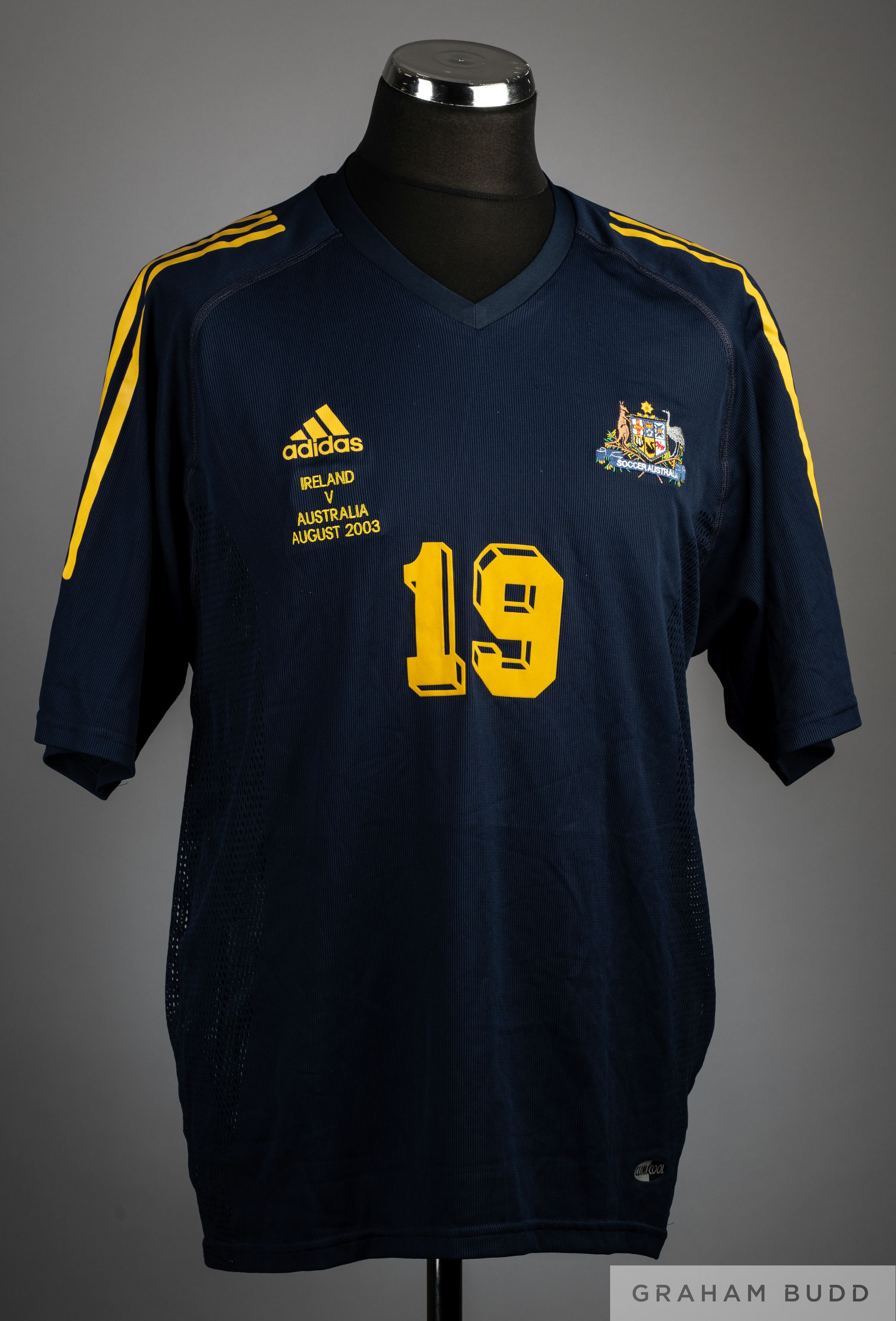 Hayden Foxe blue and yellow No.19 Australia v. Ireland short-sleeved shirt, 2003, Adidas, XL, with v-neck collar and embroidered badge inscribed SOCCER AUSTRALIA, IRELAND V. AUSTRALIA AUGUST 2003, the reverse lettered FOXE