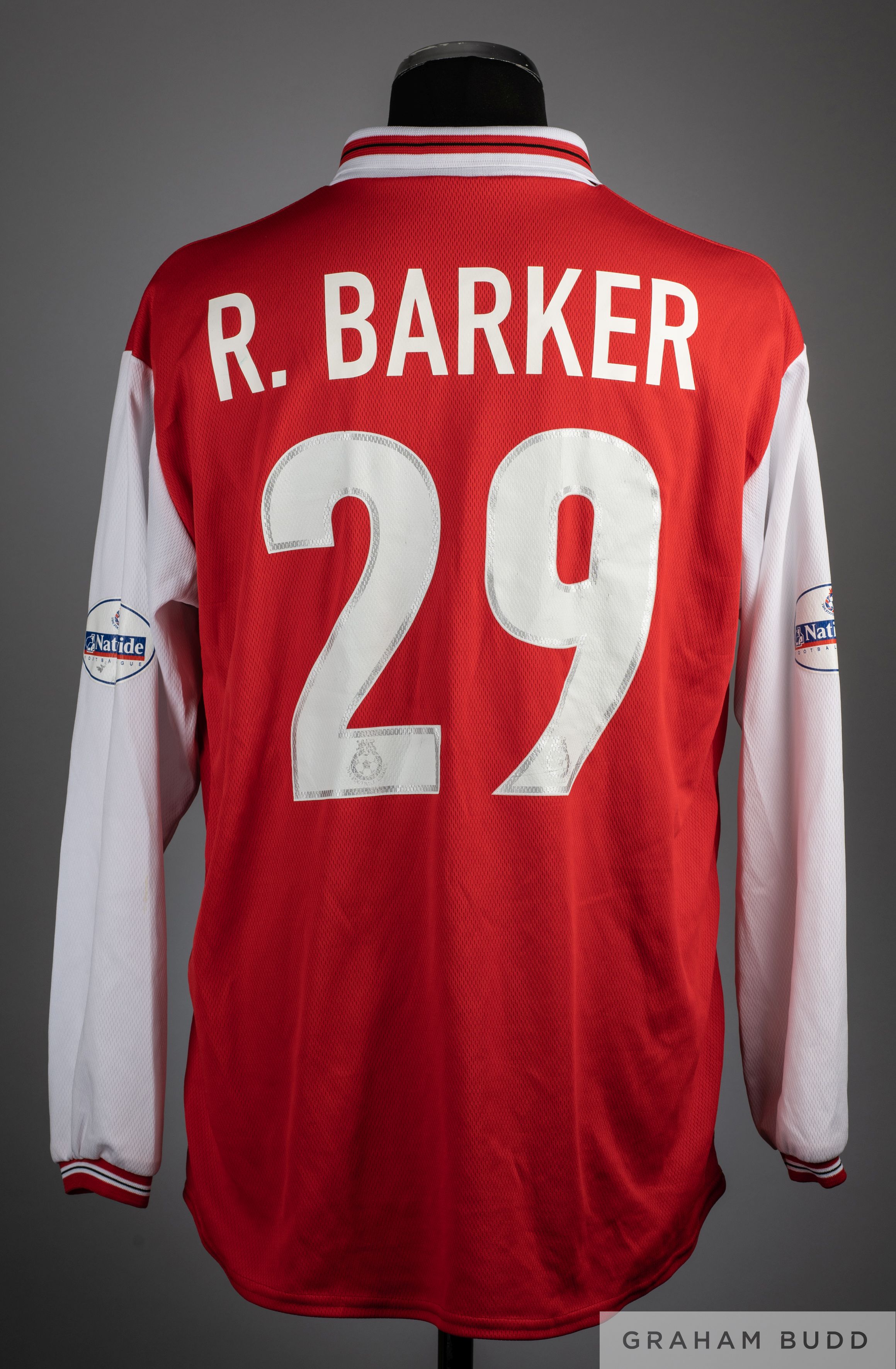 Richie Barker red and white No.29 Rotherham United long-sleeves shirt, 2002-03, Bodyline, XL, with v-neck collar and embroidered badge inscribed ROTHERHAM UNITED F.C., RUFC, the reverse lettered R. BARKER, the sleeves with Nationwide Football League flashes