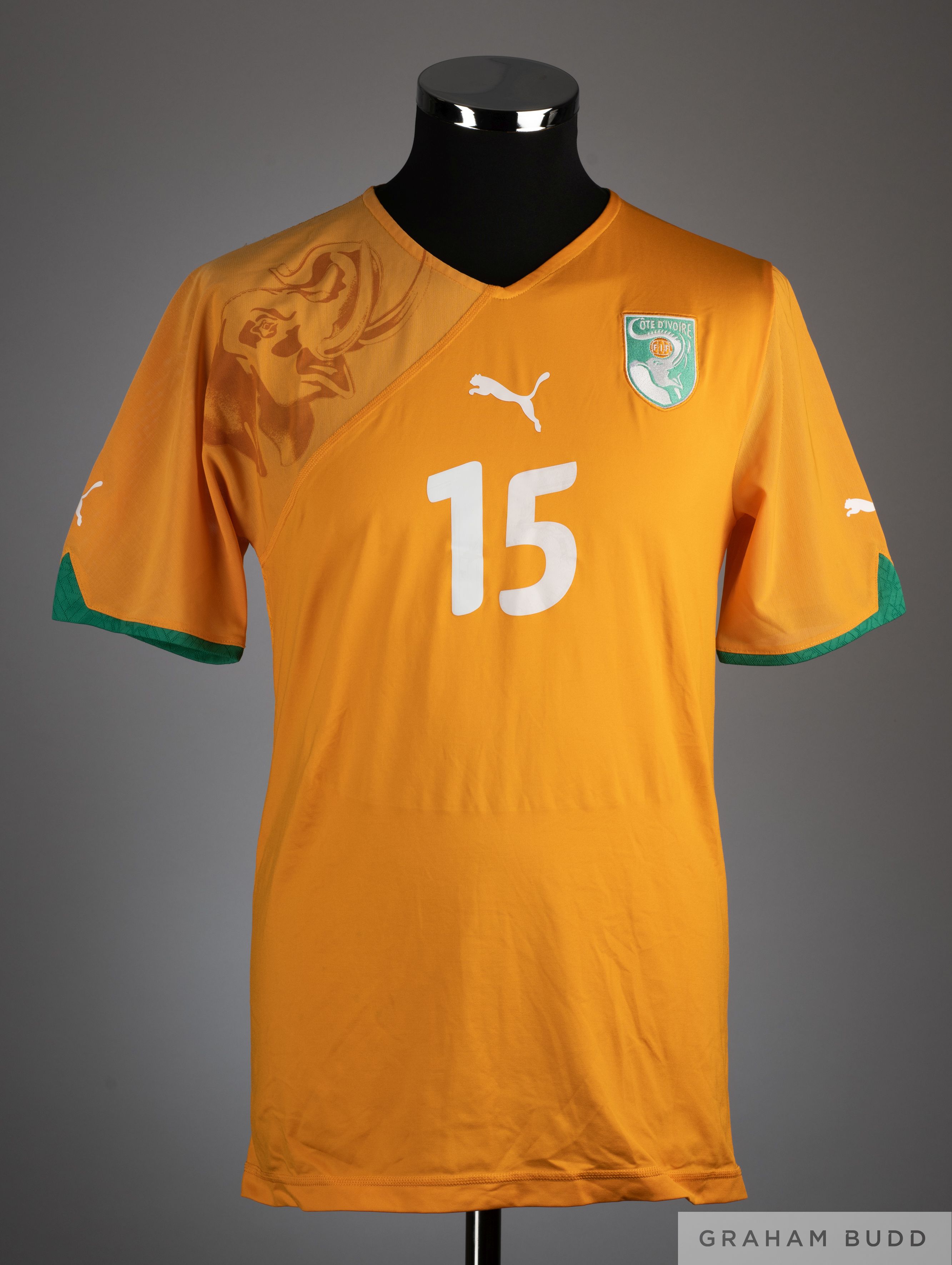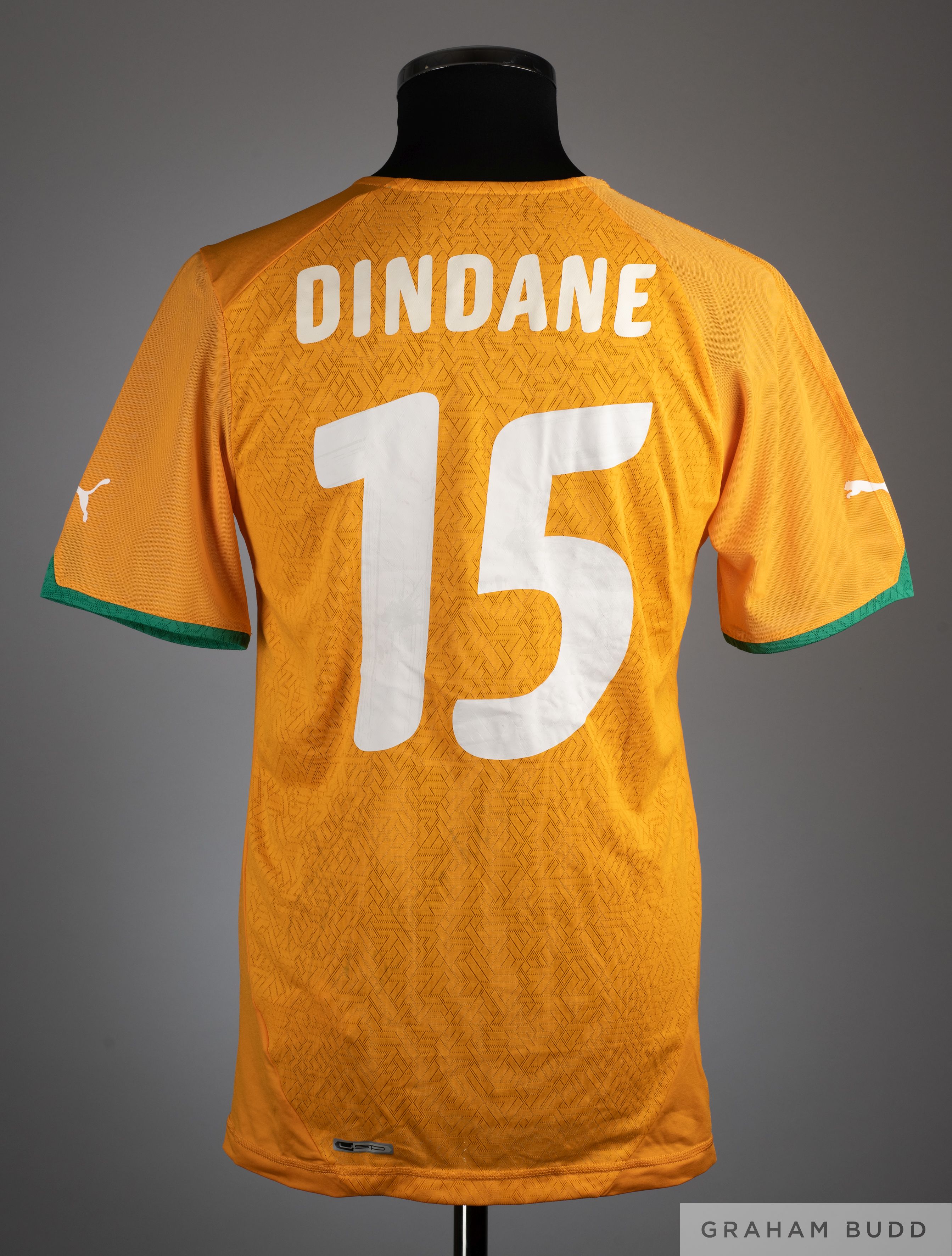 Aruna Dindane No.15 orange Ivory Coast short sleeved shirt, 2009-10, Puma, size L, v-neck with embroidered cloth badge, reverse lettered DINDANE and the Puma Flash on the right sleeve.