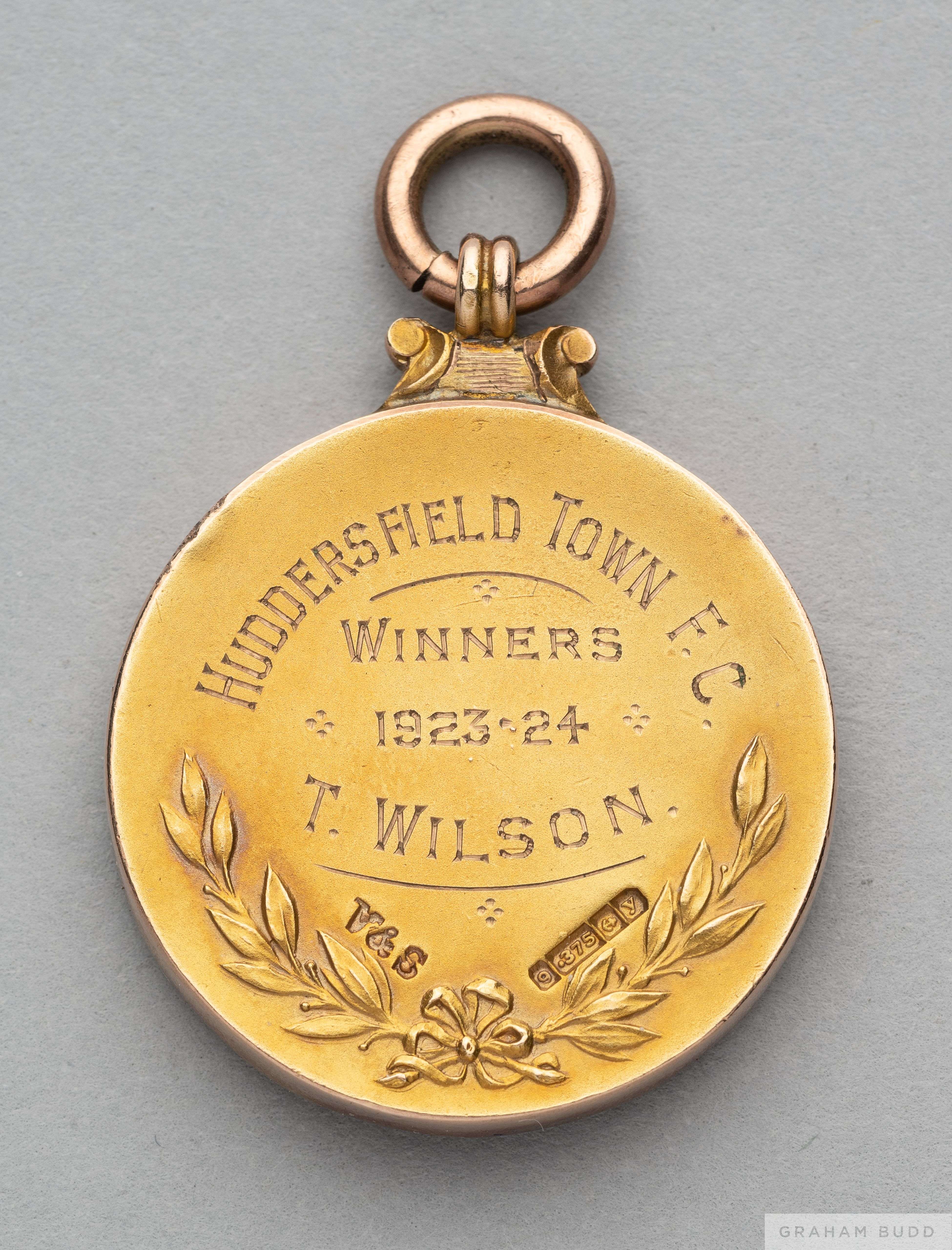 Tom Wilson 9ct gold Division 1 League Championship Winners medal the obverse inscribed THE FOOTBALL LEAGUE, CHAMPIONS DIVISION 1, the reverse inscribed HUDDERSFIELD TOWN F.C., WINNERS, 1923-24, T. WILSON, with ring suspension in original fitted case, 26grms Huddersfield Town won their first-ever Division 1 League Championship this season and the first of their history making three in-a-row League wins with 57 points, Cardiff City being runners-up also on 57 points. In the last league matches of the season The Terriers defeated Nottingham Forest 3-0 whilst Cardiff their title rivals could only draw with 0-0 with Birmingham City failing to convert a penalty, thus making the 1923-24 season the closest finish in the competition's history, both clubs finishing on the same points tally but Huddersfield Town winning the title by just 0.024 on goal average. The following lots 902 to 943 relate to the career of Huddersfield Town Legend and England International Tom Wilson. PROVENANCE: Tom Wilson thence by family descent Tom Wilson Huddersfield Town 1919-31 Few players outrank Tom Wilson in the Huddersfield Town hall of fame. As a key player in three times Division 1 Championship winning teams, as well as during numerous FA Cup campaigns, Tom’s consistency at the heart of Town’s defence during the glory years of the 1920’s was exceptional and indispensable and established him as more than just a favourite on the Leeds Road terraces. A centre-half of exceptional skill he was an automatic first team choice during his 12 years at Huddersfield. Known as the ‘Gentleman of Football’, his reliability gave him over 500 appearances for Town, missing only a handful of games throughout his stay. Tom's is a true ‘rags to riches’ story. Born and raised in Seaham, County Durham he first played for Seaham Boys before going to Seaham Colliery to work down the pit. He played for Seaham Colliery before being joining Sunderland in 1914. The First World War intervened in his career before he had the chance to establish himself in Sunderland’s first team. He joined up and received the Military medal for Bravery in the Field before coming home from the war. He played one more game for Sunderland before being released by them (he had put on weight whilst in service). Fortunately, he was spotted playing for Sunderland by a scout from Huddersfield and was approached by them. He joined Town in 1919 when they were at their lowest point, struggling in Division 2 with huge debts. They were on the brink of collapse, indeed an arrangement to amalgamate the club with Leeds United had been made! Tragedy was averted however, and this became the springboard for success for the next decade. At the end of the 1920 season Huddersfield were promoted from Division 2, finishing runners-up. Over the next 5 years Huddersfield Town became the most successful club in England. Herbert Chapman became Manager in 1920/21 and masterminded an FA Cup win, 2 FA Cup final defeats and three consecutive Division 1 Titles as well as 2 Runners-up places, an amazing achievement. Tom Wilson captained Huddersfield throughout most of this period and made 52 successive FA Cup appearances, a club record. He captained Huddersfield to their only FA Cup triumph, beating Preston North End 1-0 at Stamford Bridge in 1922. Tom Wilson established himself as one of the best defenders in England though he only represented his country once, in 1928 against Scotland. He did however earn Football League honours. Tom Wilson is beyond doubt one of the greatest players ever to pull on a Town shirt and is in a select number of Huddersfield Town players who can truly be called ‘greats’. In 1931, Tom joined Blackpool for one season, helping them to avoid relegation. He also coached Barnsley before his death in 1948 at the age of 51.