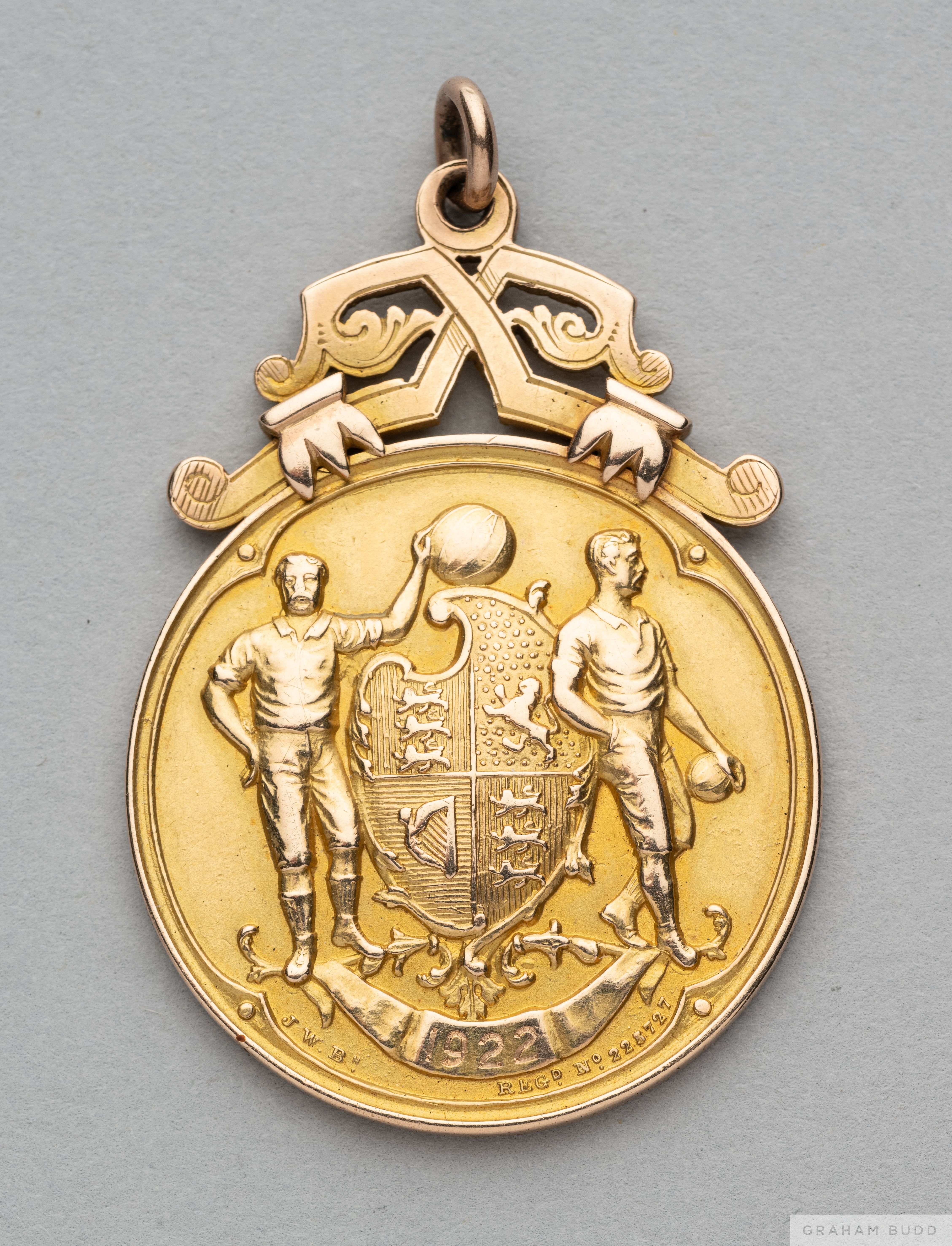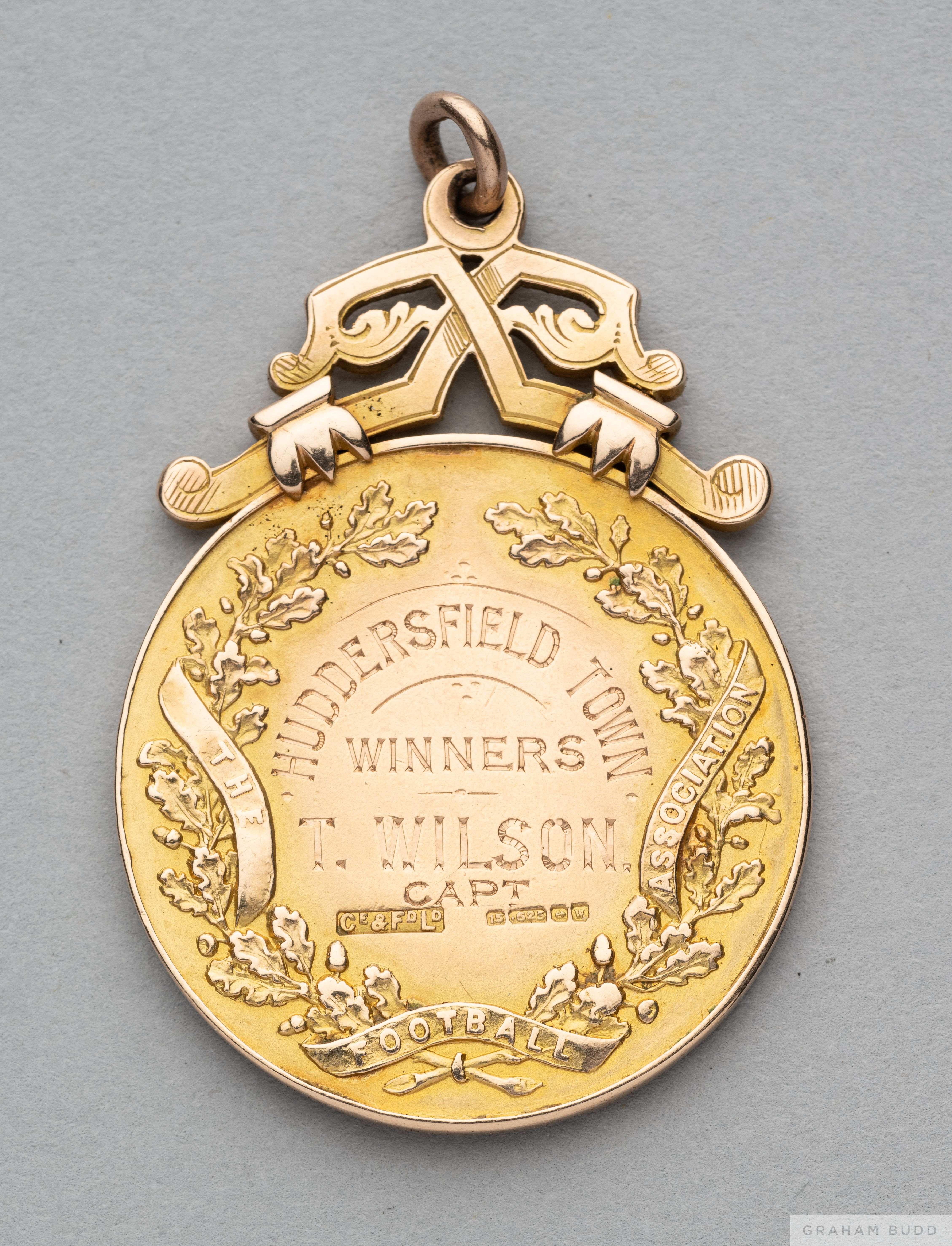 Tom Wilson 15ct gold 1921-22 F.A.Cup Winners medal the obverse inscribed 1922, the reverse inscribed THE FOOTBALL ASSOCIATION, HUDDERSFIELD TOWN, WINNERS, T. WILSON, CAPT, with ring suspension in original fitted case, 18grms In the 1922 F.A.Cup final played on 29th April at Stamford Bridge for the last time, Huddersfield Town defeated Preston North End 1-0, this was the club's first ever major honour. The following lots 902 to 943 relate to the career of Huddersfield Town Legend and England International Tom Wilson. See player bio at foot of description for Lot 902 PROVENANCE: Tom Wilson thence by family descent