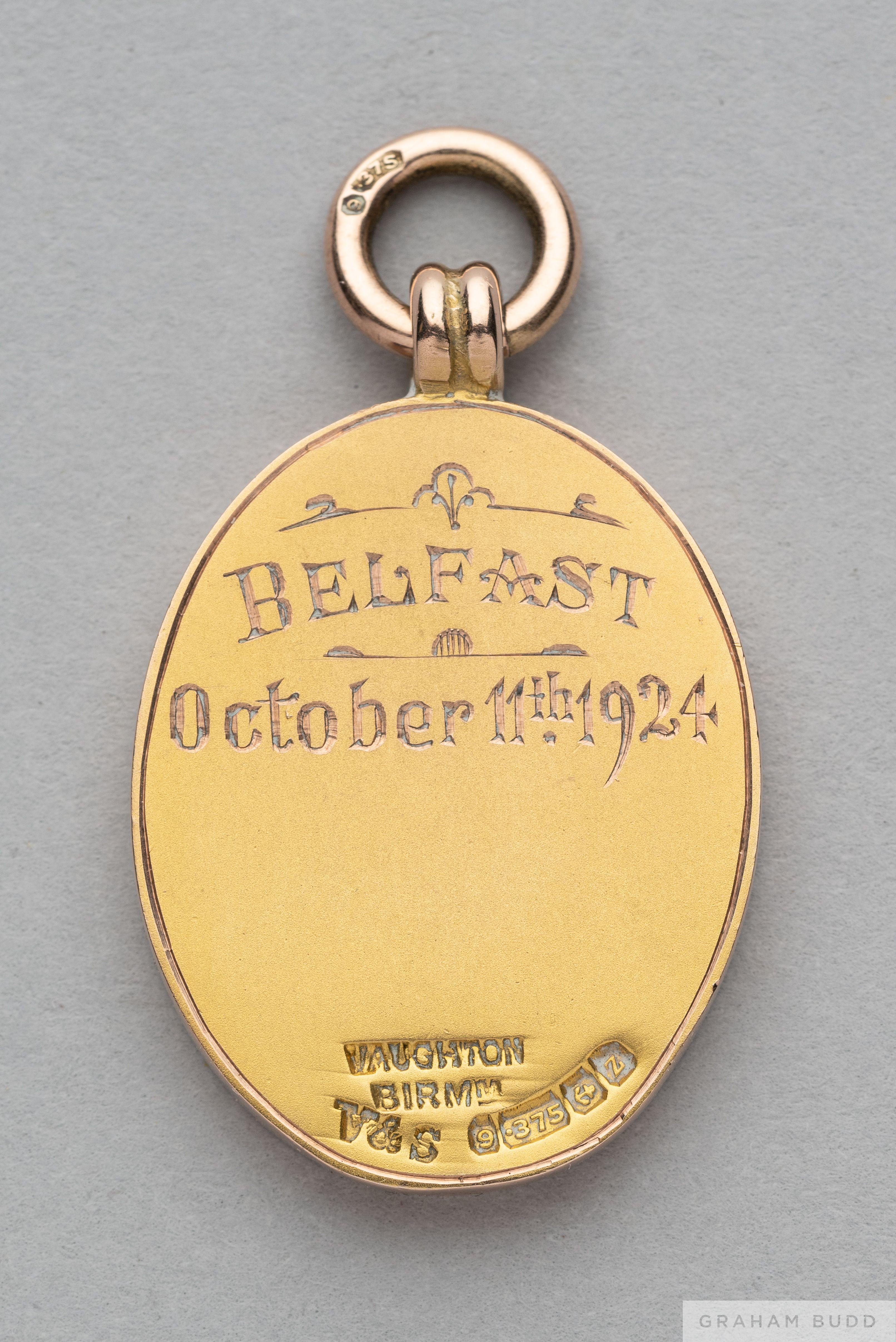 Tom Wilson 9ct gold 1924 Football League Representative Medal the obverse inscribed THE FOOTBALL LEAGUE ENGLAND V IRELAND, the reverse inscribed BELFAST, October 11th 1924, with ring suspension in original fitted case, 17grms In the match played on 11th October 1924 at Solitude, Belfast, The Football League defeated the Irish League 5-0 The following lots 902 to 943 relate to the career of Huddersfield Town Legend and England International Tom Wilson. See player bio at foot of description for Lot 902 PROVENANCE: Tom Wilson thence by family descent
