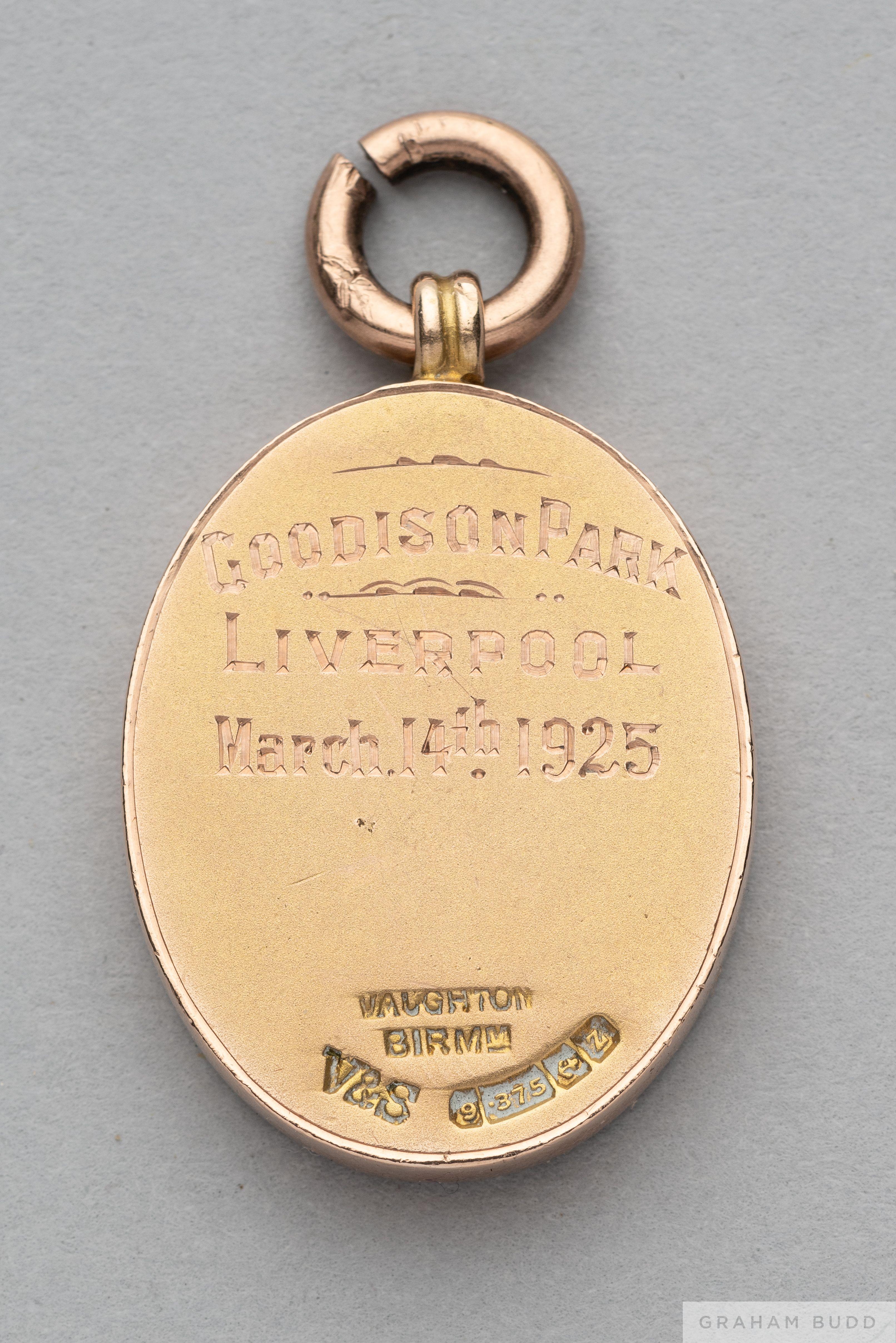 Tom Wilson 9ct gold 1925 Football League Representative Medal the obverse inscribed THE FOOTBALL LEAGUE ENGLAND V SCOTLAND, the reverse inscribed GOODISON PARK, LIVERPOOL, March 14th 1925, with ring suspension in original fitted case, 21grms The following lots 902 to 943 relate to the career of Huddersfield Town Legend and England International Tom Wilson. See player bio at foot of description for Lot 902 PROVENANCE: Tom Wilson thence by family descent