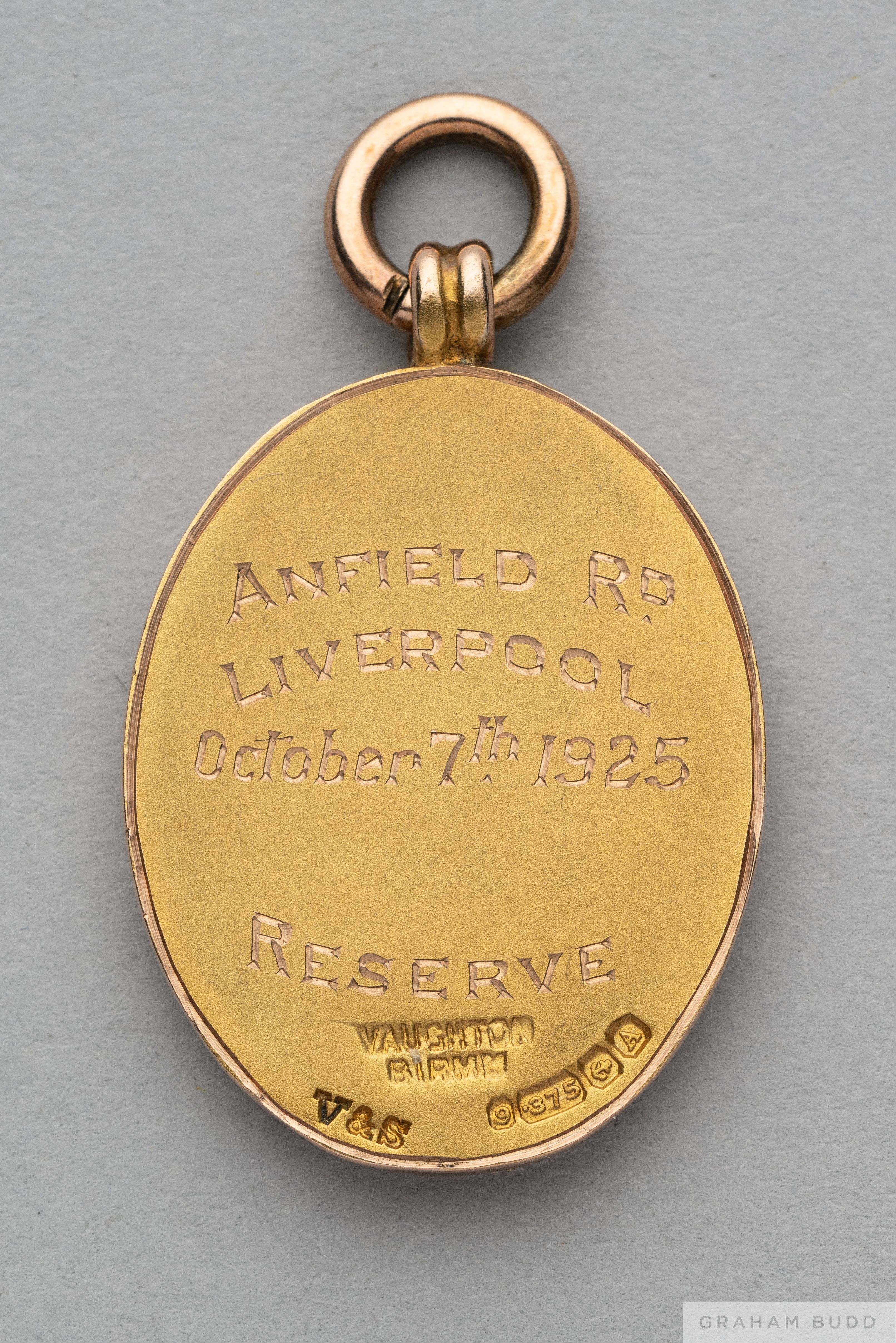Tom Wilson 9ct gold 1925 Football League Representative Medal the obverse inscribed THE FOOTBALL LEAGUE ENGLAND V IRELAND, the reverse inscribed ANFIELD Rd, LIVERPOOL, October 7th 1925, RESERVE, with ring suspension in original fitted case, 19grms In the match played on 7th October 1925 at Anfield, The Football League defeated the Irish League 5-1 The following lots 902 to 943 relate to the career of Huddersfield Town Legend and England International Tom Wilson. See player bio at foot of description for Lot 902 PROVENANCE: Tom Wilson thence by family descent