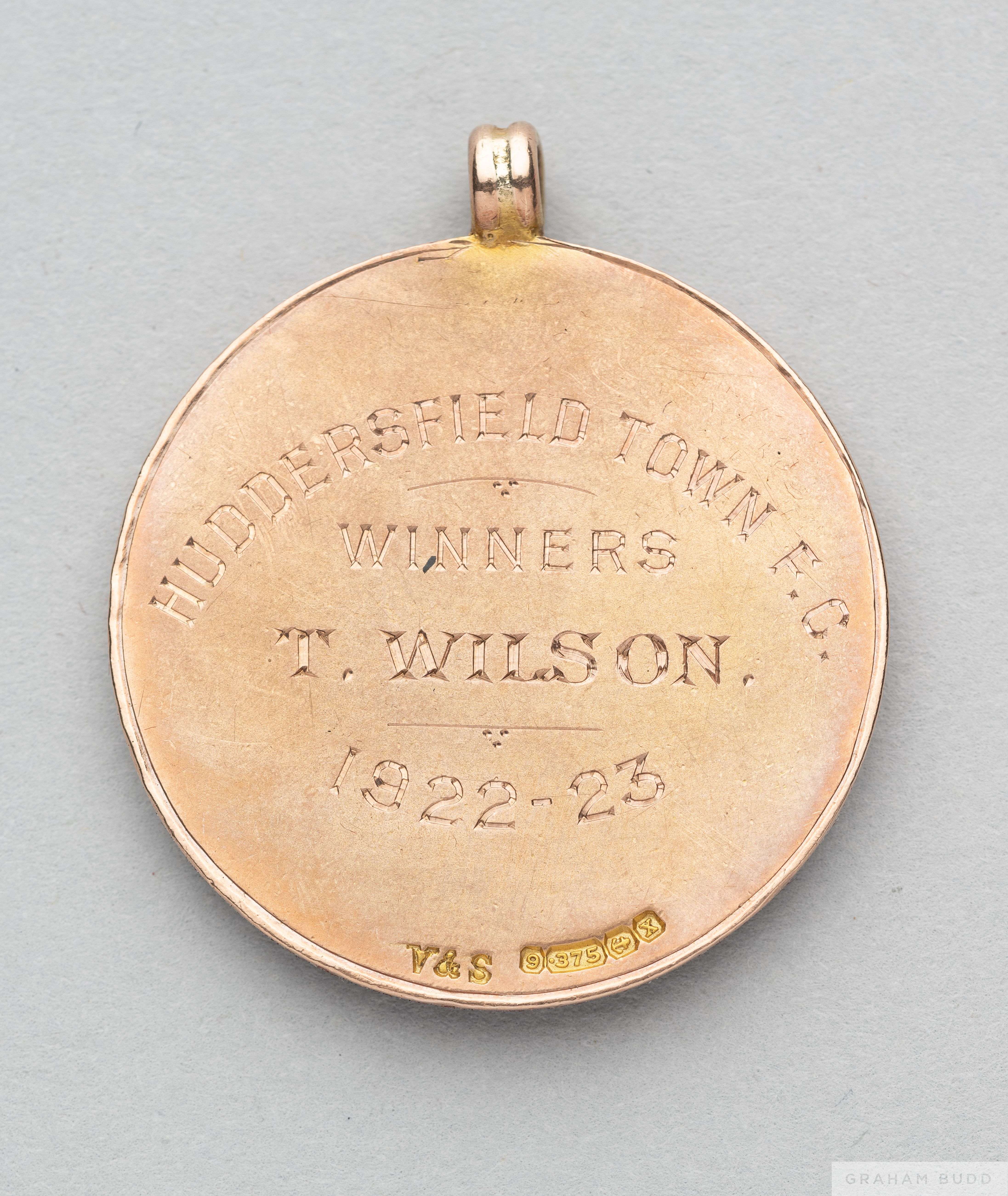 Tom Wilson 9ct gold and enamel 1922-23 Norfolk and Norwich Hospital Cup medal the obverse inscribed NORFOLK AND NORWICH HOSPITAL CUP, the reverse inscribed HUDDERSFIELD TOWN F.C., WINNERS, T. WILSON, 1922-23, in original fitted case, 19grms The following lots 902 to 943 relate to the career of Huddersfield Town Legend and England International Tom Wilson. See player bio at foot of description for Lot 902 PROVENANCE: Tom Wilson thence by family descent